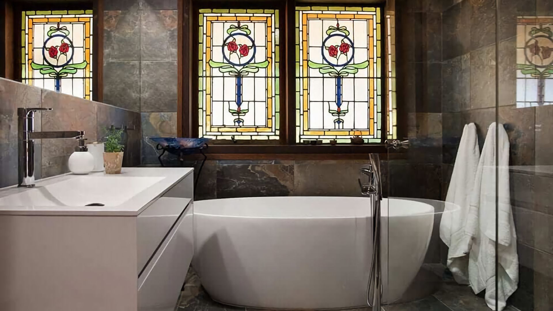 The main house includes four bedrooms, three located on the upper floor, while the spacious entertainer's kitchen on the ground floor adds a touch of rustic charm. Well-equipped with essential amenities, the kitchen serves as a welcoming space for cooking and socialising. Guests can also enjoy the open-plan living and dining area, which is tastefully decorated to encourage relaxation and shared moments. Rich wooden accents throughout the property, along with stone and tile elements in the bathrooms, create an elegant atmosphere, while stained glass windows allow natural light to enhance the space.