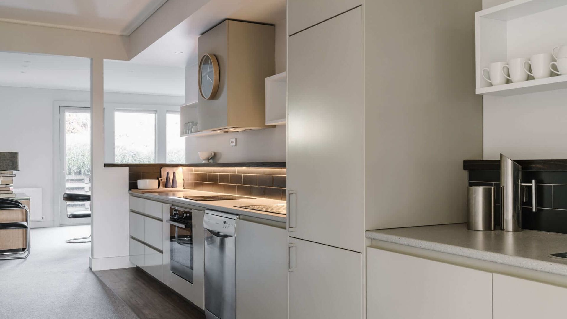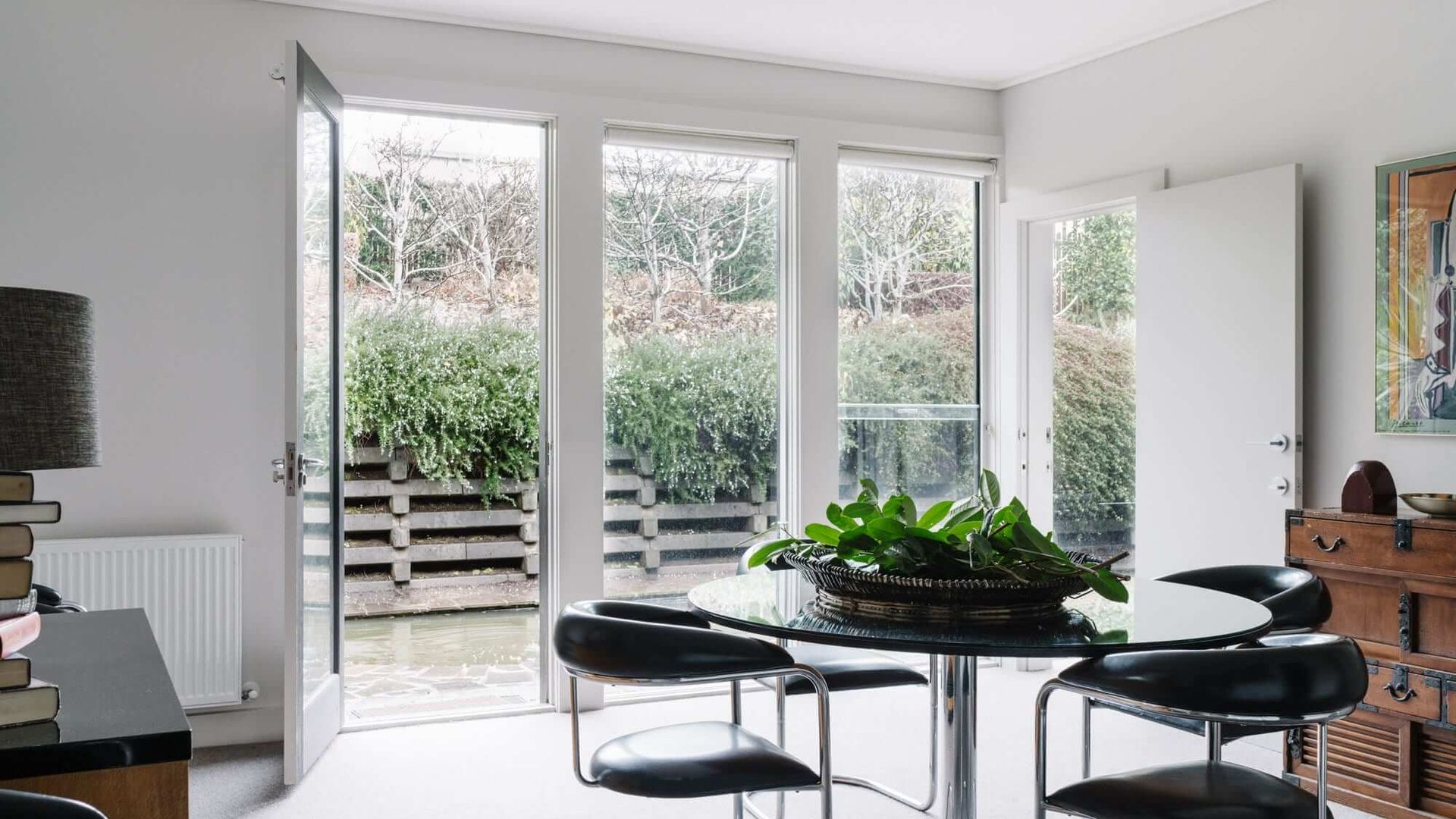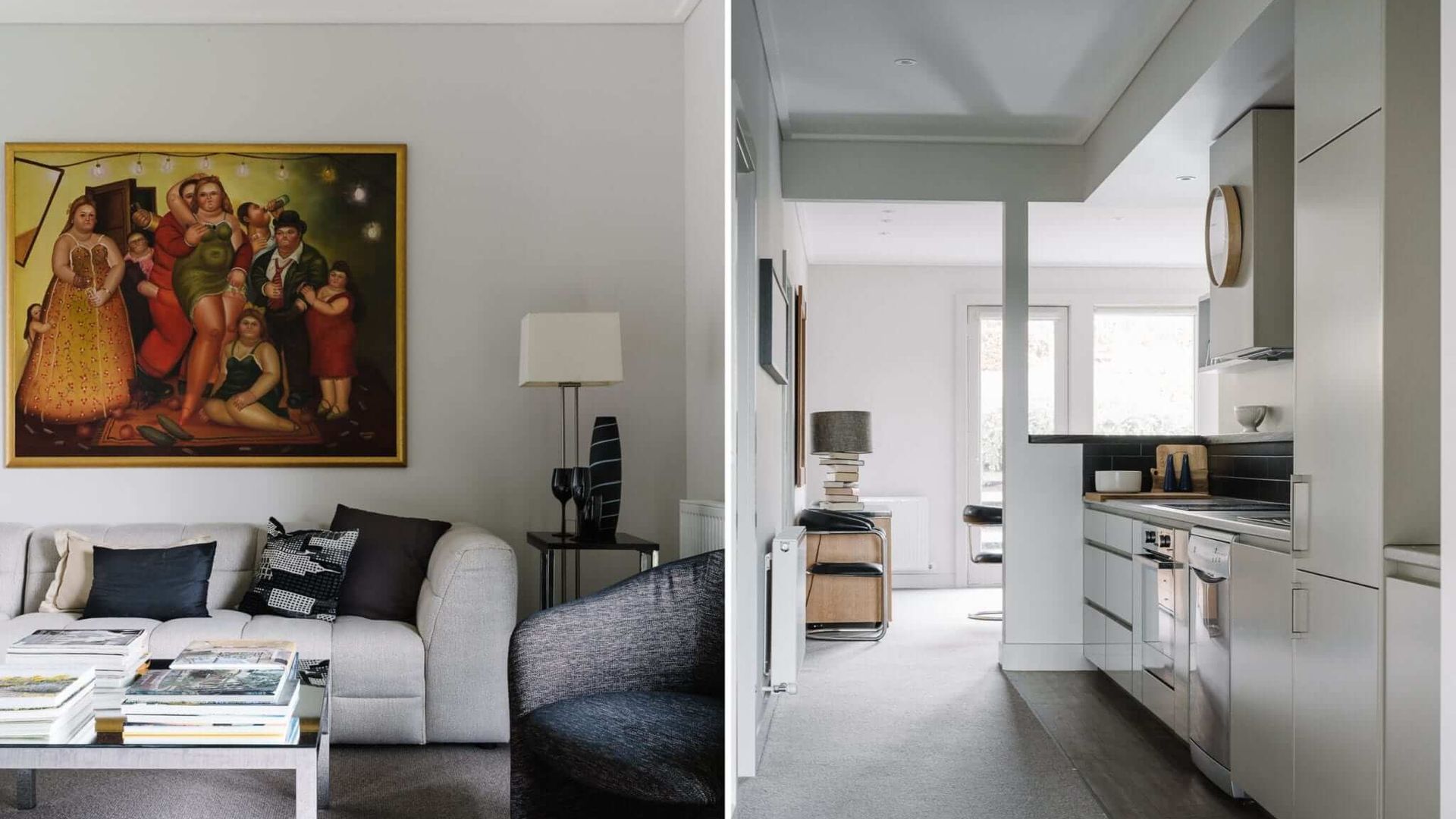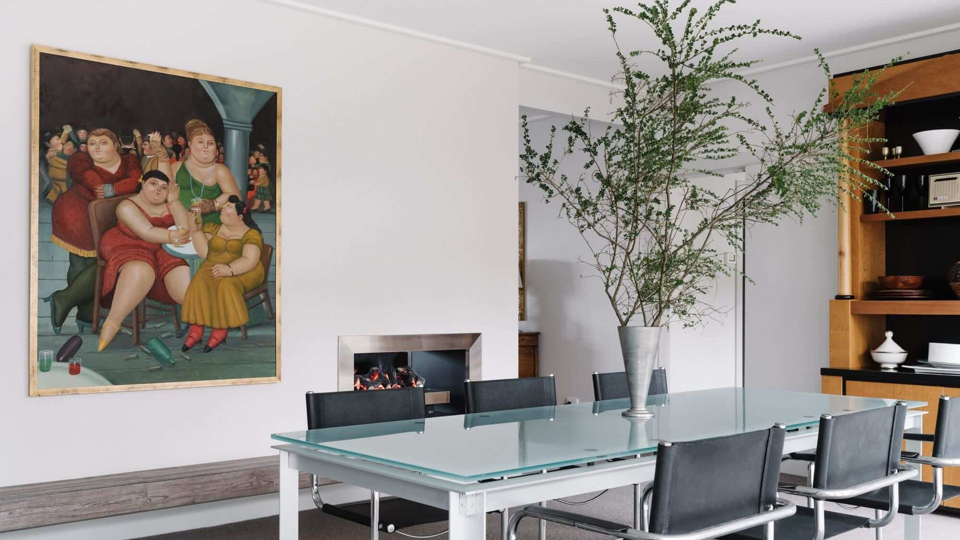 The adjoining dining area enjoys warmth from the same double-sided fireplace as the lounge. This room features an elegant glass table, and yet more beautiful artworks. Natural light filters in through large windows, both in the dining and living rooms. The sparkling clean kitchens come equipped with all the necessary appliances and are just as stylish as the rest of the home with sleek countertops and black tile splash-backs. There is a further Sitting Room with large screen television and a breakfast area.