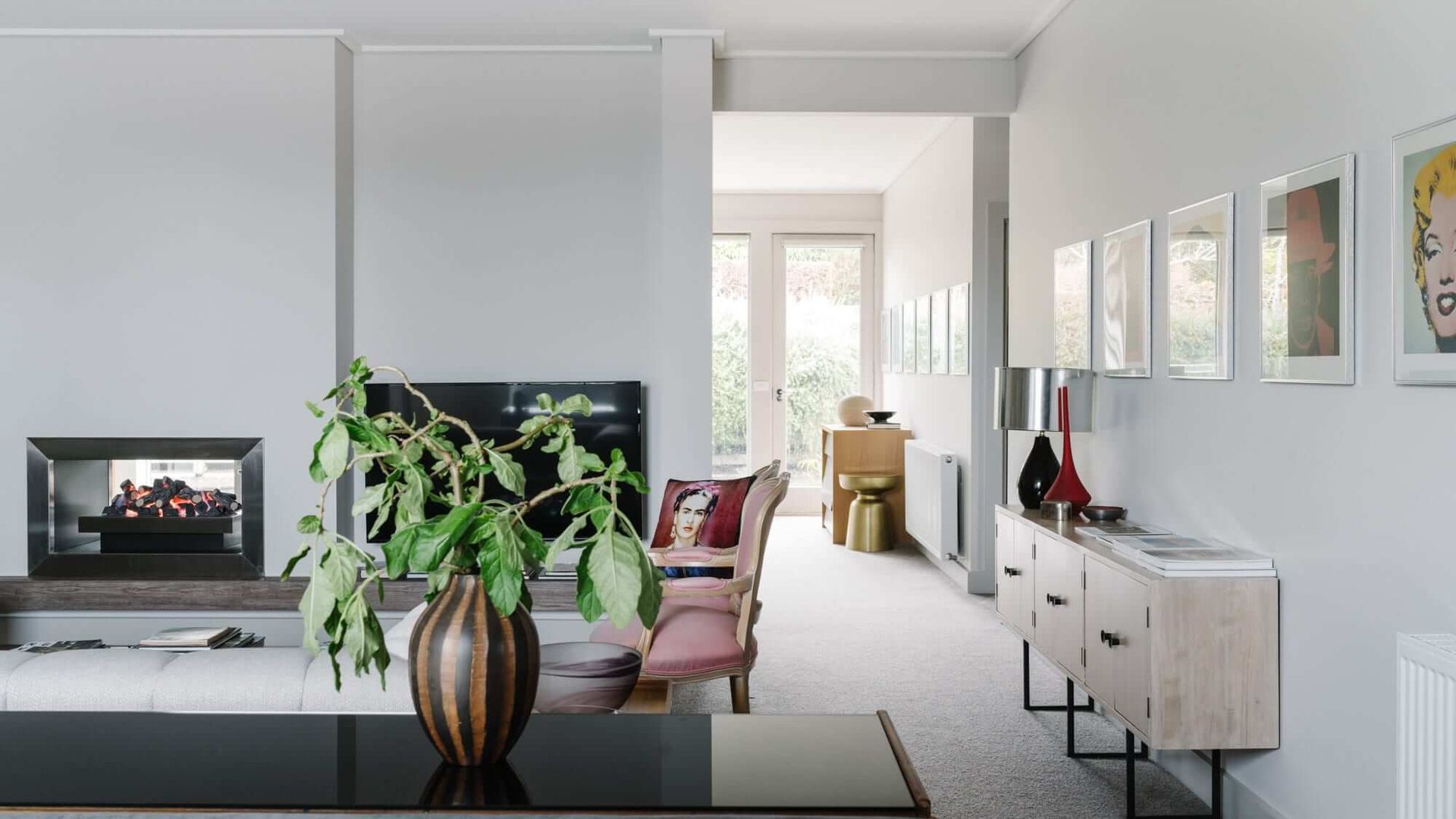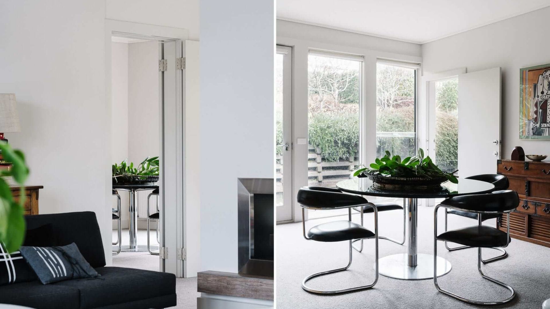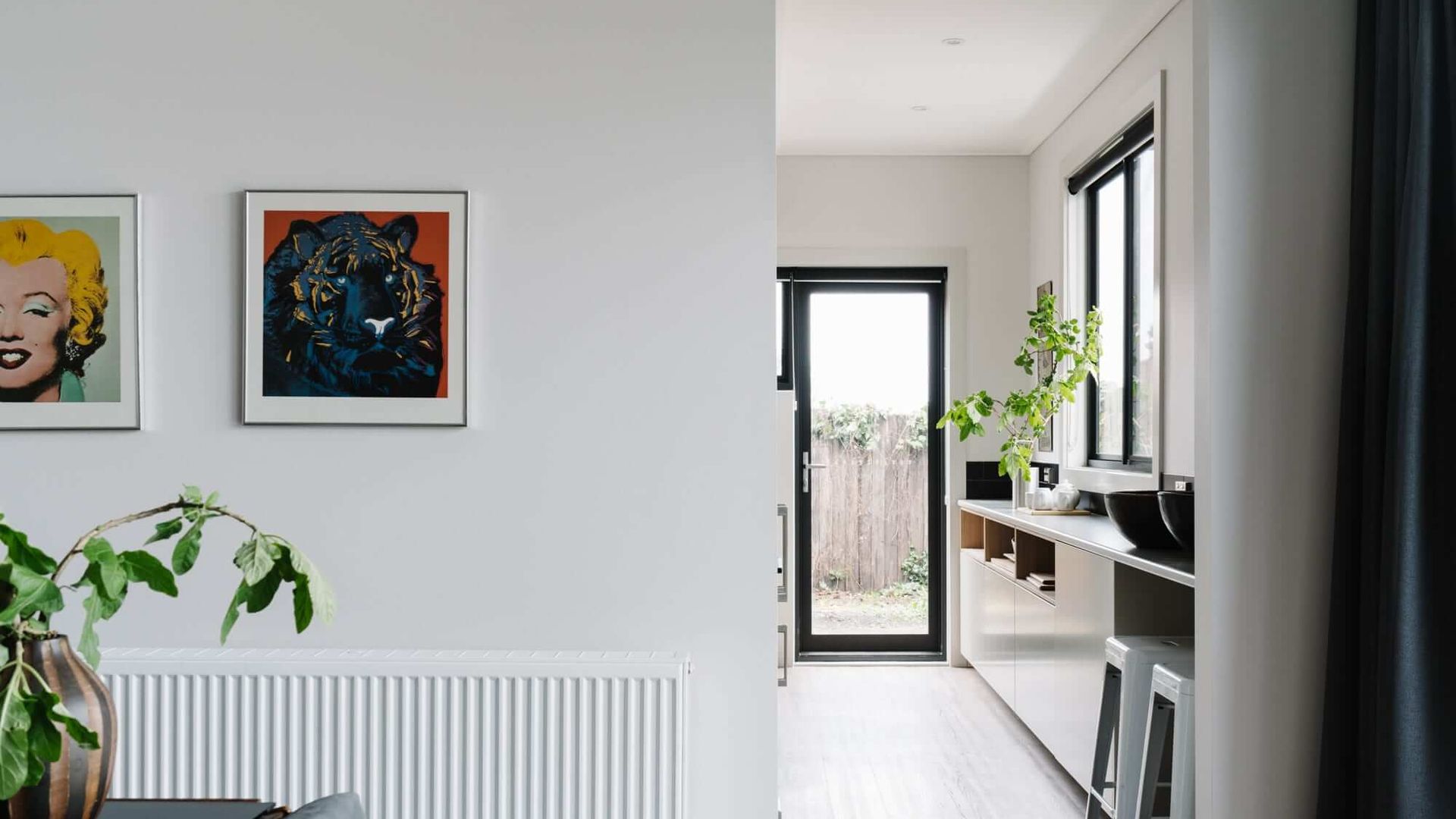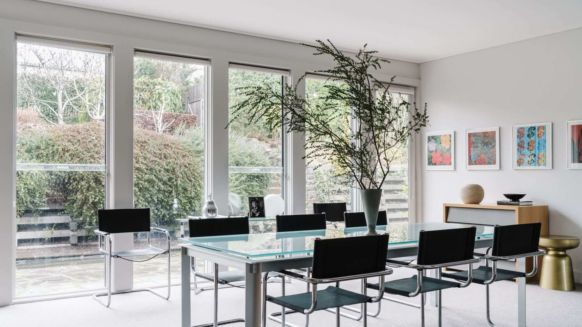 Cousin Gilbert's interior spaces are a cut above what can be expected of even the nicest country getaway. The home enjoys a unified design aesthetic, with dark furnishings providing a beautiful contrast against crisp white walls and luxurious carpet. Uniquely, it boasts two Kitchens and multiple Living and Dining areas. In the lounge, chic seating arrangements and a gas-log fireplace make for a cosy but sophisticated atmosphere. Iconic images from pop culture grace the walls in the form of paintings and prints, striking yet unobtrusive.