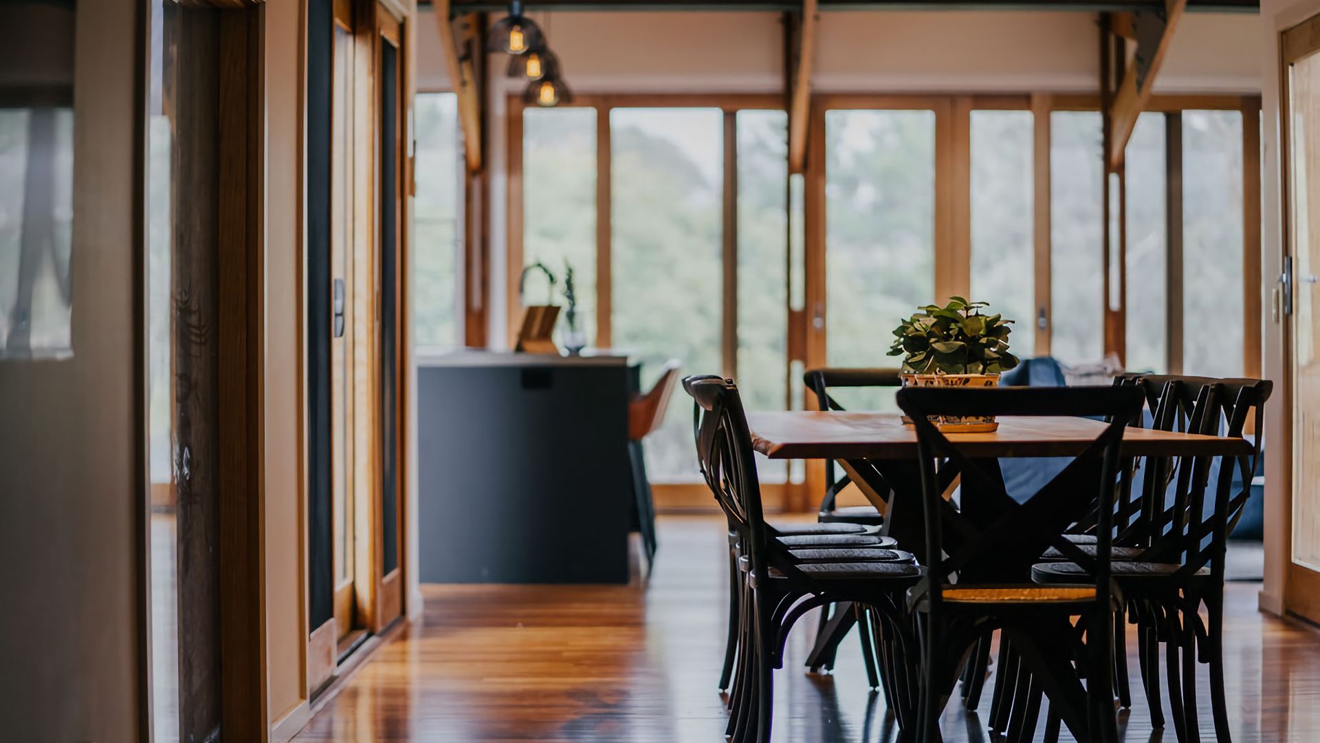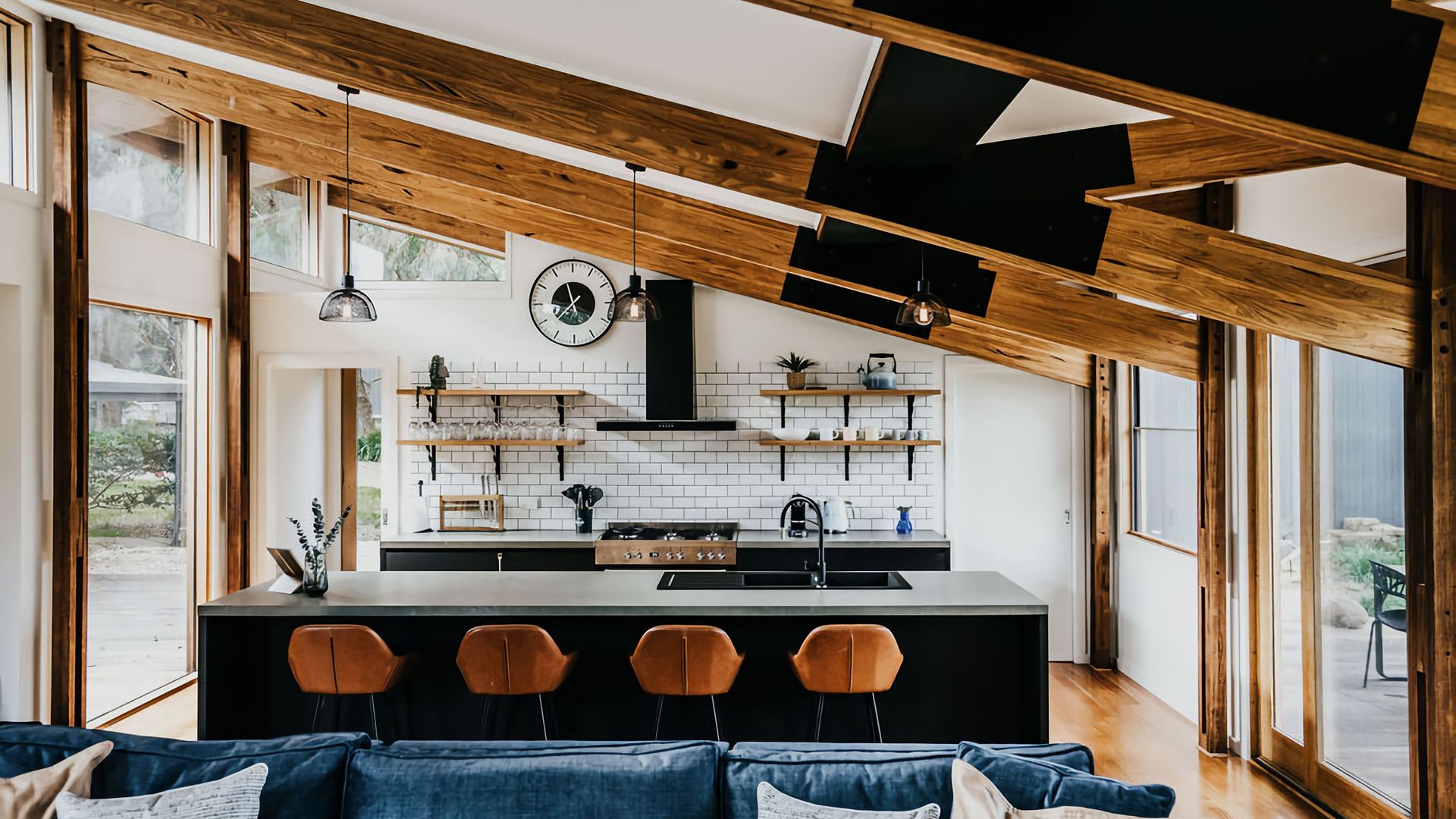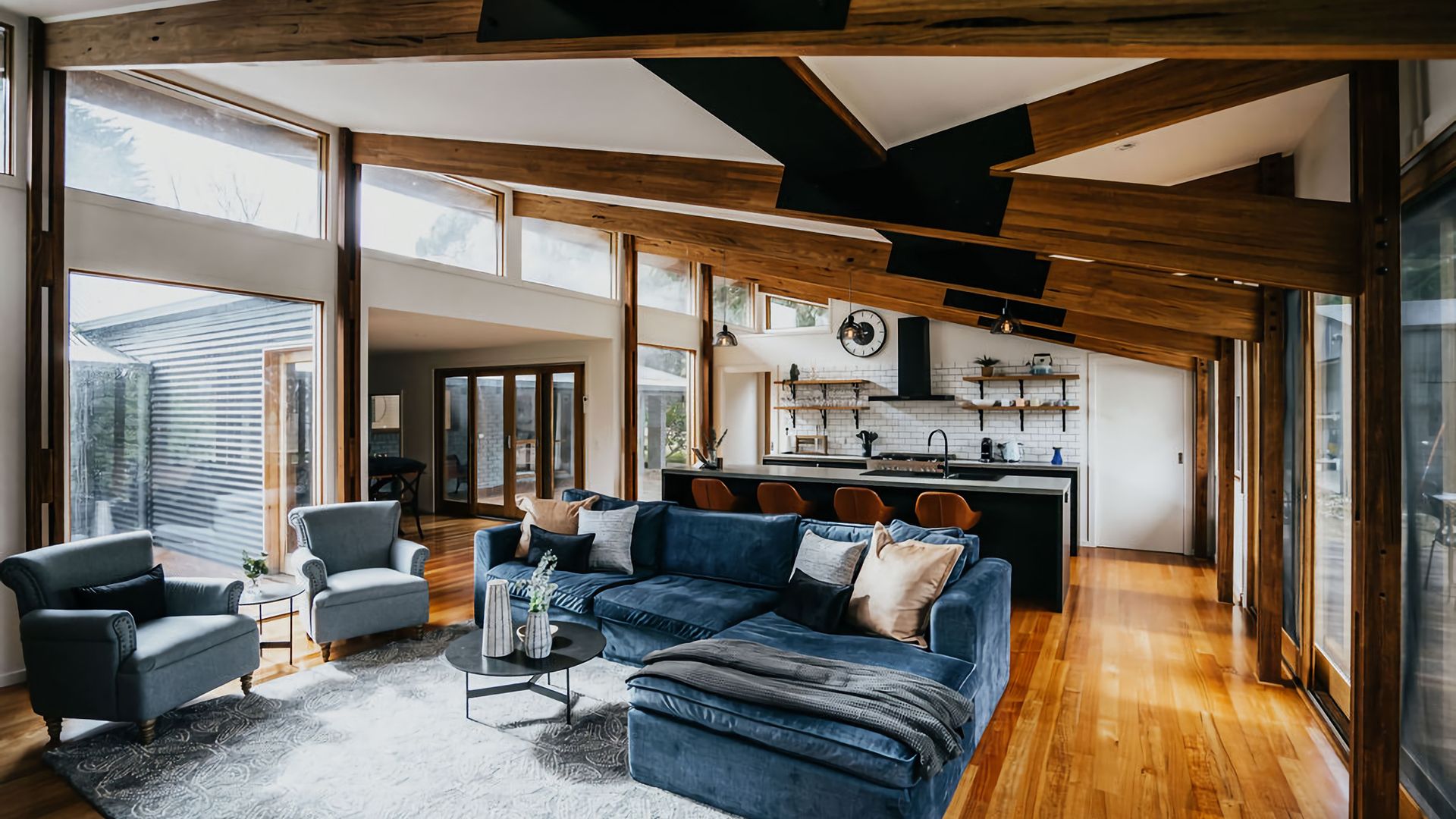 The exposed beams of the high vaulted ceilings give the living space an open, airy feel. High windows fill the space with incredible light and give you a great view of the surrounding gardens. The space is decorated with black accents against deep wood grain and crisp white walls, blending a rustic vibe with a contemporary twist. A large dining table and island bench seating make this the perfect place for entertaining or all coming together for a meal.
