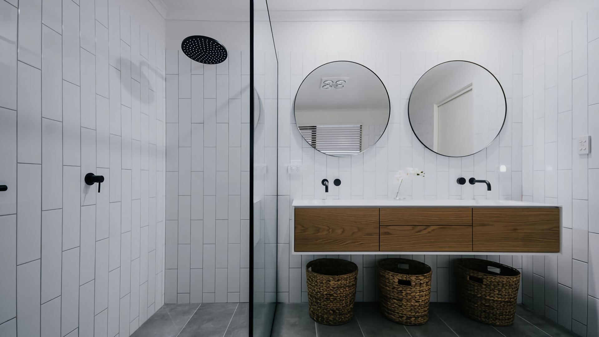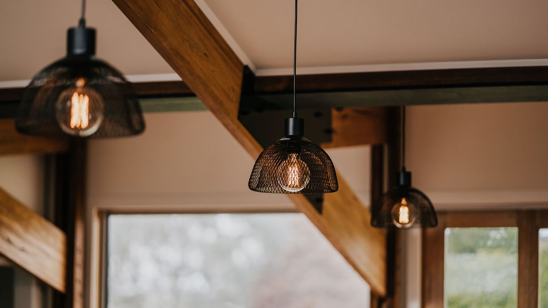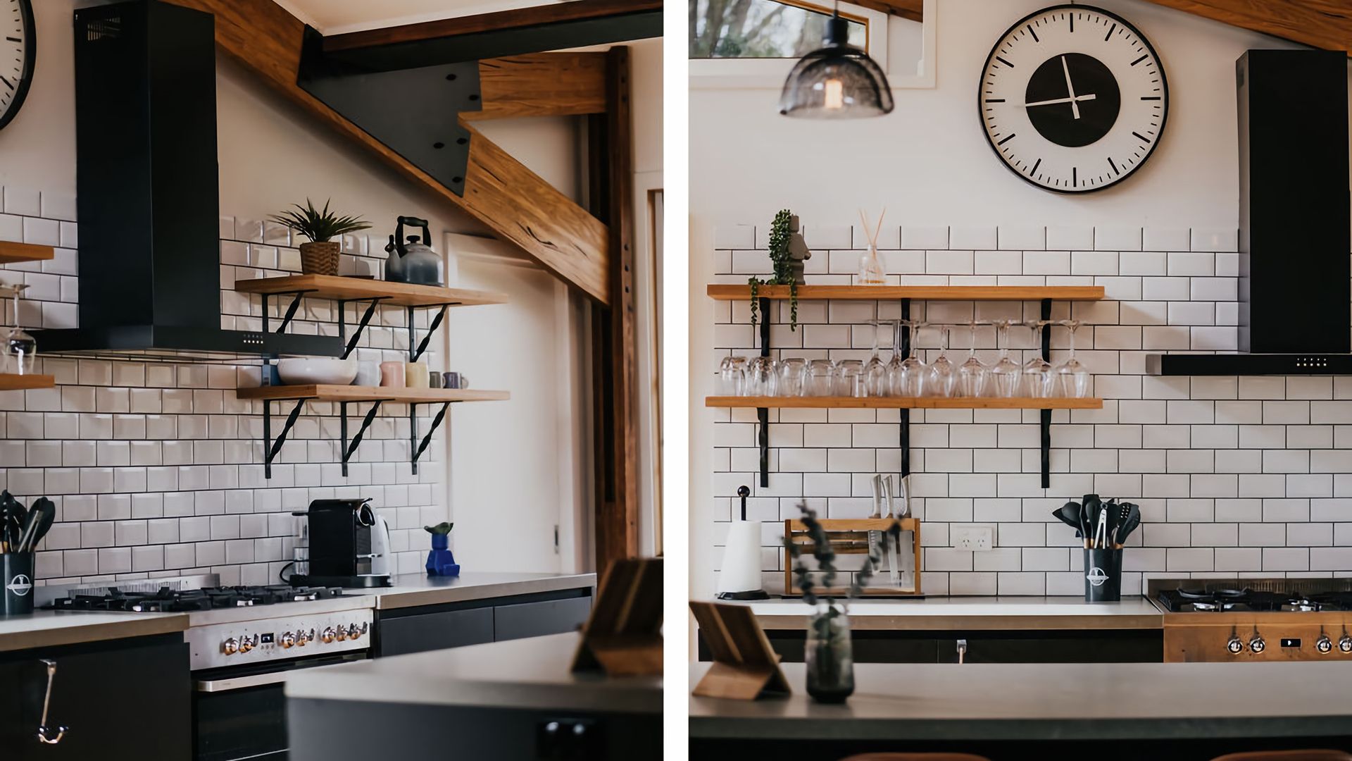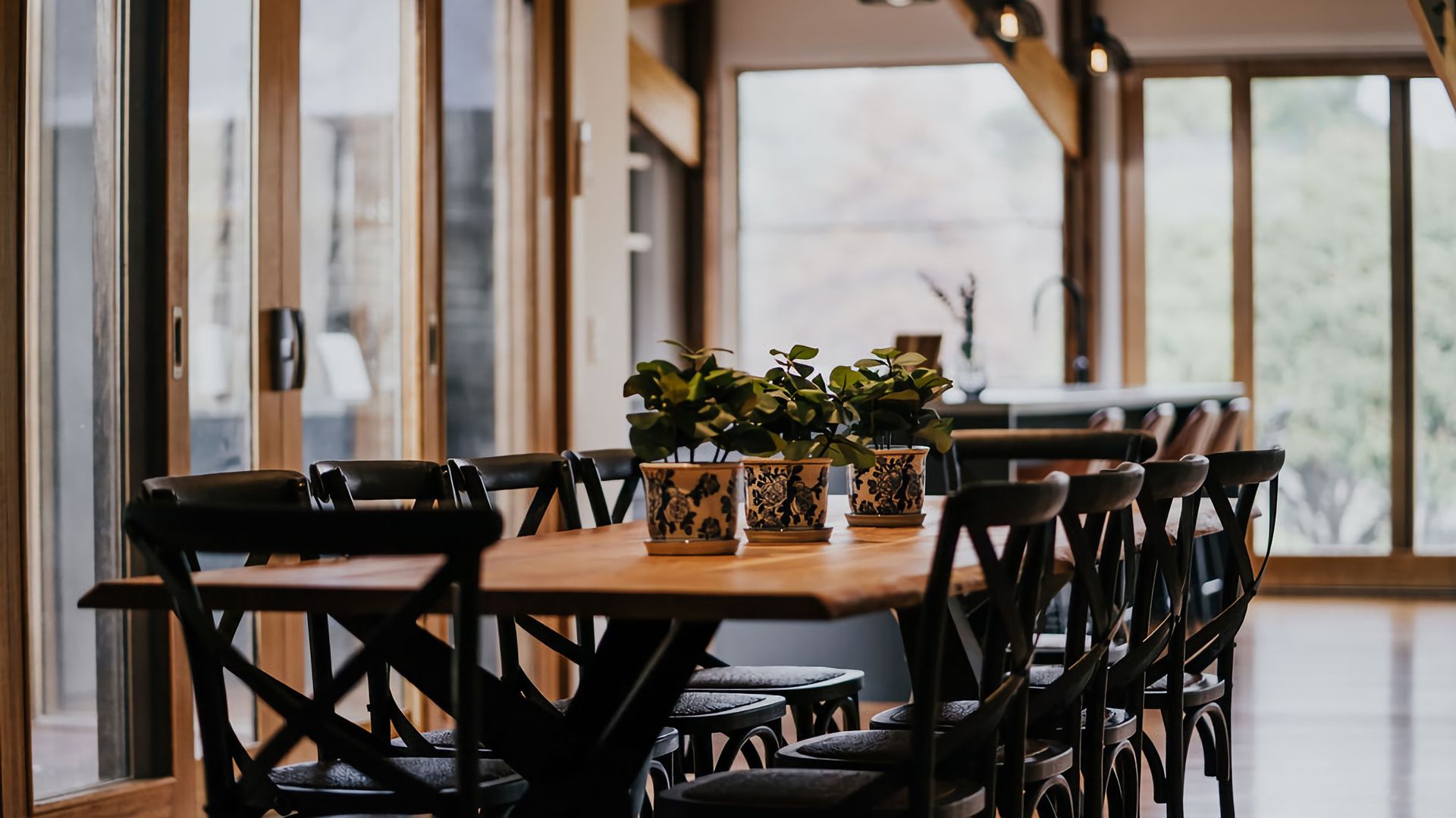 The exposed beams of the high vaulted ceilings give the living space an open, airy feel. High windows fill the space with incredible light and give you a great view of the surrounding gardens. The space is decorated with black accents against deep wood grain and crisp white walls, blending a rustic vibe with a contemporary twist. A large dining table and island bench seating make this the perfect place for entertaining or all coming together for a meal.