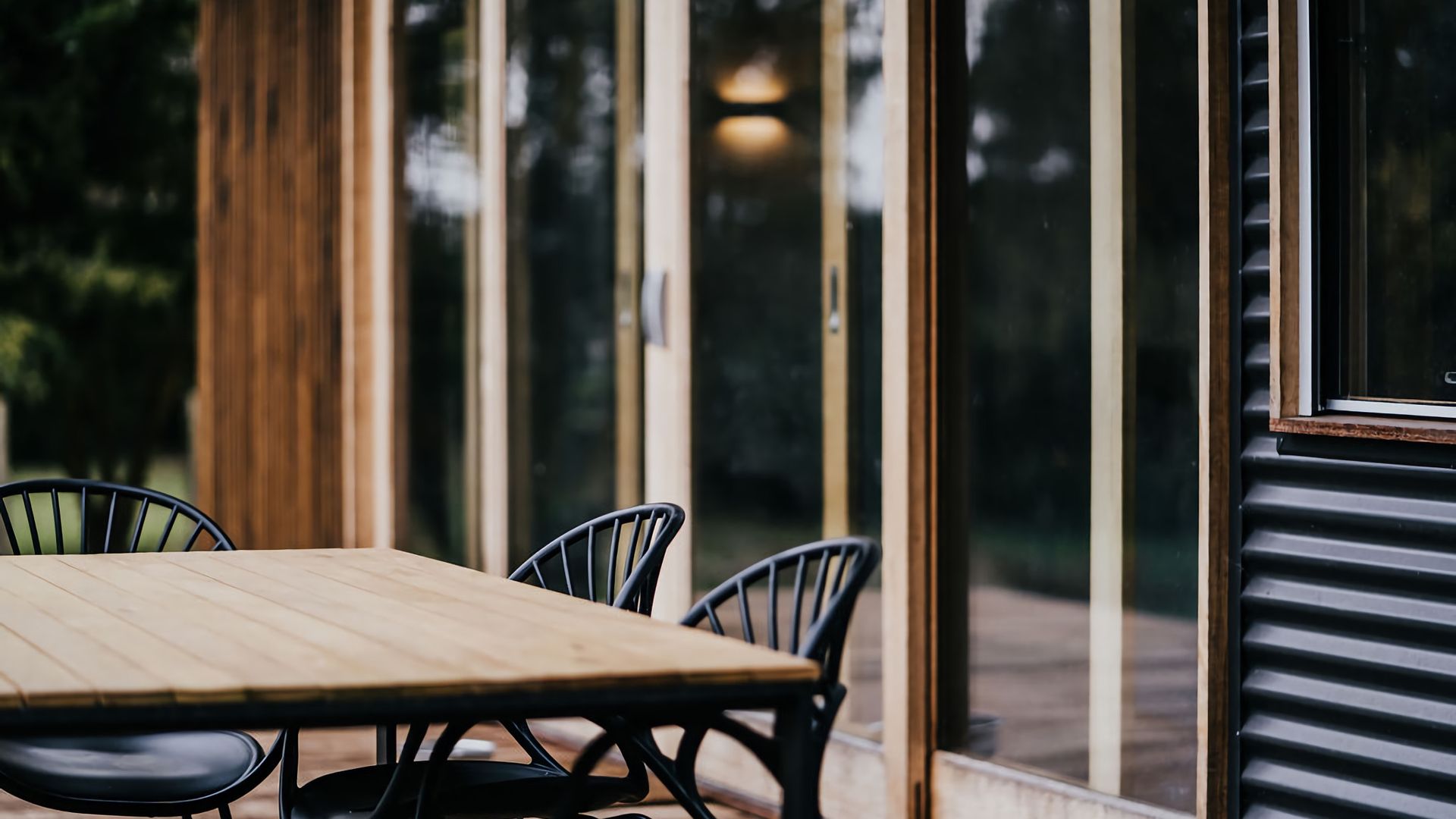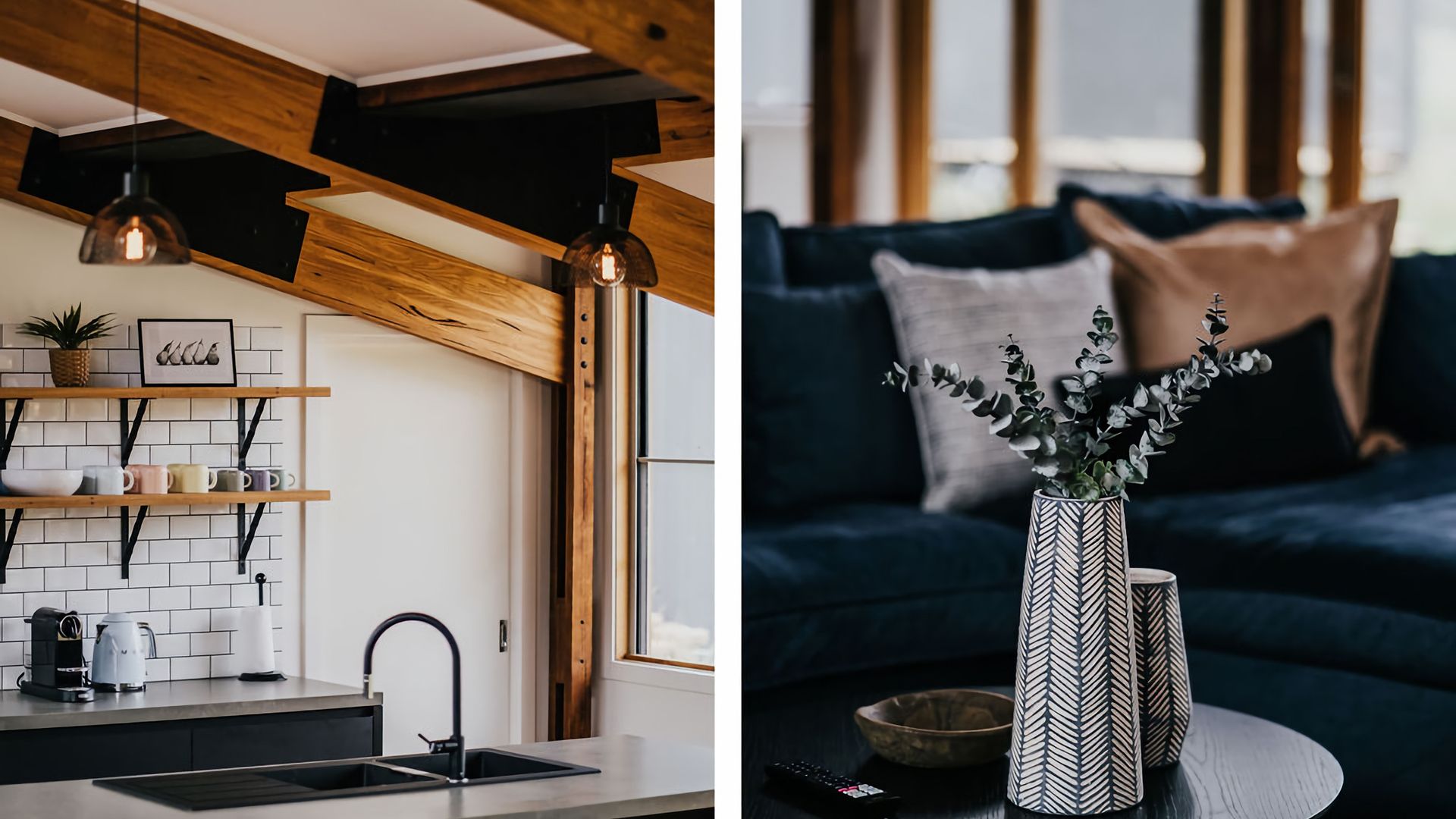 This rustic, architecturally designed home features a corrugated iron and wood beam exterior, portraying a striking statement among the lush, tree-filled grounds. Accommodating up to 10 guests, this is a great space for getting a group of friends together.