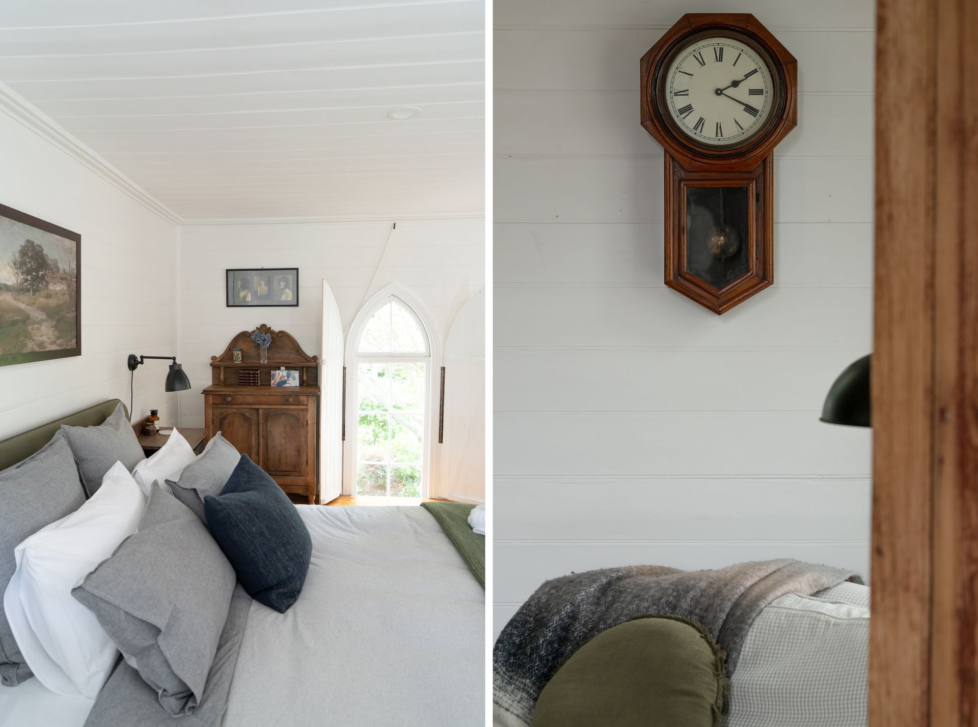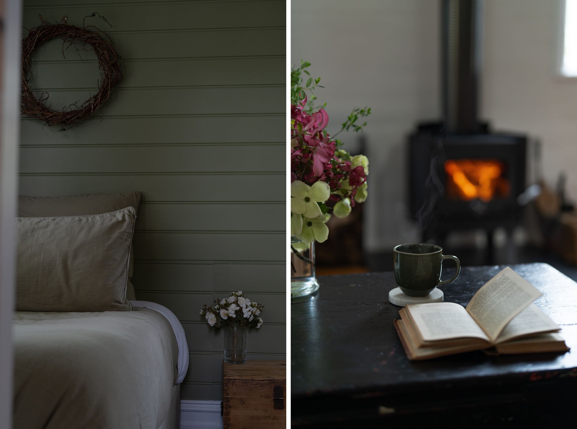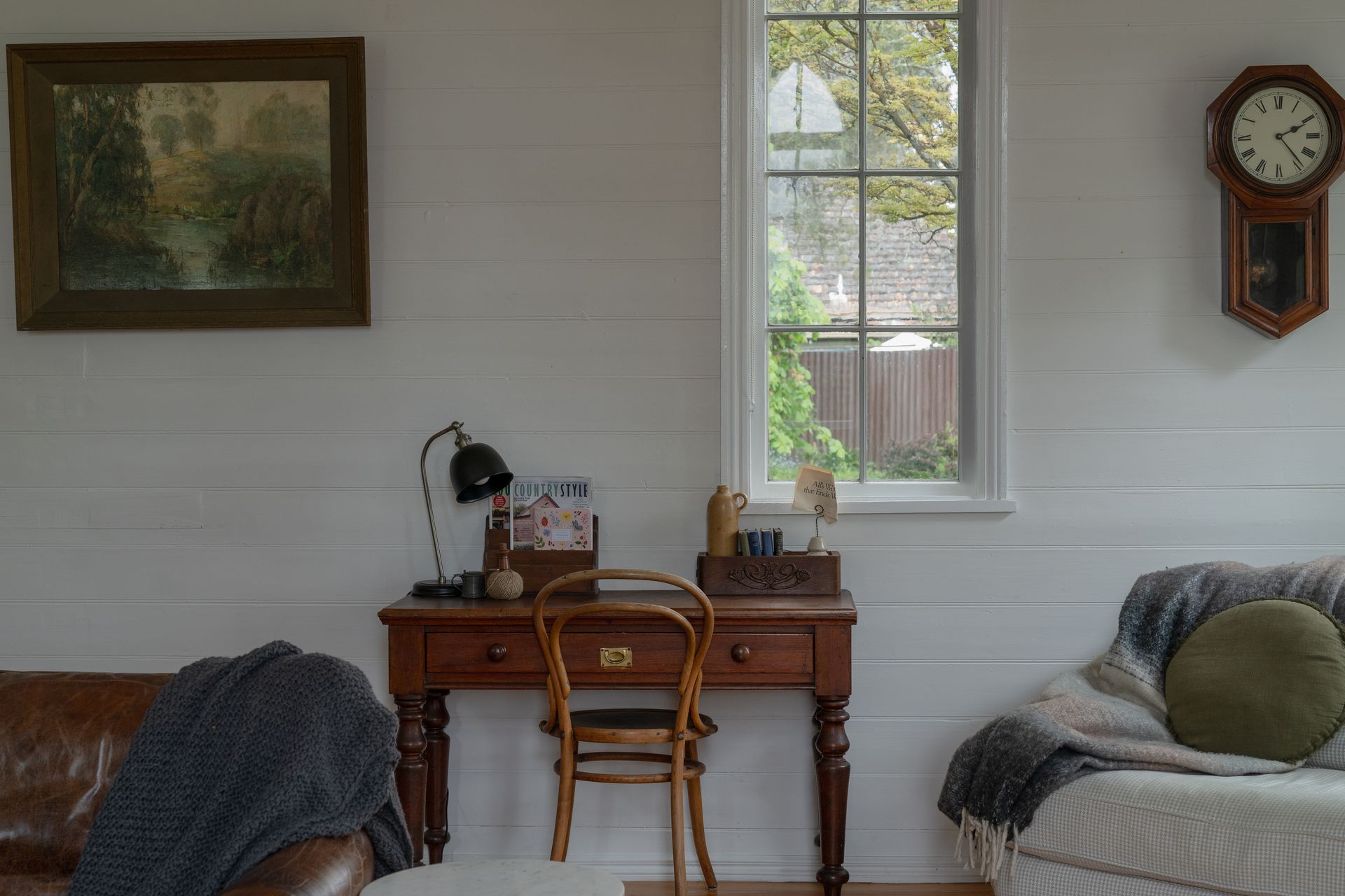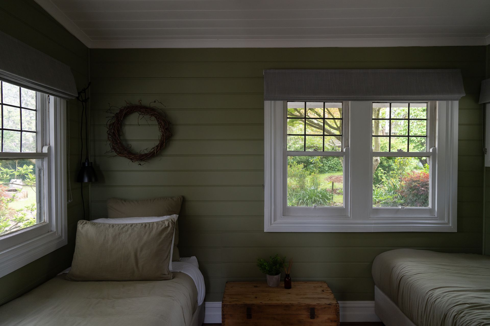 Inside, soaring panelled ceilings, original timber windows, and crisp white walls set the tone. Find your perfect cozy escape, no matter the season. Sink into the oversized armchair with a good book or unwind by the crackling fire from the comfort of the leather lounge suite. The loft-style master bedroom overlooks the lounge, providing a peaceful sanctuary with serene garden views. . Downstairs, a second bedroom features two singles in a striking, verdant green—inviting relaxation and calm.