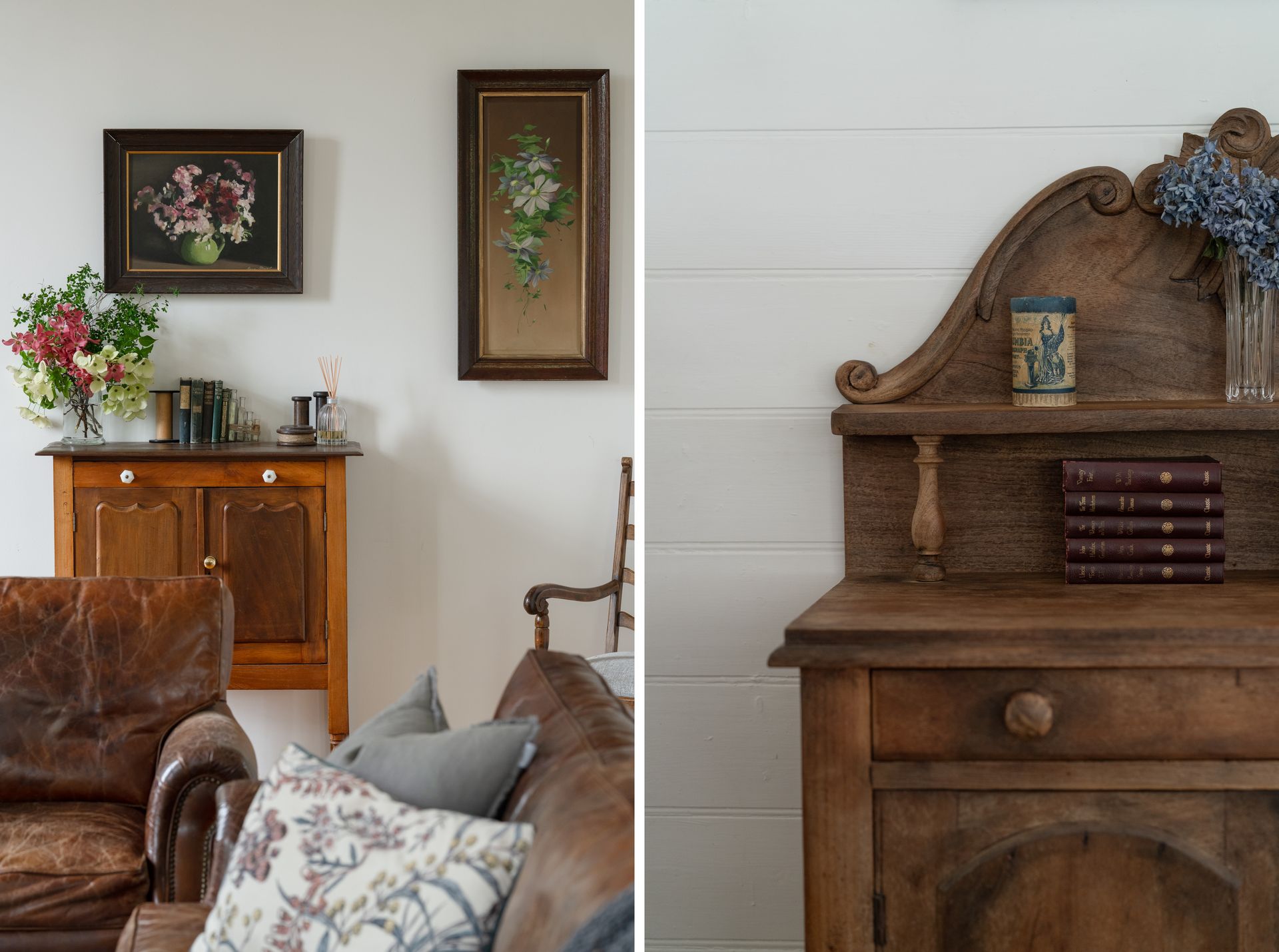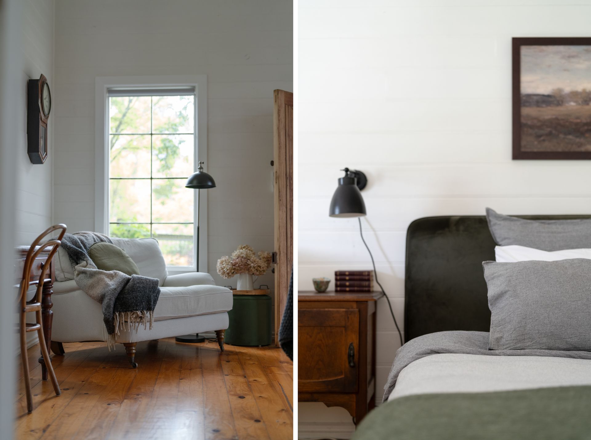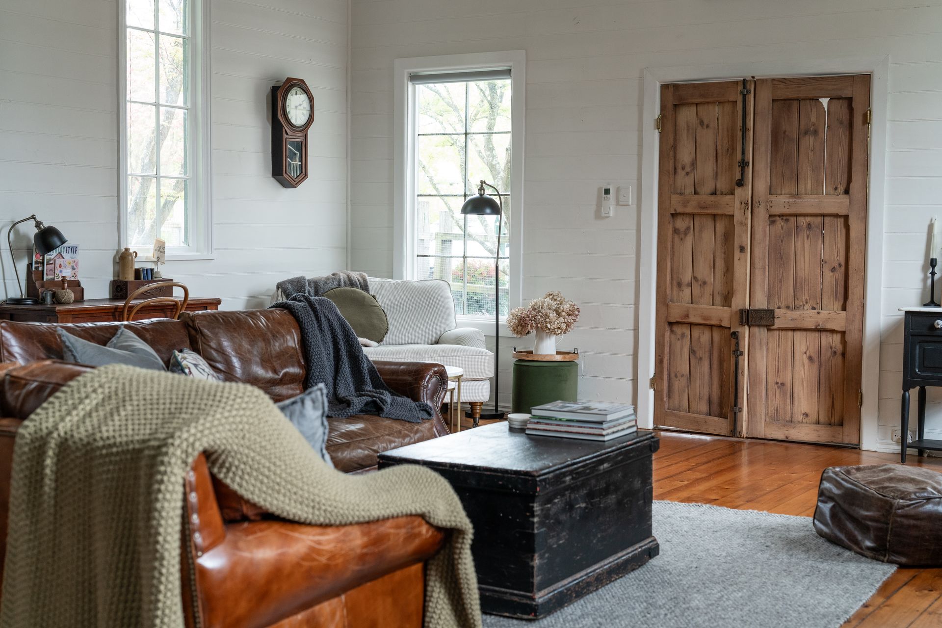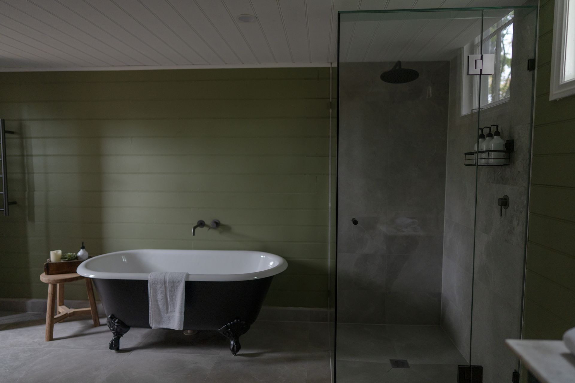 Inside, soaring panelled ceilings, original timber windows, and crisp white walls set the tone. Find your perfect cozy escape, no matter the season. Sink into the oversized armchair with a good book or unwind by the crackling fire from the comfort of the leather lounge suite. The loft-style master bedroom overlooks the lounge, providing a peaceful sanctuary with serene garden views. . Downstairs, a second bedroom features two singles in a striking, verdant green—inviting relaxation and calm.