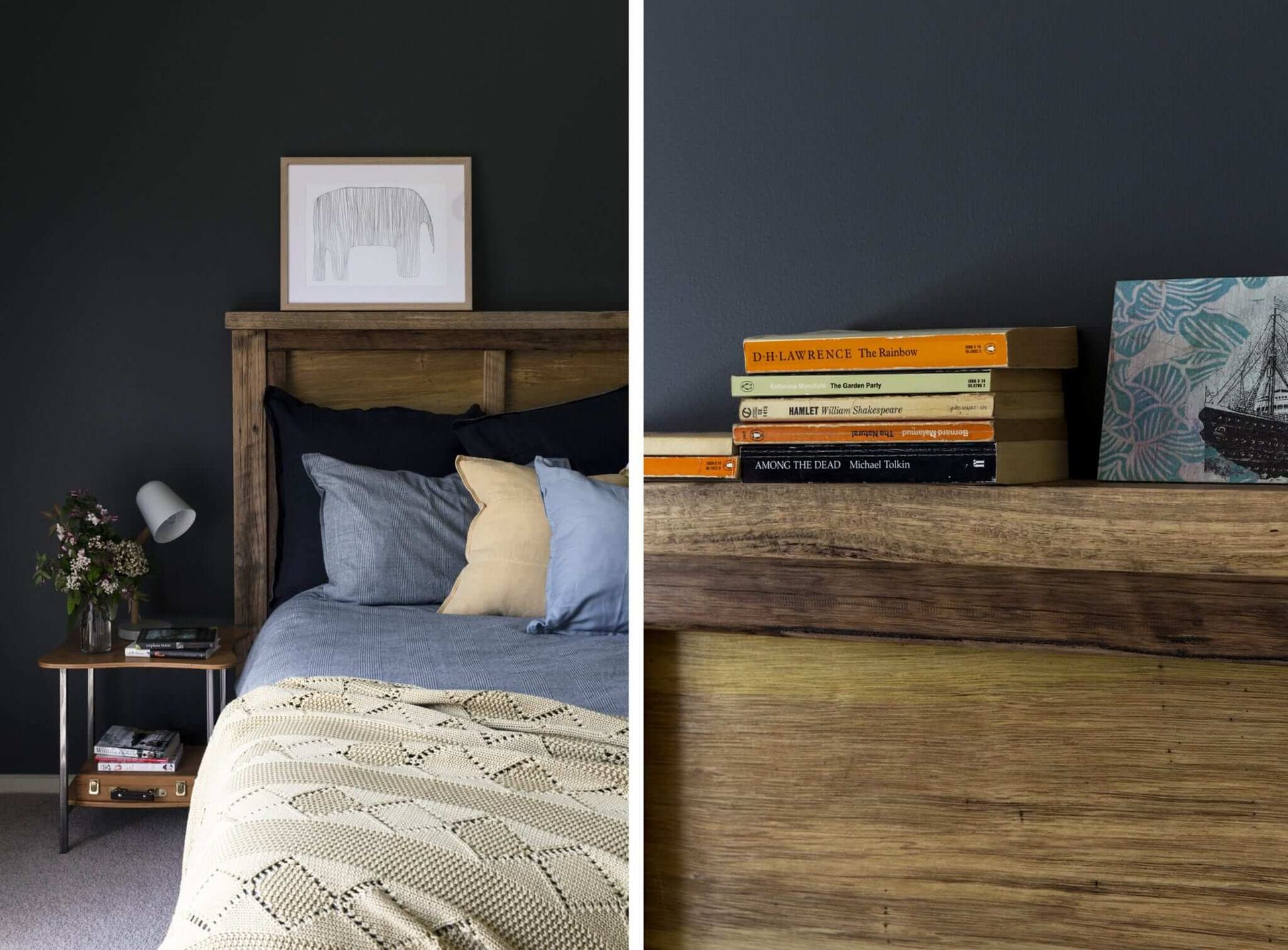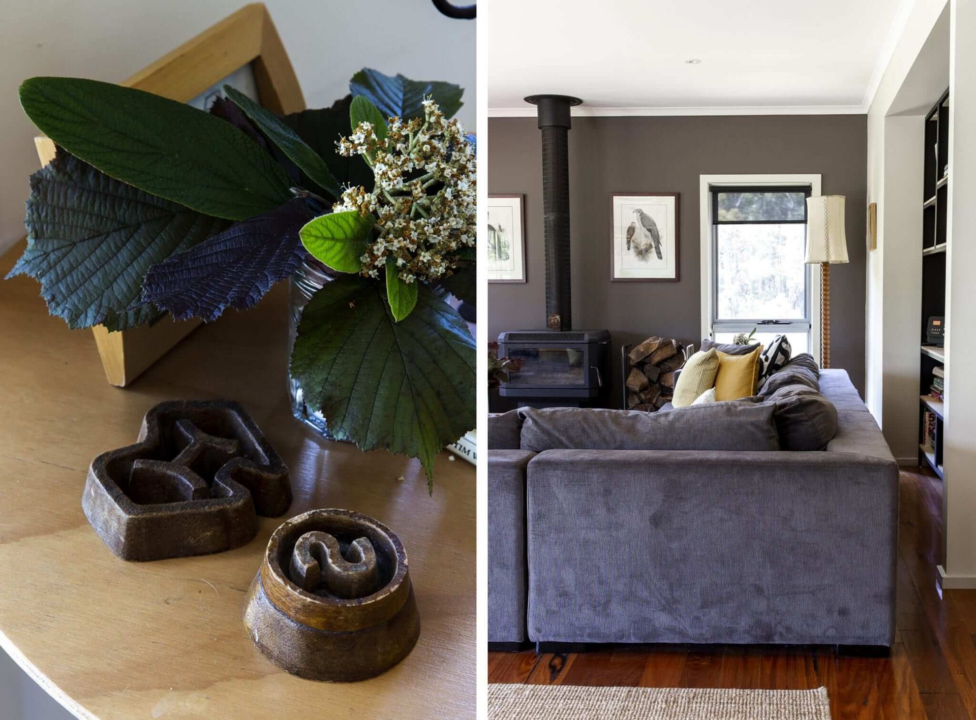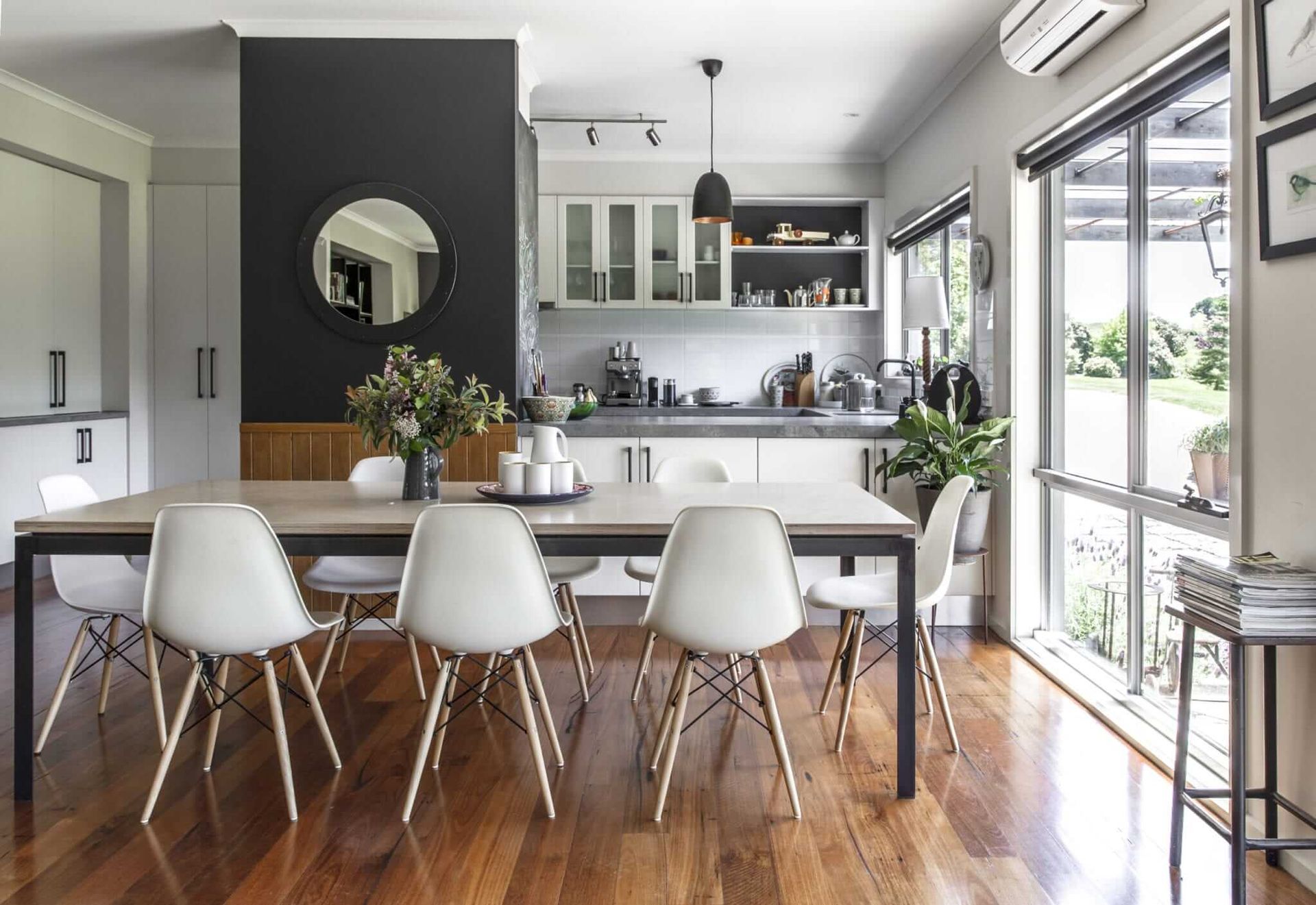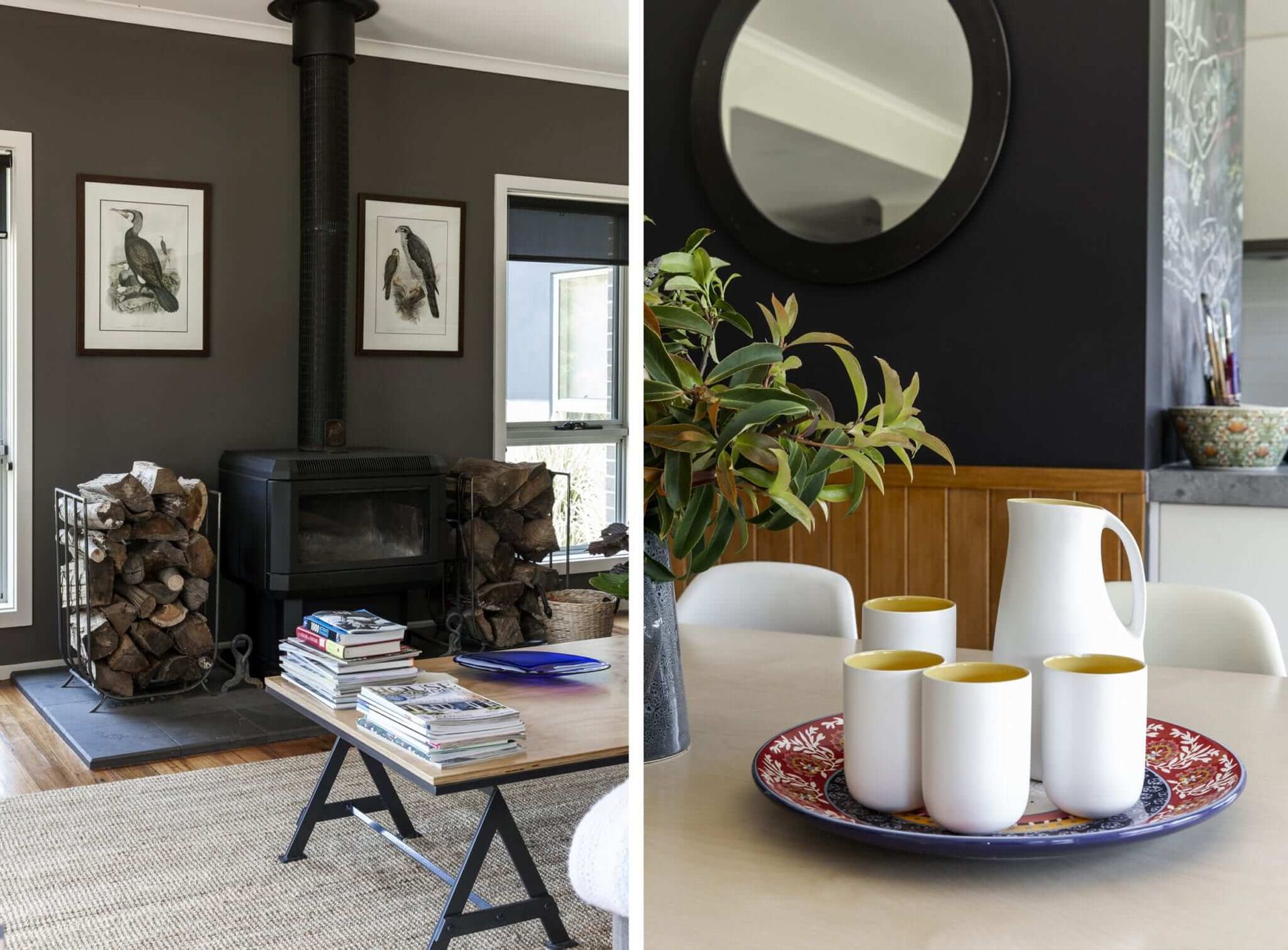 Inside, Wombat Edge offers airy, open-plan spaces filled with natural light. The living and dining areas seamlessly blend rustic charm with modern touches, featuring hardwood floors, a woodfire coonara, and a plush grey couch. The kitchen is fully equipped, with sleek grey stone countertops and a spacious dining table perfect for group meals. Bedrooms showcase rich colour palettes, practical furniture, and split-system heating and cooling for year-round comfort.
