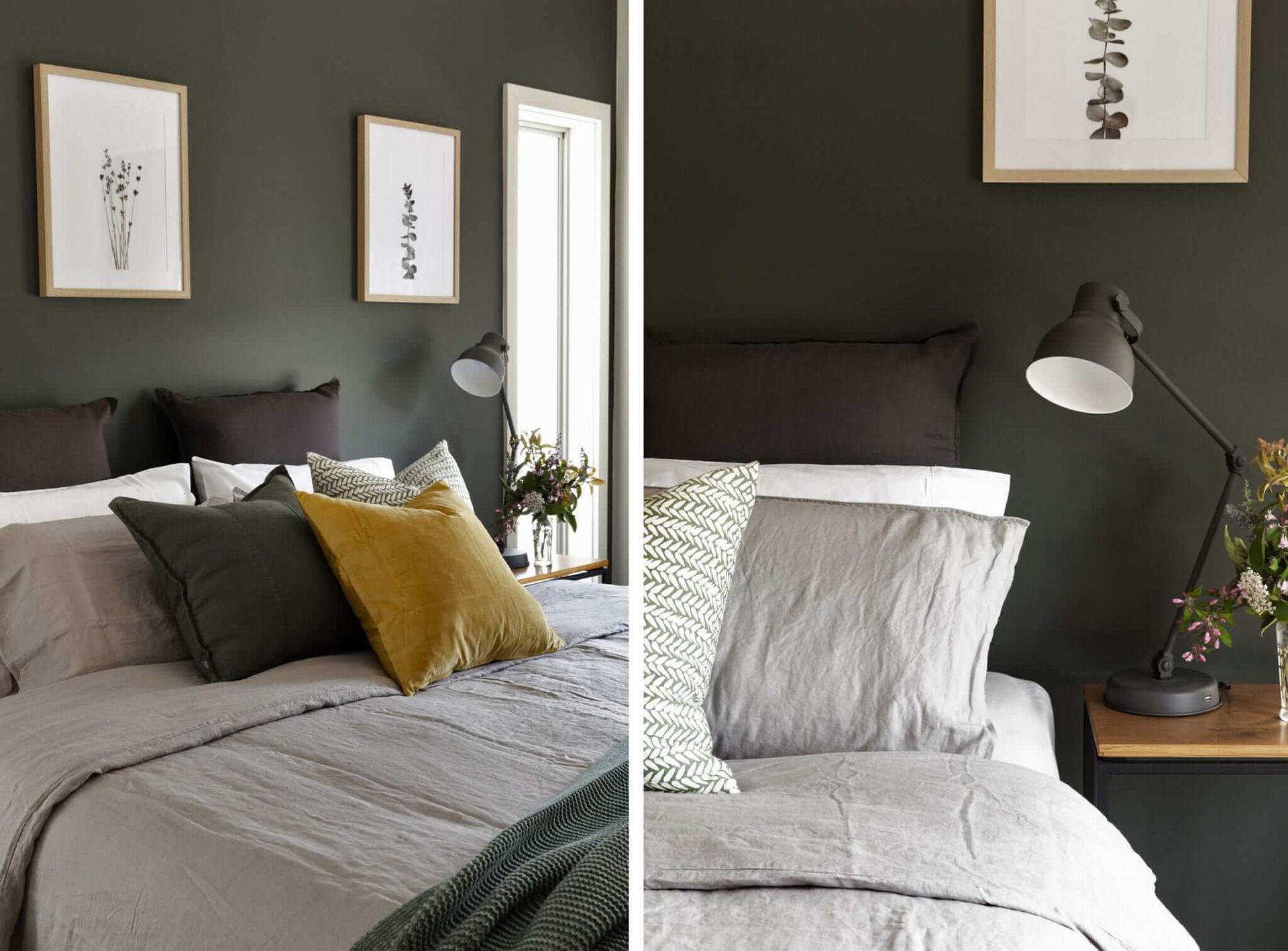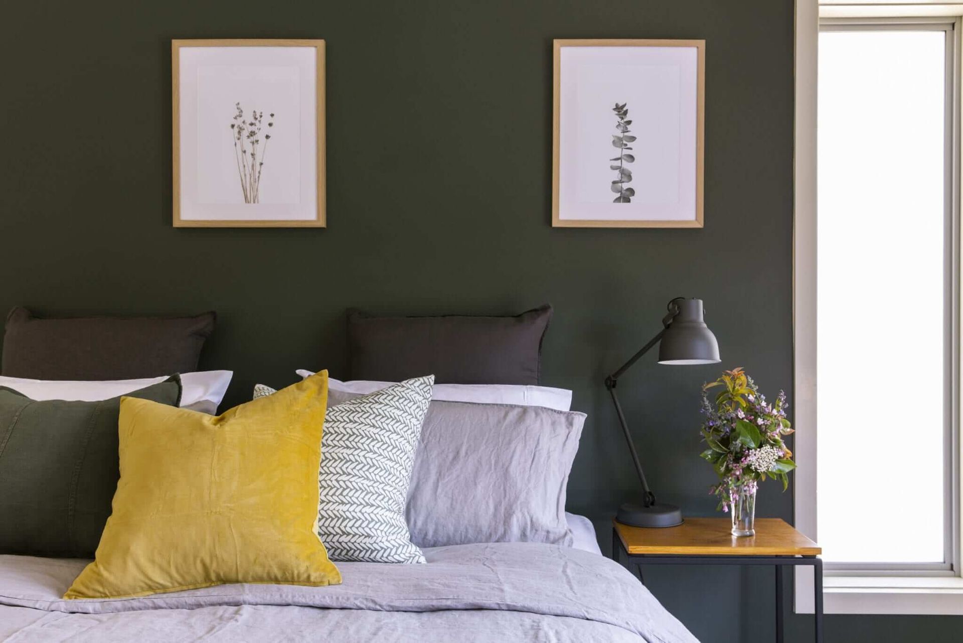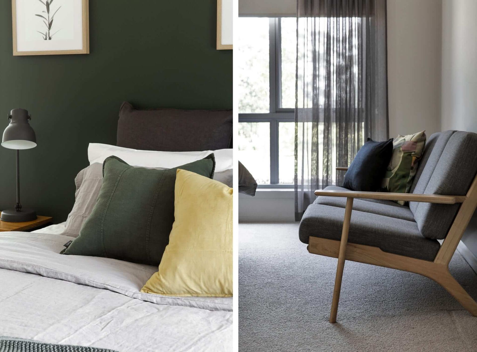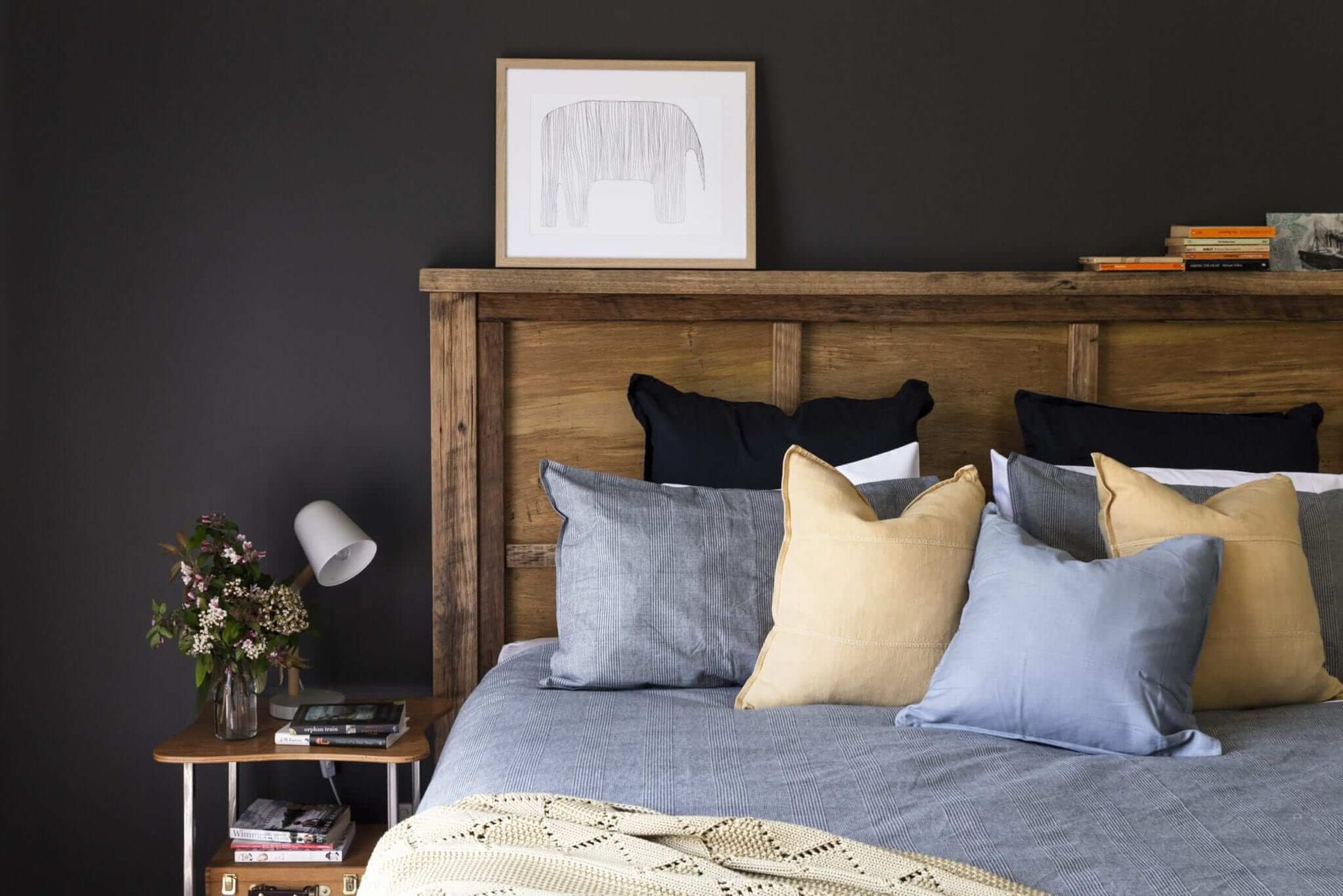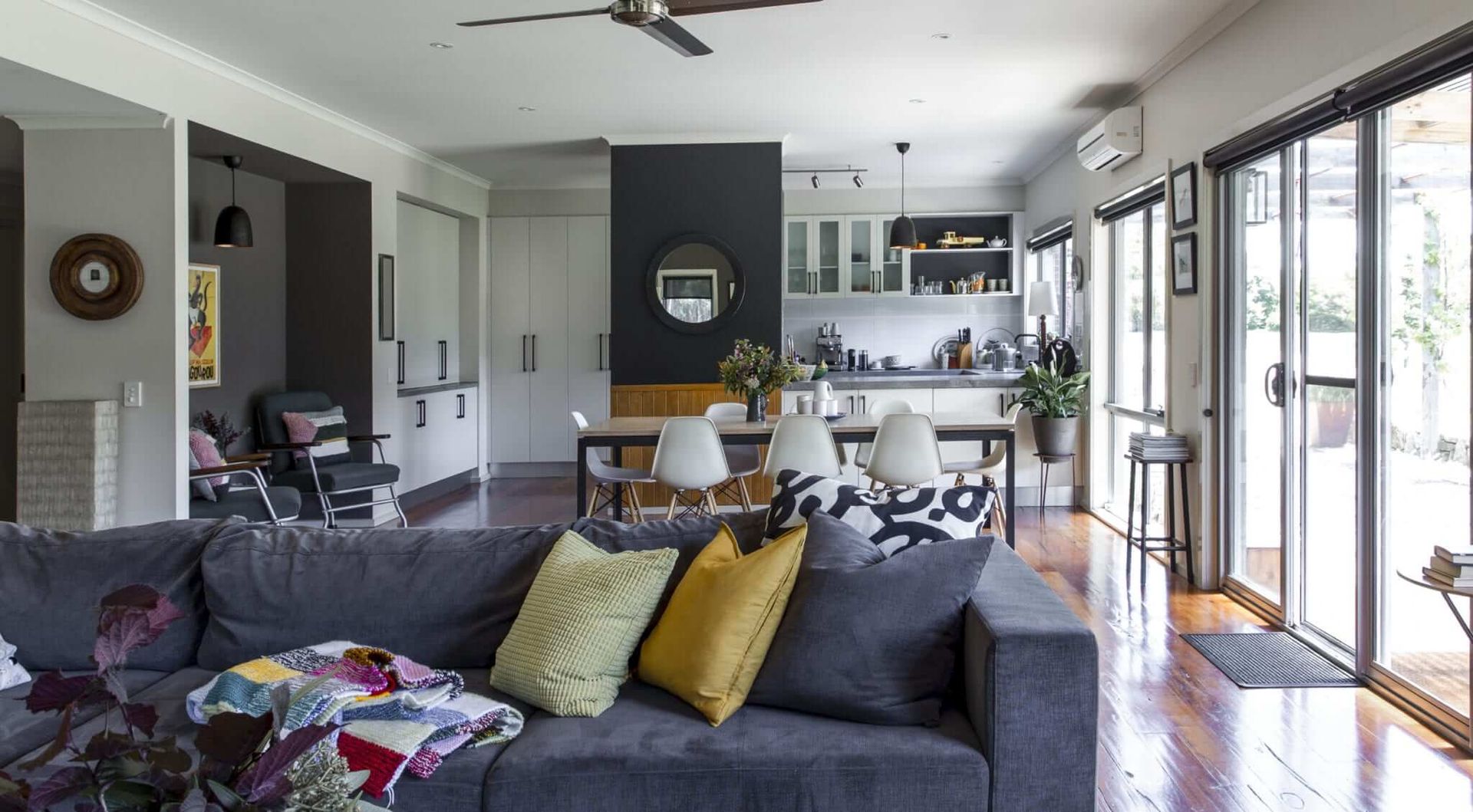 Inside, Wombat Edge offers airy, open-plan spaces filled with natural light. The living and dining areas seamlessly blend rustic charm with modern touches, featuring hardwood floors, a woodfire coonara, and a plush grey couch. The kitchen is fully equipped, with sleek grey stone countertops and a spacious dining table perfect for group meals. Bedrooms showcase rich colour palettes, practical furniture, and split-system heating and cooling for year-round comfort.