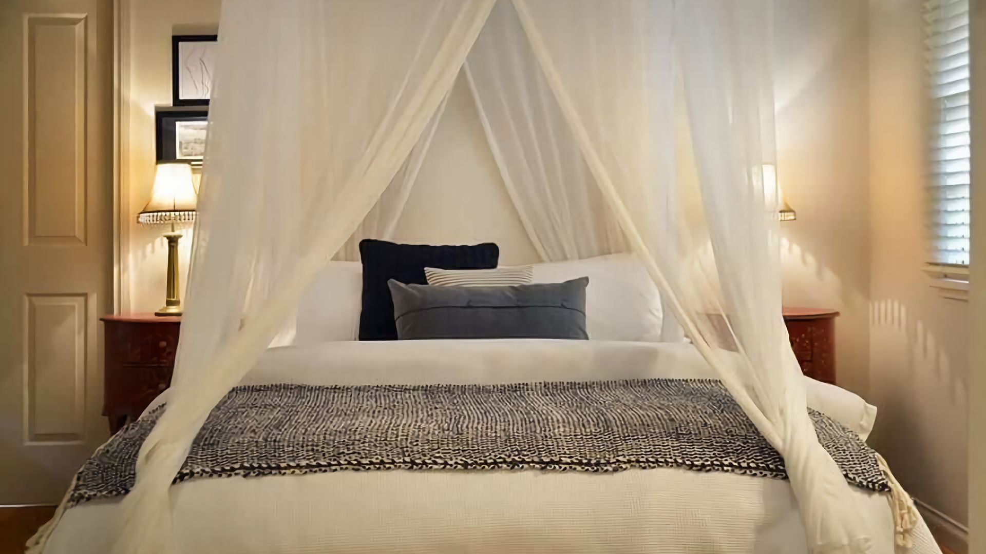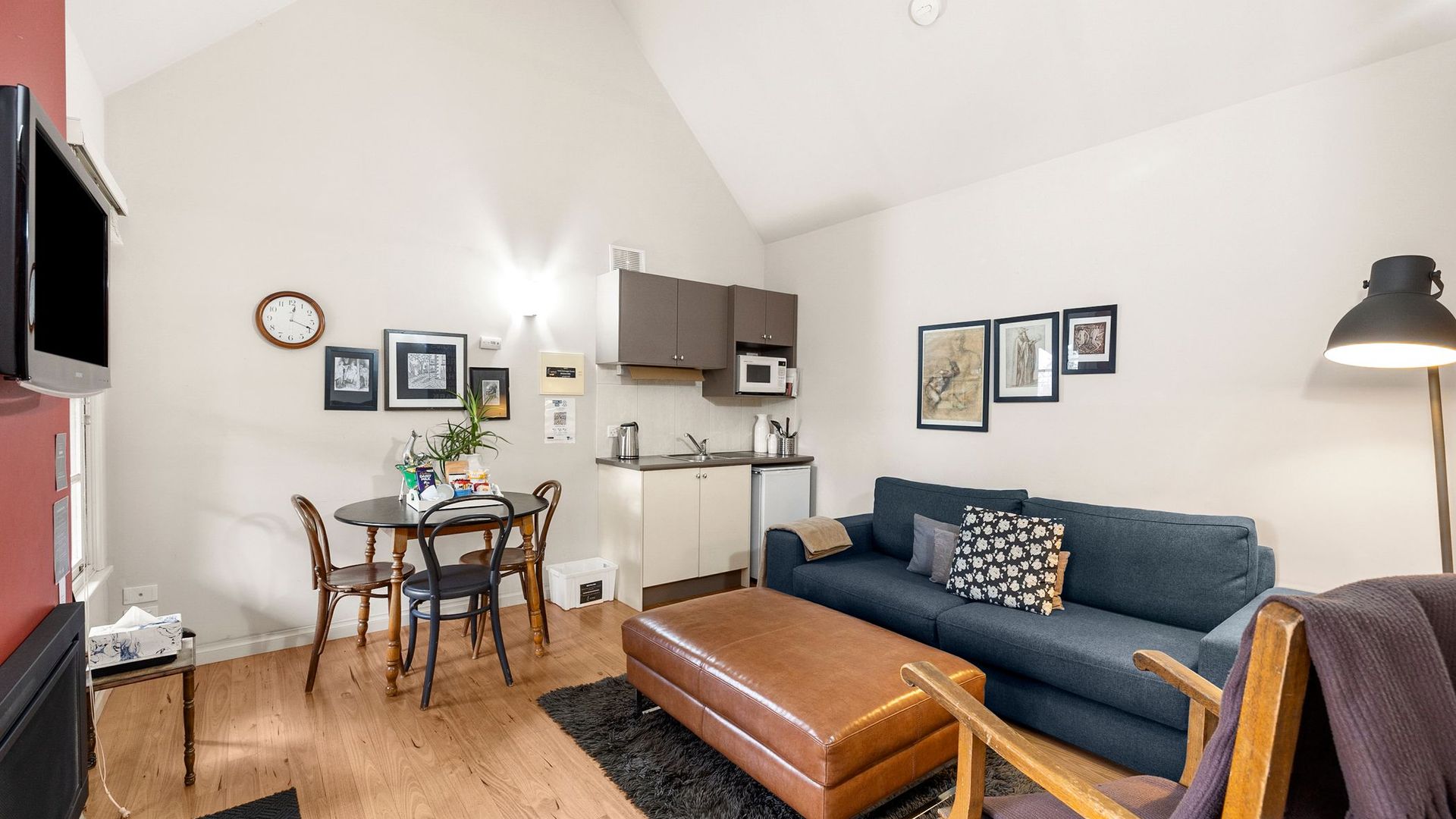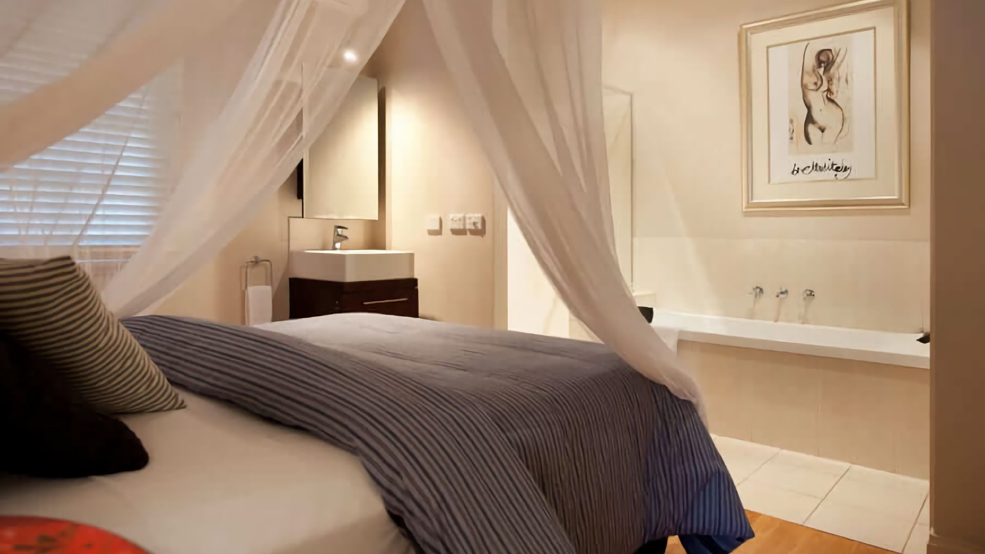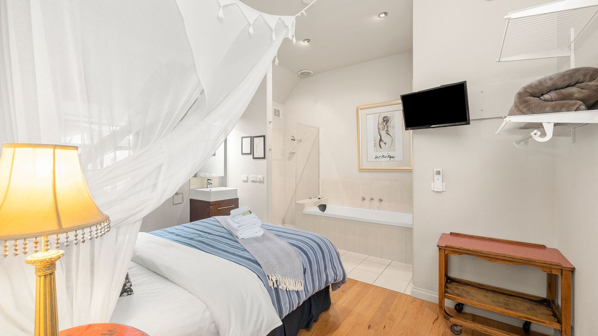 The bedroom is comfort defined. The queen bed sits with an elegant white canopy in the centre of the room. Beautiful artwork adorns the walls, lending the space character. The well-appointed bathroom offers a spa bath as well as a shower. Split system heating and cooling guarantee an ideal temperature whatever the time of year.