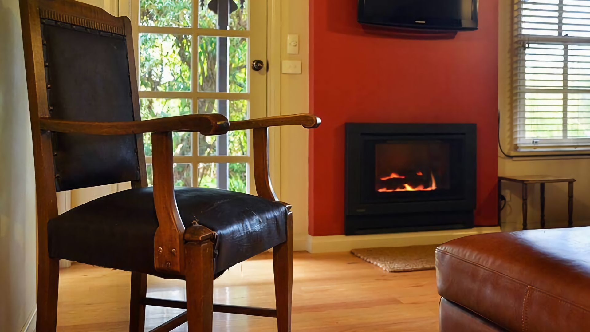 The cottage indoor space is split between the spacious living room and the bedroom with its en-suite. The living area is brightened by natural light filtering in through the windows and glass doors, which offer views of the garden. A large, plush leather couch invites lodgers to relax and watch some TV. For chilly nights, get the fireplace crackling and enjoy the intimate atmosphere.