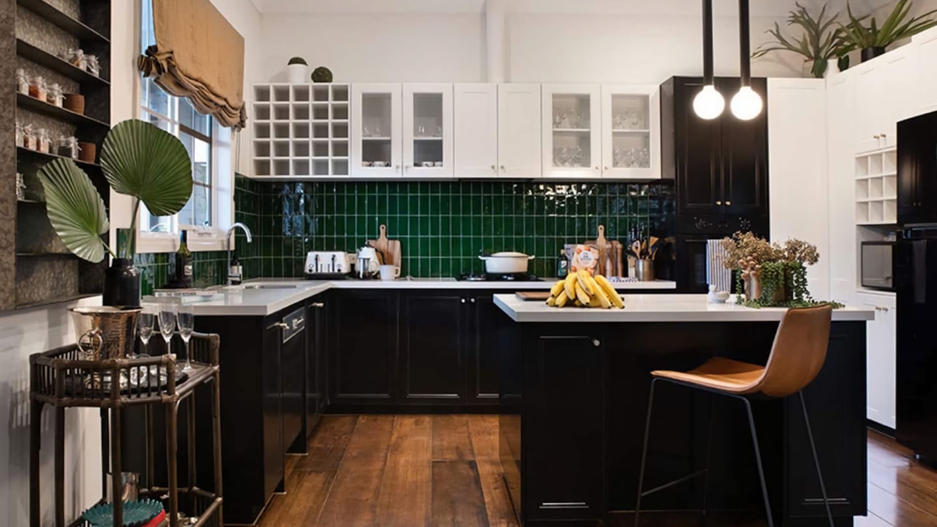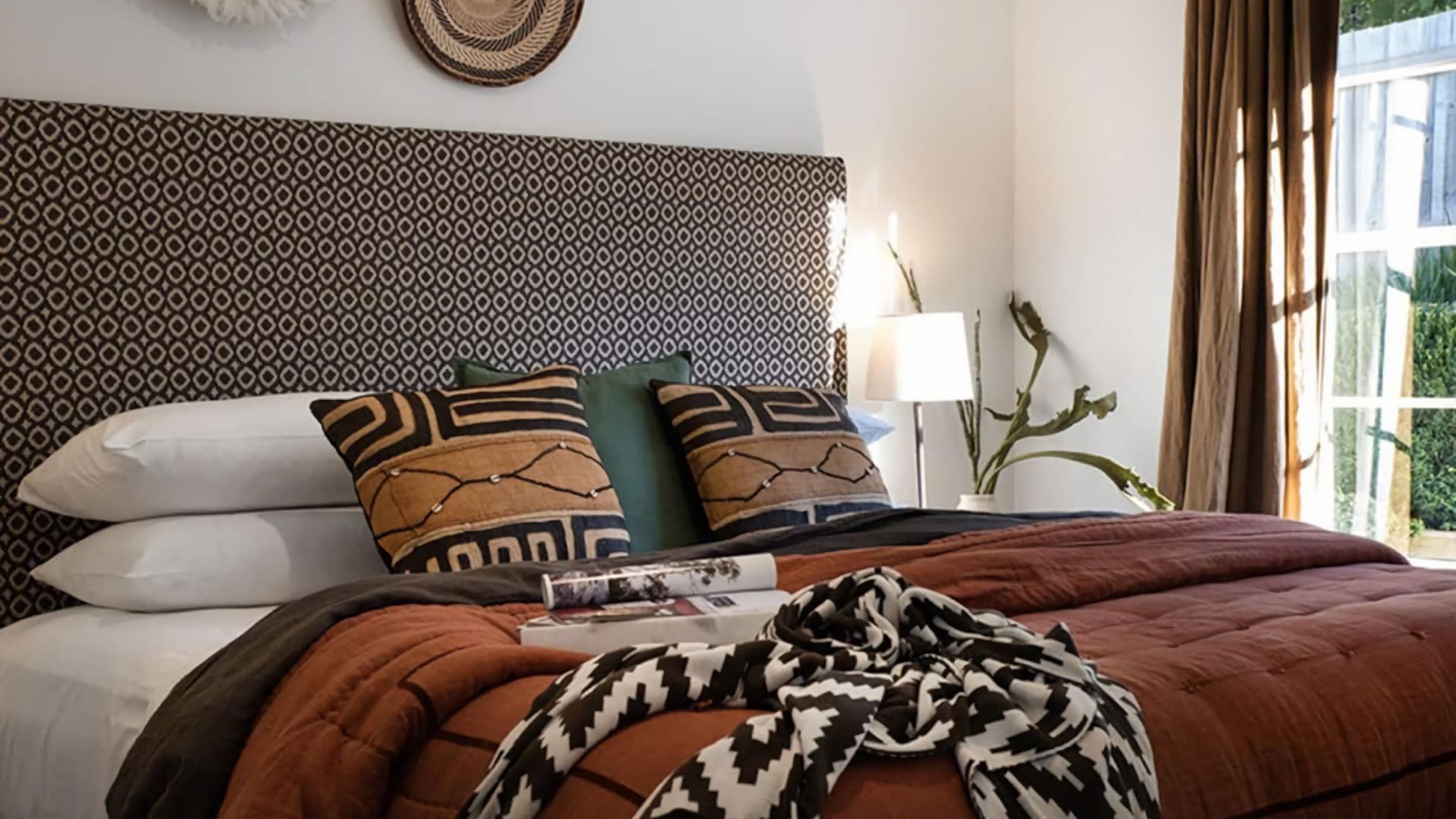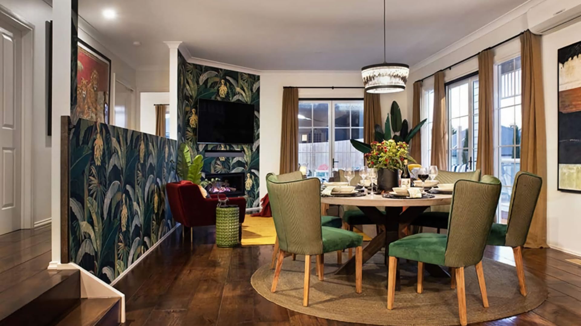 Natural materials such as linens, cotton, woolen rugs, tribal elements, leather, timber, and rattan create a harmonious aesthetic throughout the property. The living and dining space features the captivating Catherine Martin "La Palma" wallpaper, introducing vibrant colours and lively tropical motifs to the expansive area.
