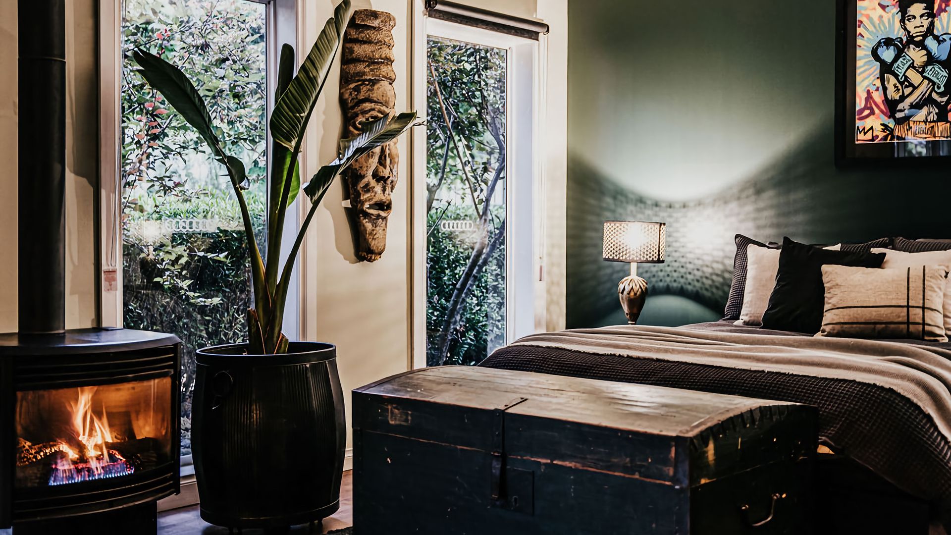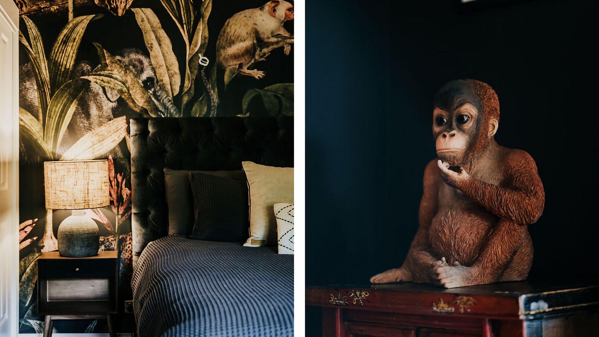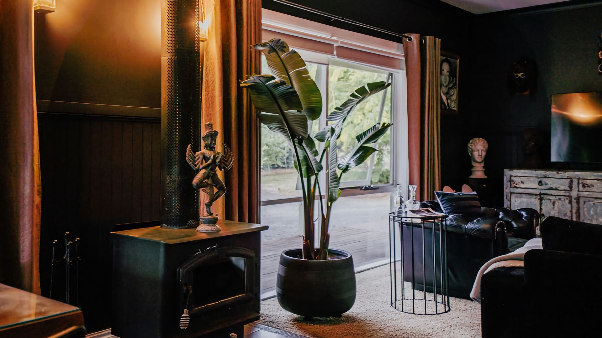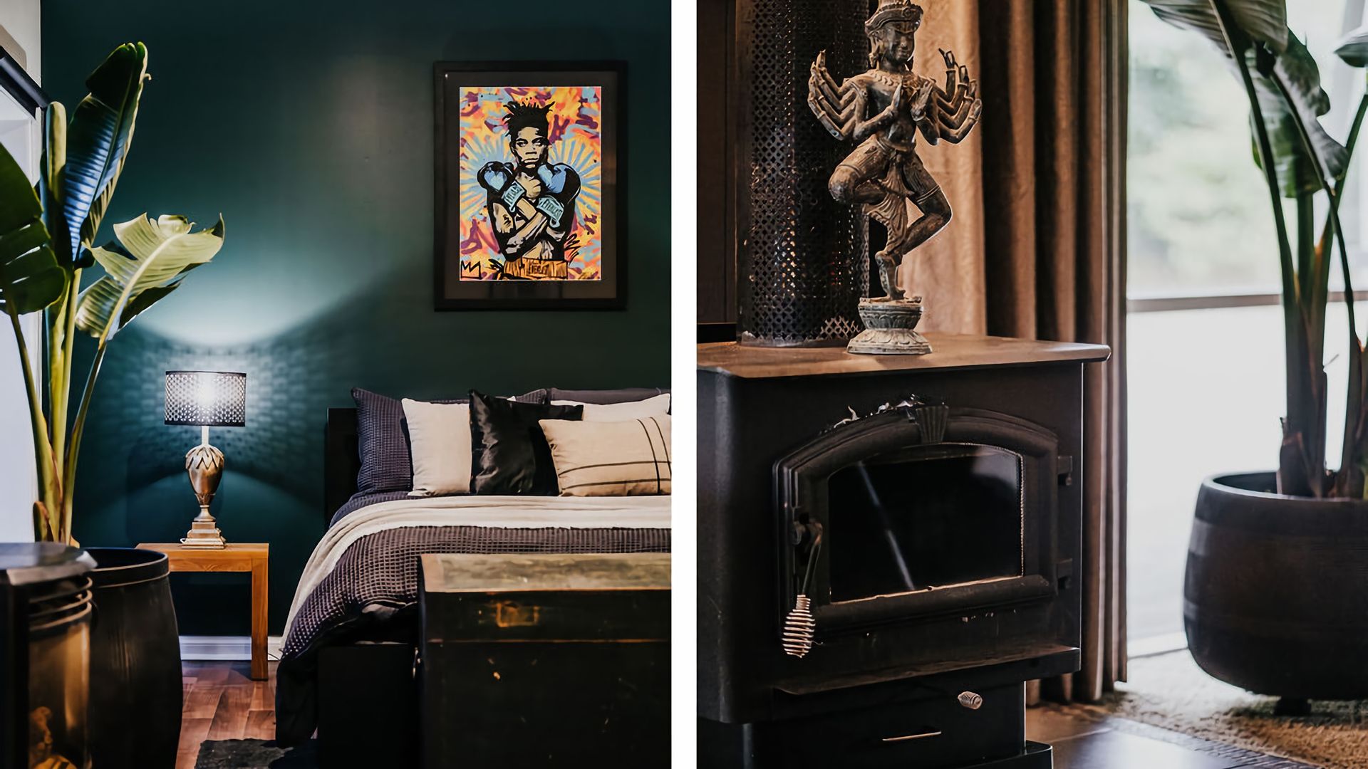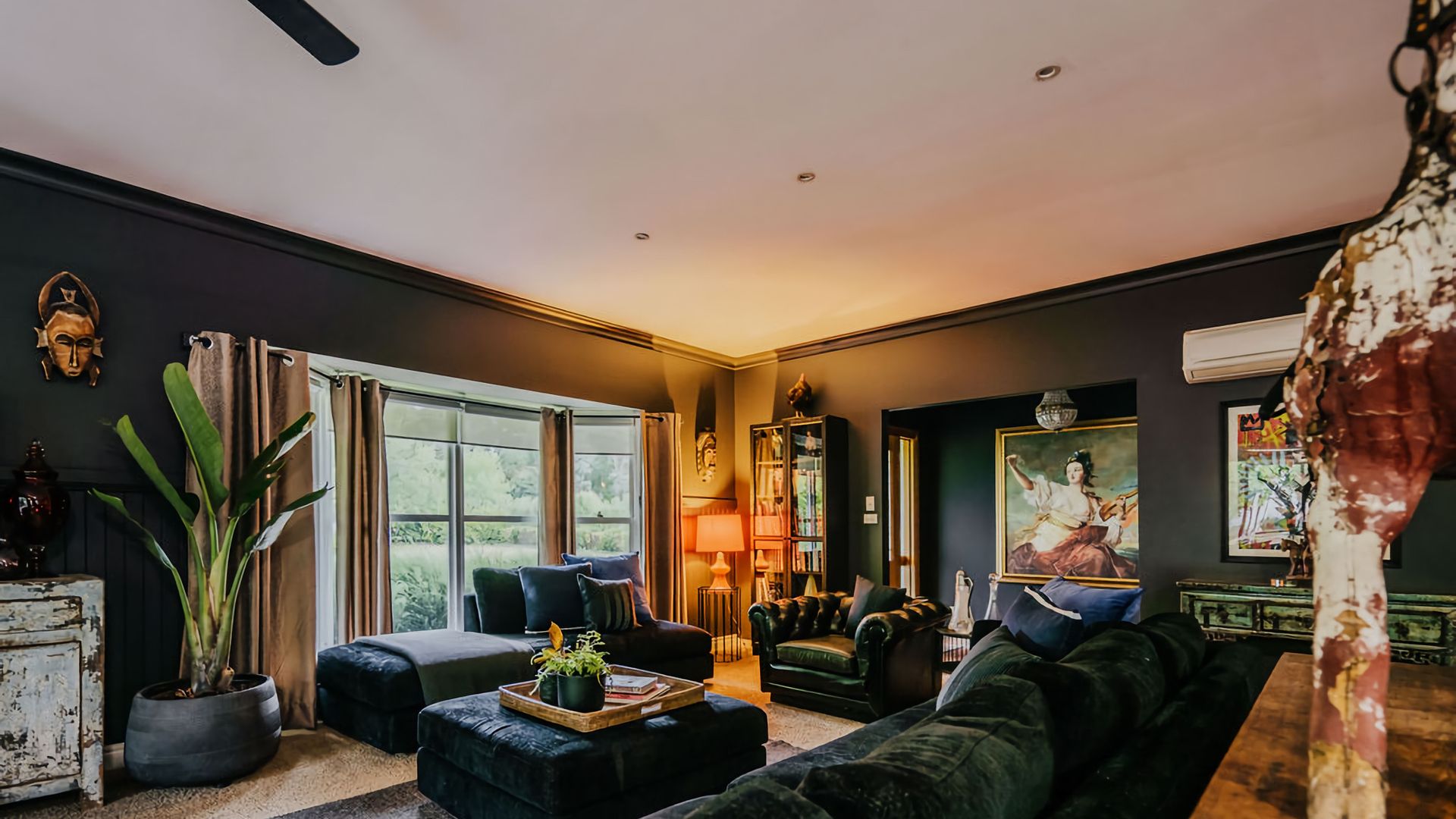 The dark walls and deep velour couches give this home a moody, contemporary edge. Coupled with the incredible array of curated artwork that pepper every wall and surface, Istana Lodge gives the feel of staying in a cosy local gallery. Along with statement furniture, indoor plants, and pops of colour, there is no shortage of elements to draw the eye.