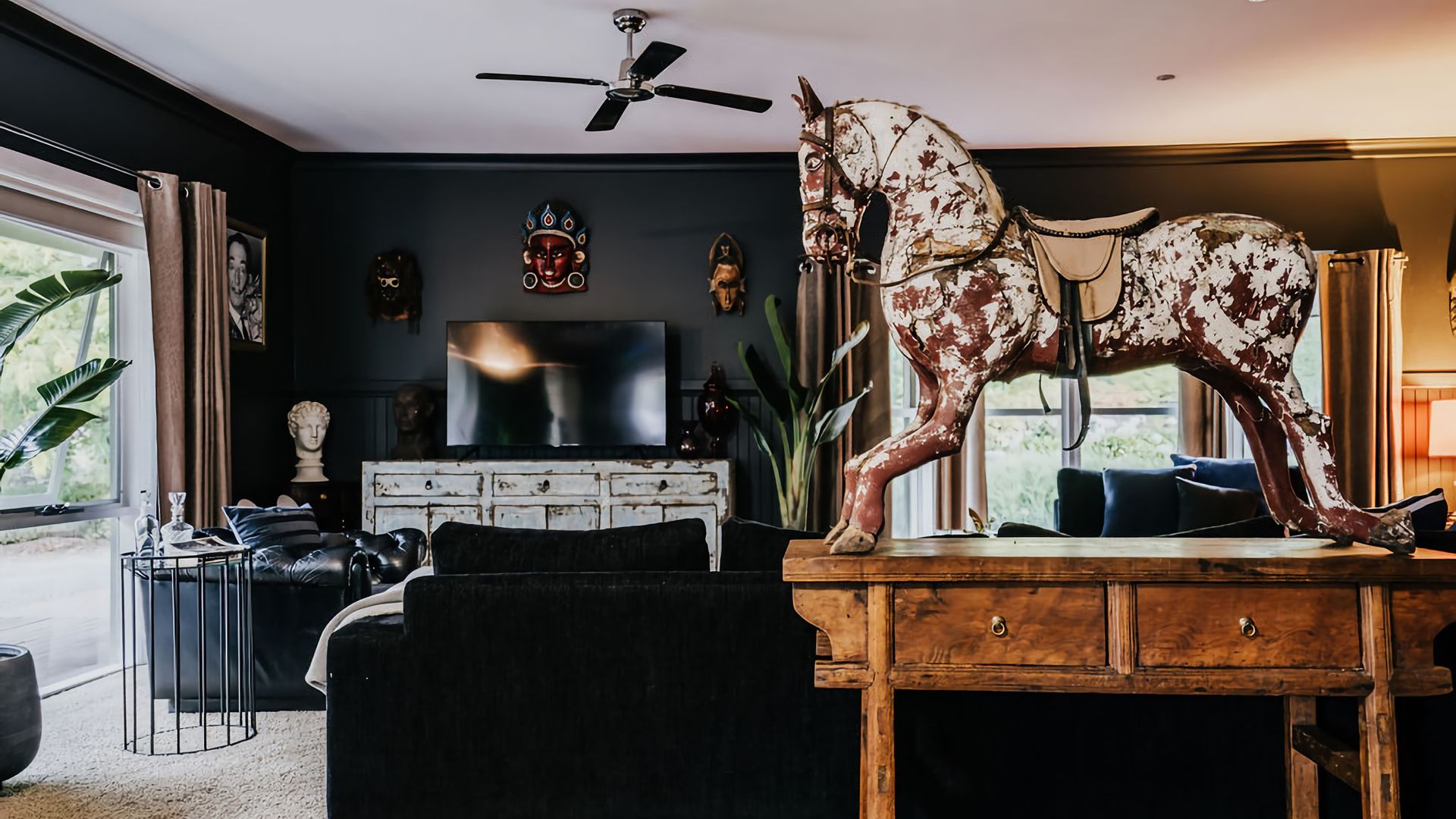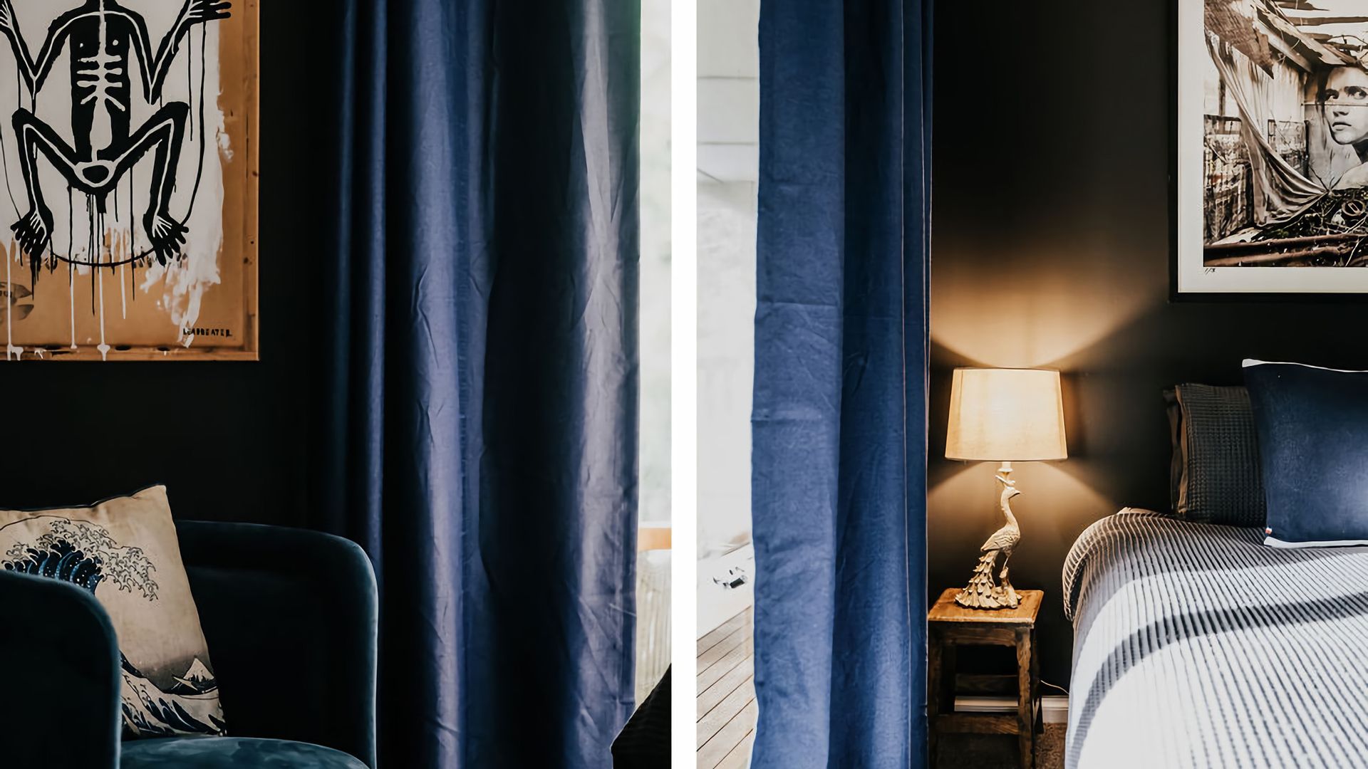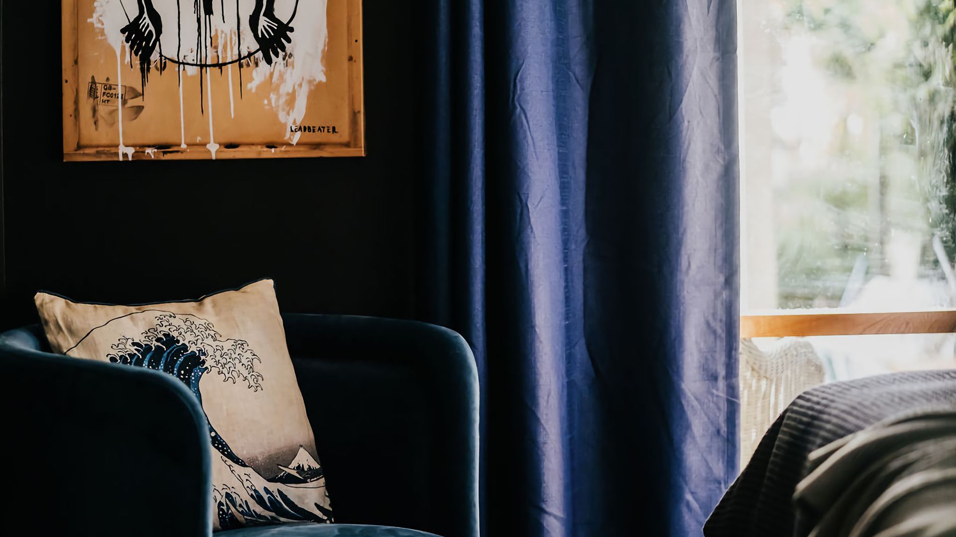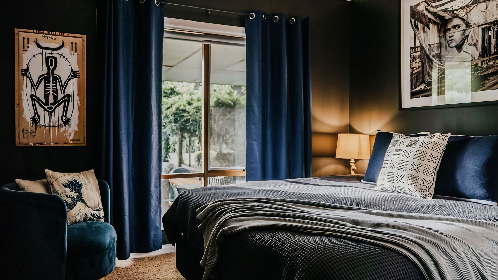 The dark walls and deep velour couches give this home a moody, contemporary edge. Coupled with the incredible array of curated artwork that pepper every wall and surface, Istana Lodge gives the feel of staying in a cosy local gallery. Along with statement furniture, indoor plants, and pops of colour, there is no shortage of elements to draw the eye.