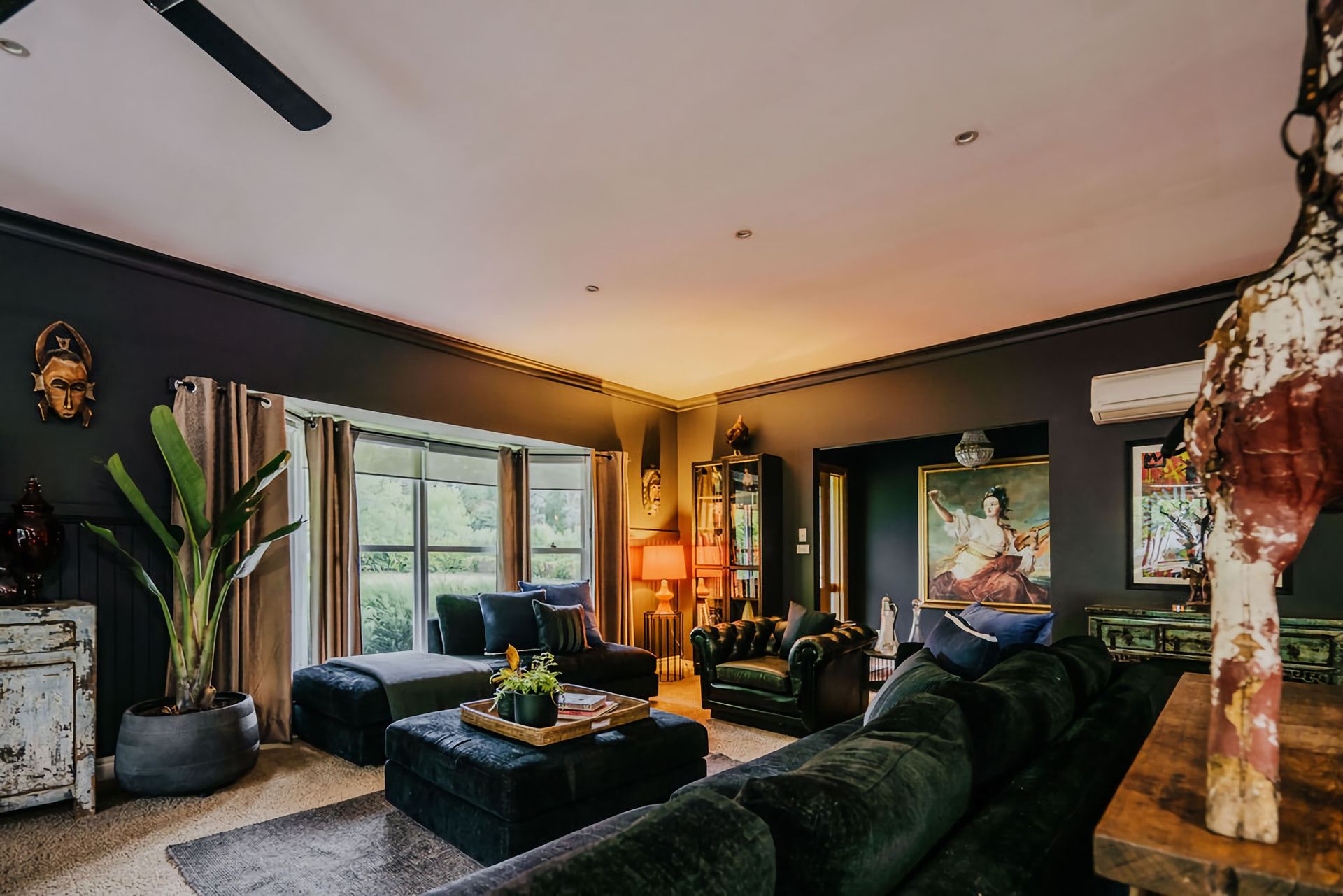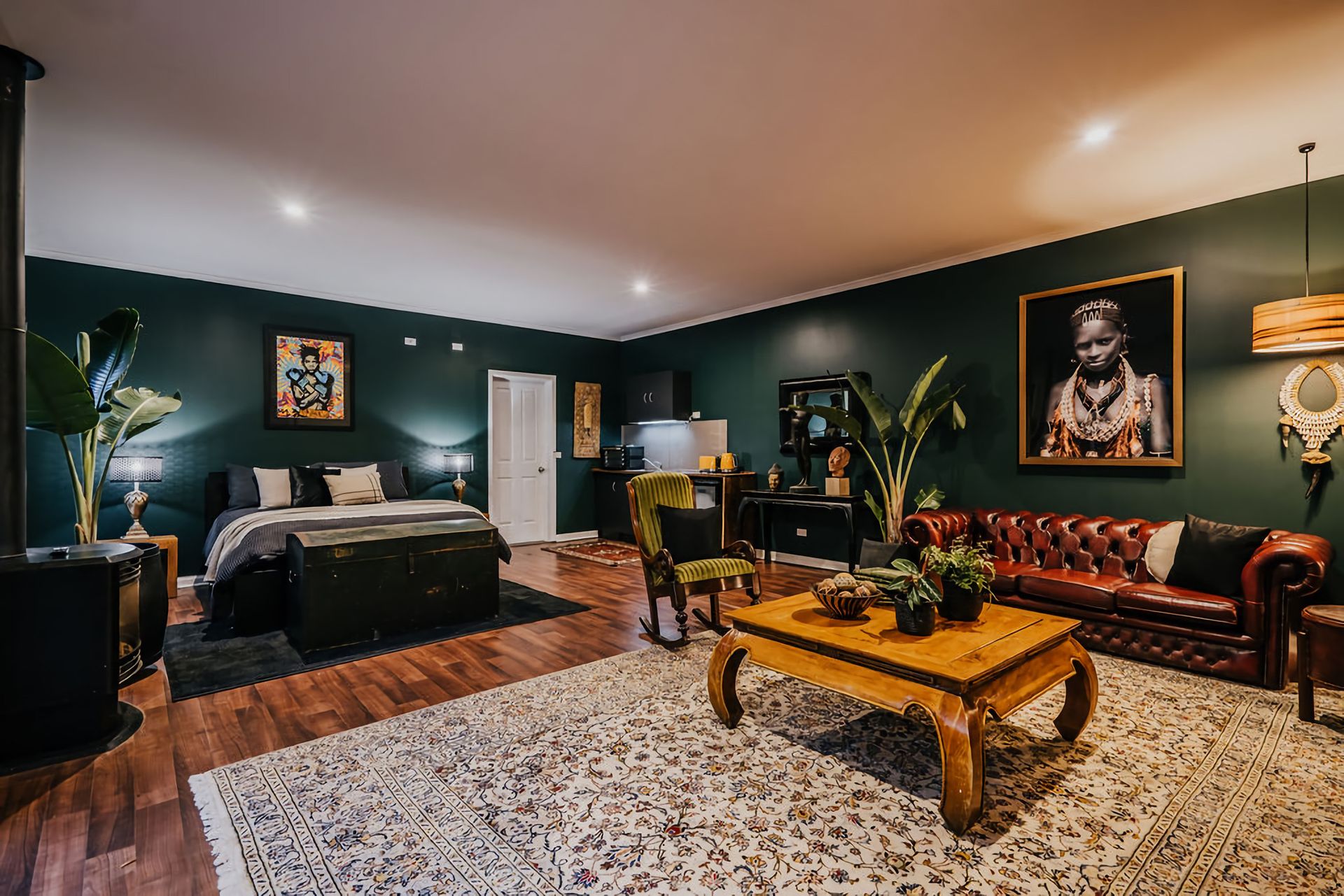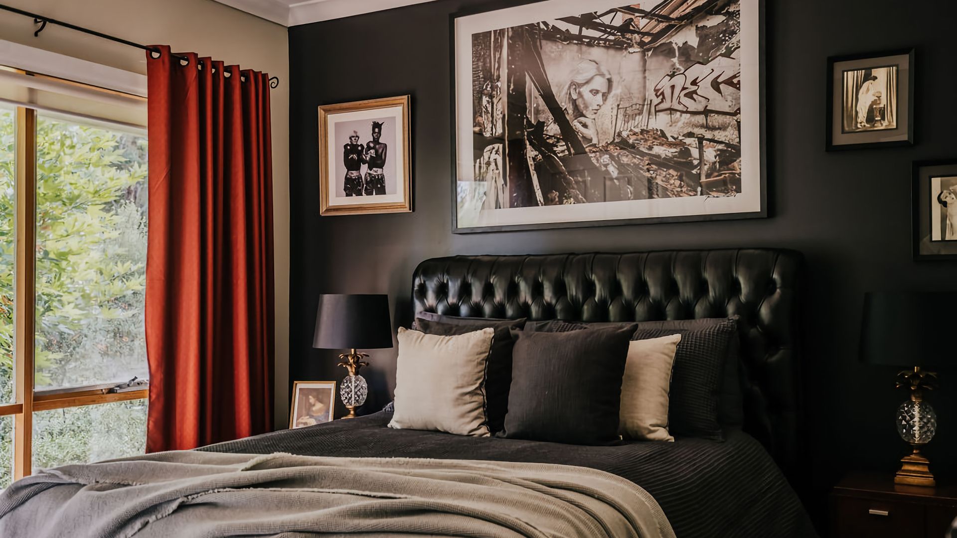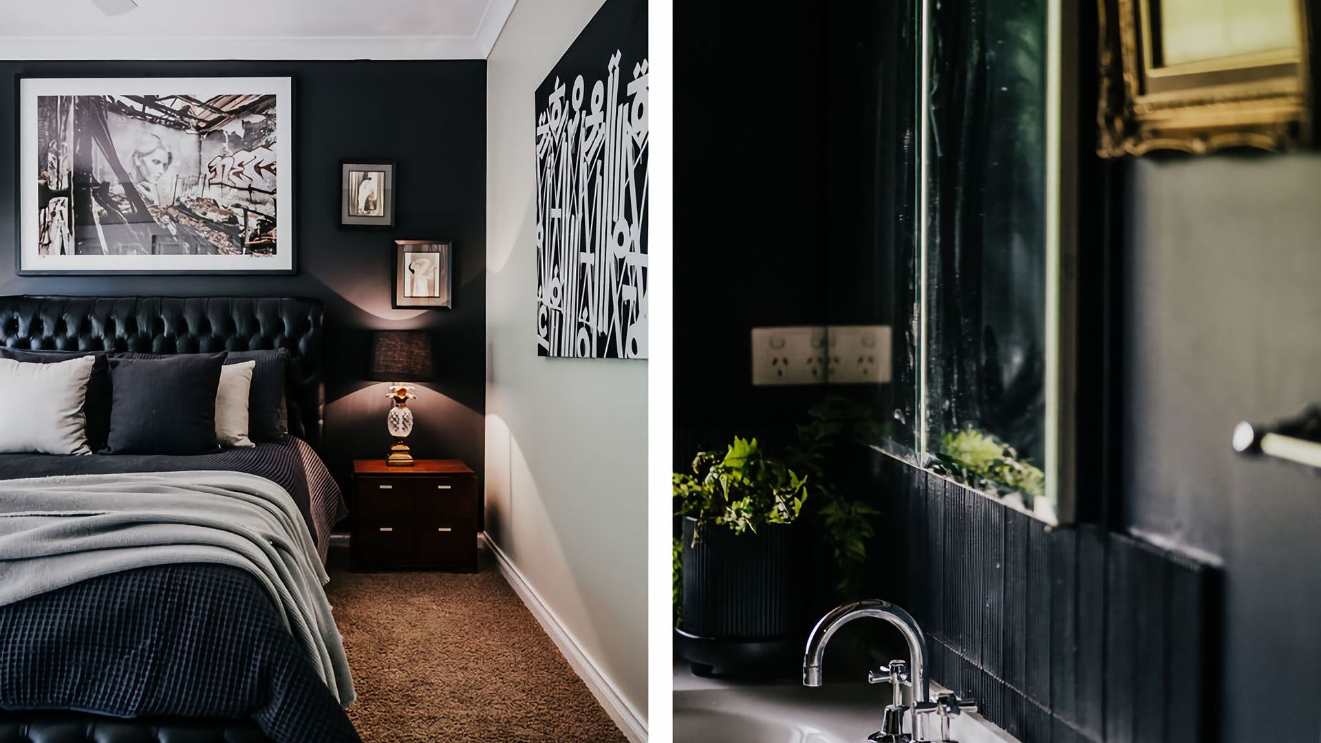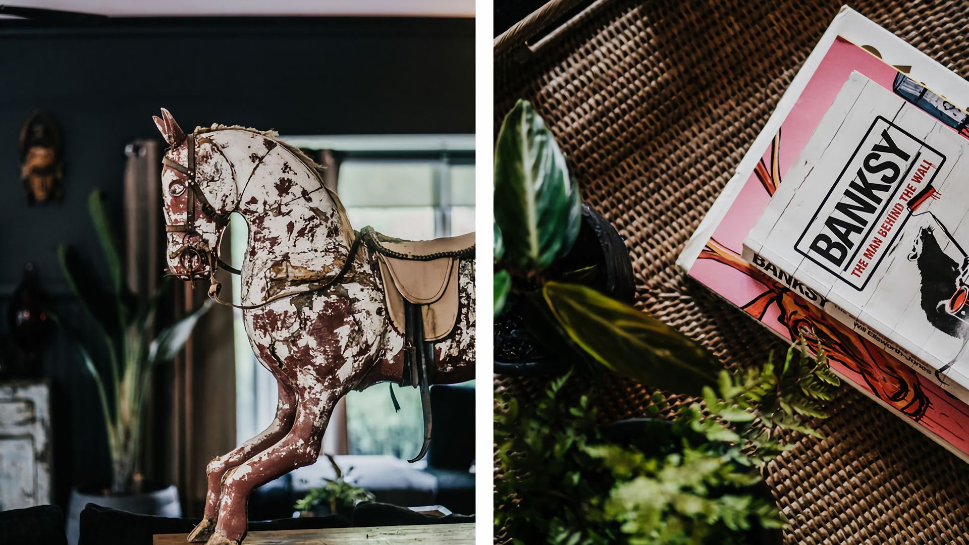 The dark walls and deep velour couches give this home a moody, contemporary edge. Coupled with the incredible array of curated artwork that pepper every wall and surface, Istana Lodge gives the feel of staying in a cosy local gallery. Along with statement furniture, indoor plants, and pops of colour, there is no shortage of elements to draw the eye.