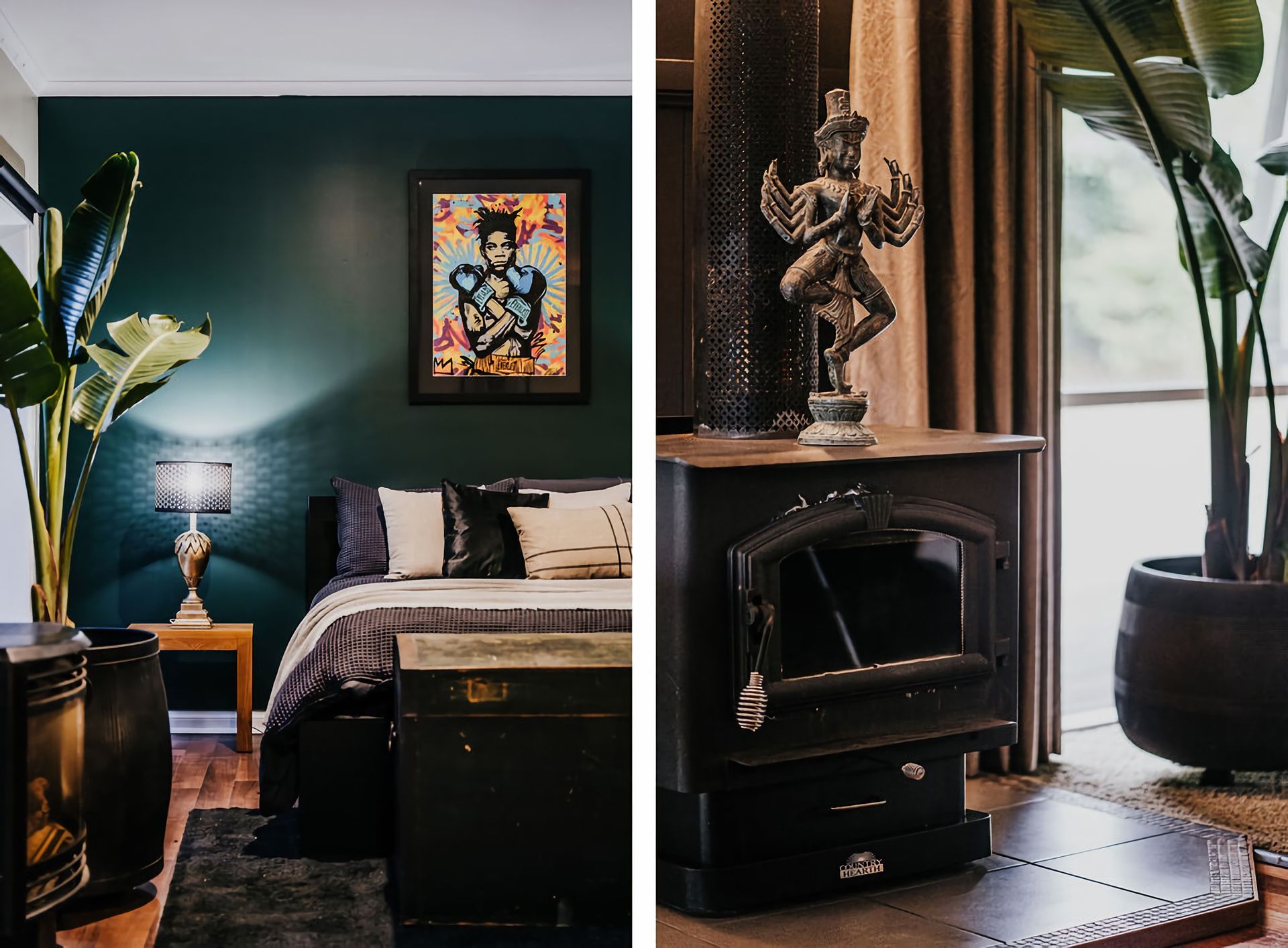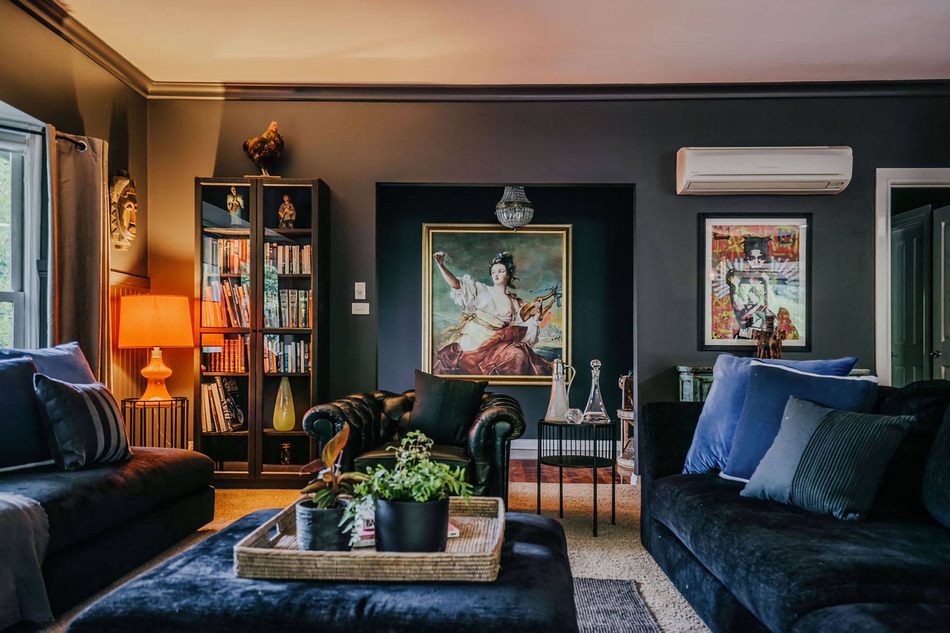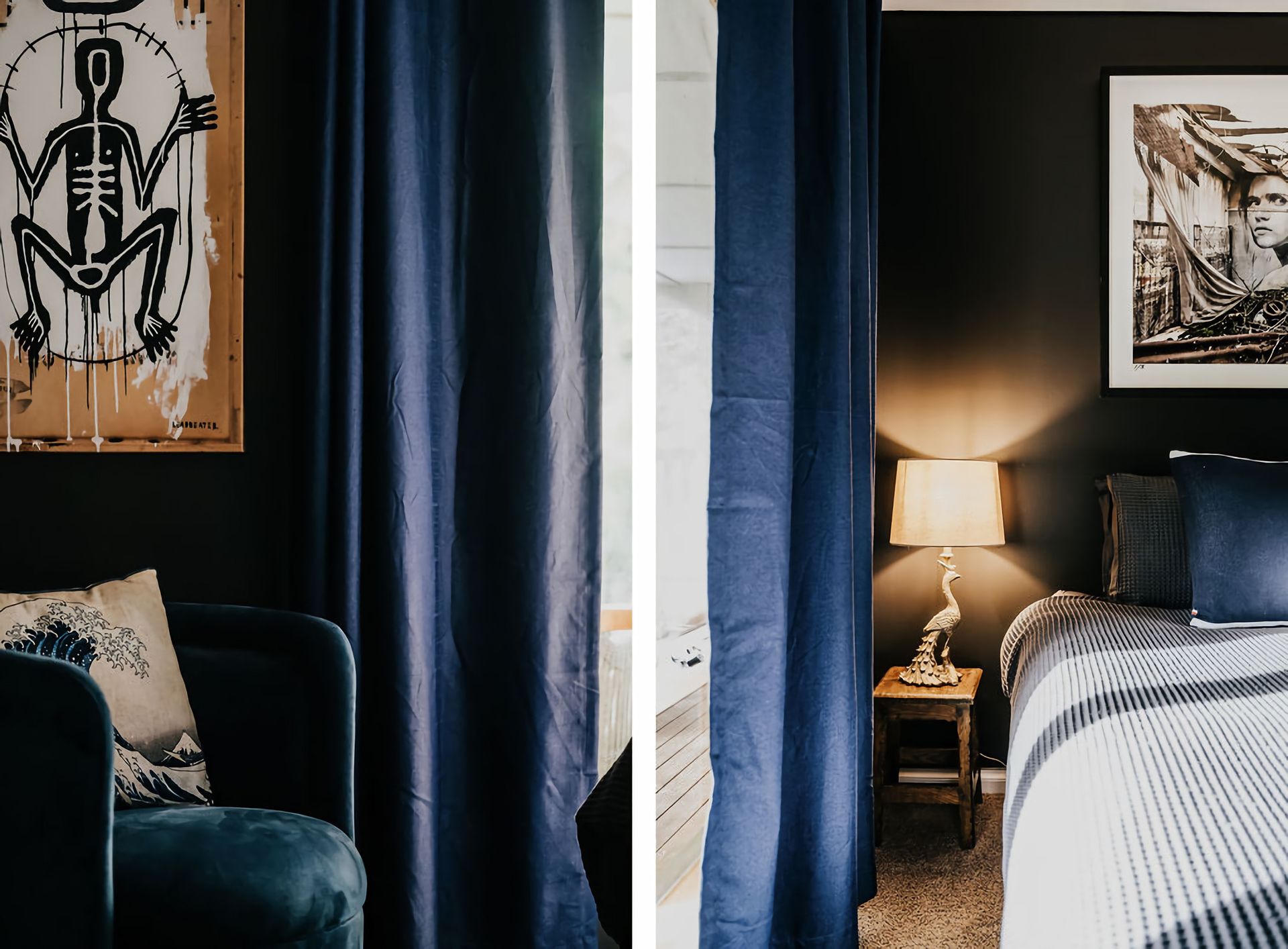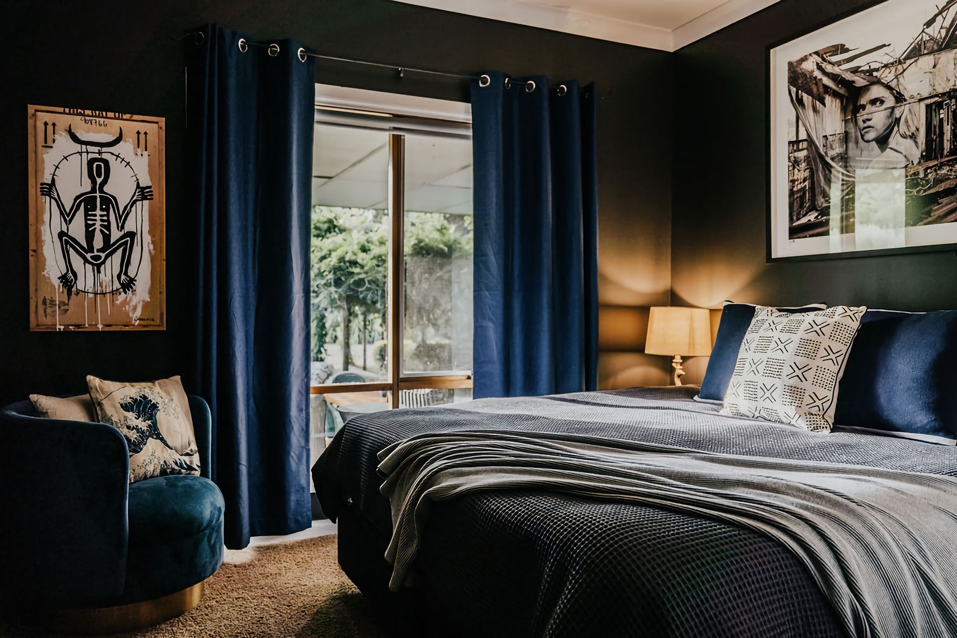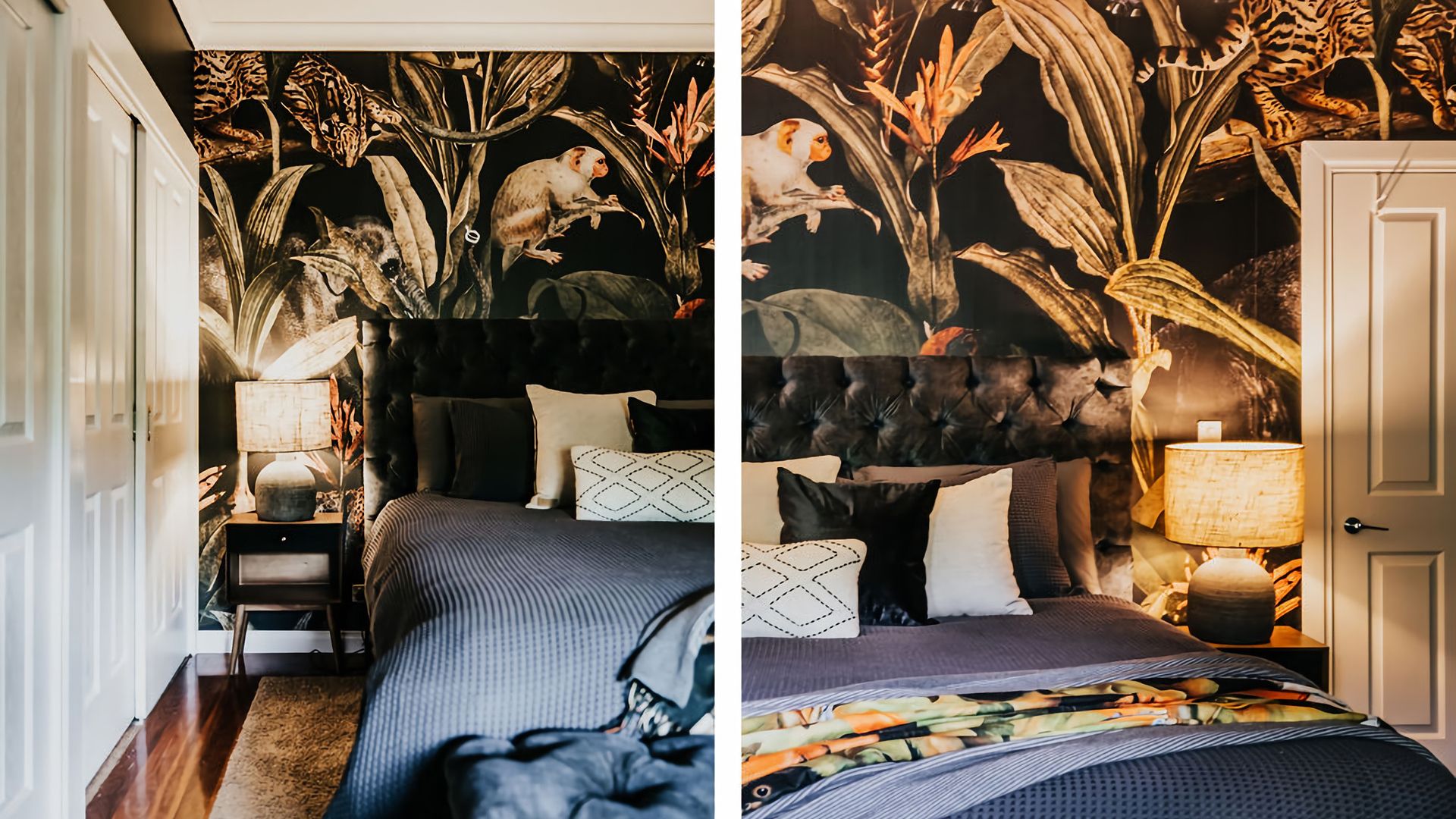 The dark walls and deep velour couches give this home a moody, contemporary edge. Coupled with the incredible array of curated artwork that pepper every wall and surface, Istana Lodge gives the feel of staying in a cosy local gallery. Along with statement furniture, indoor plants, and pops of colour, there is no shortage of elements to draw the eye.