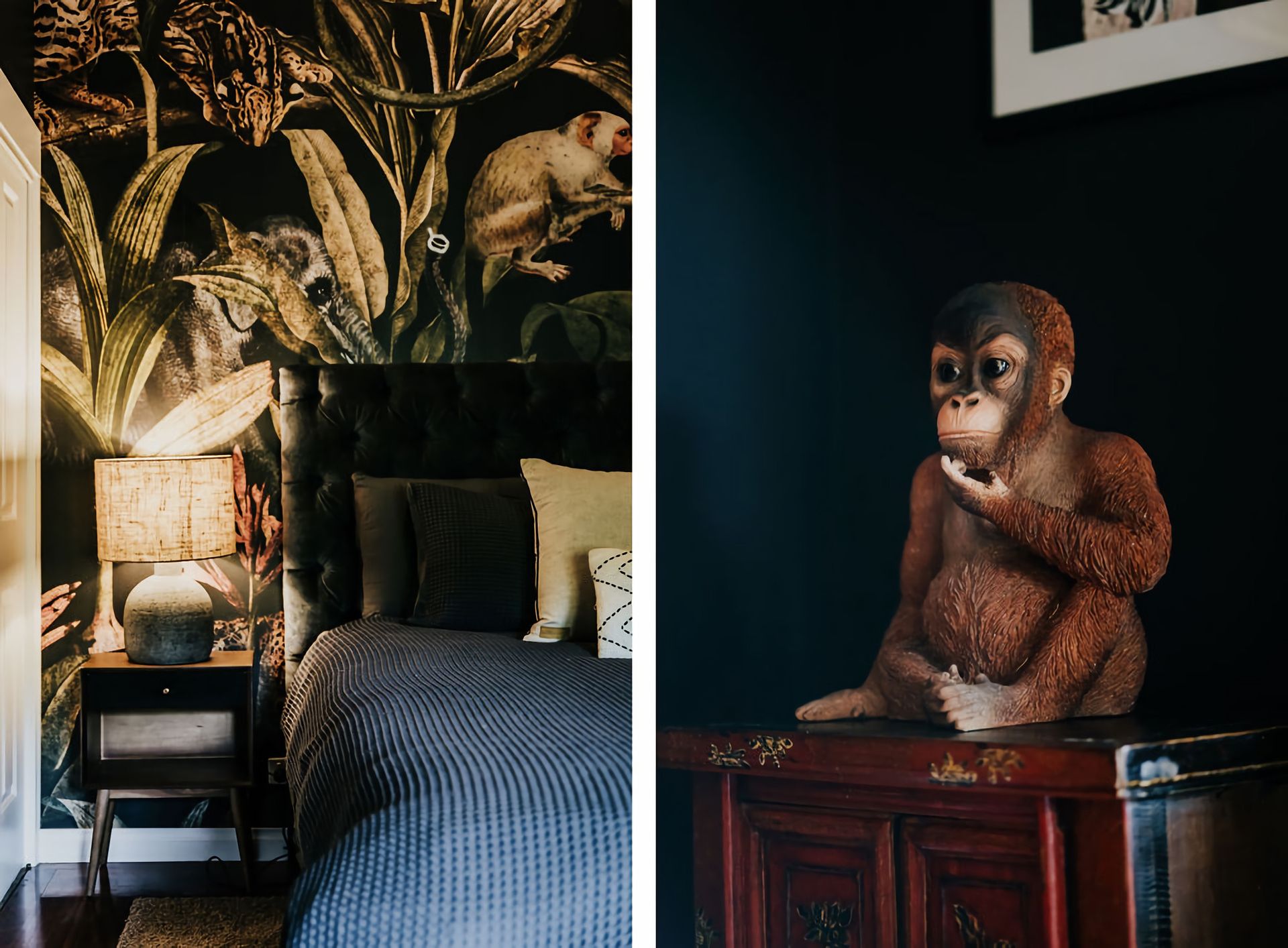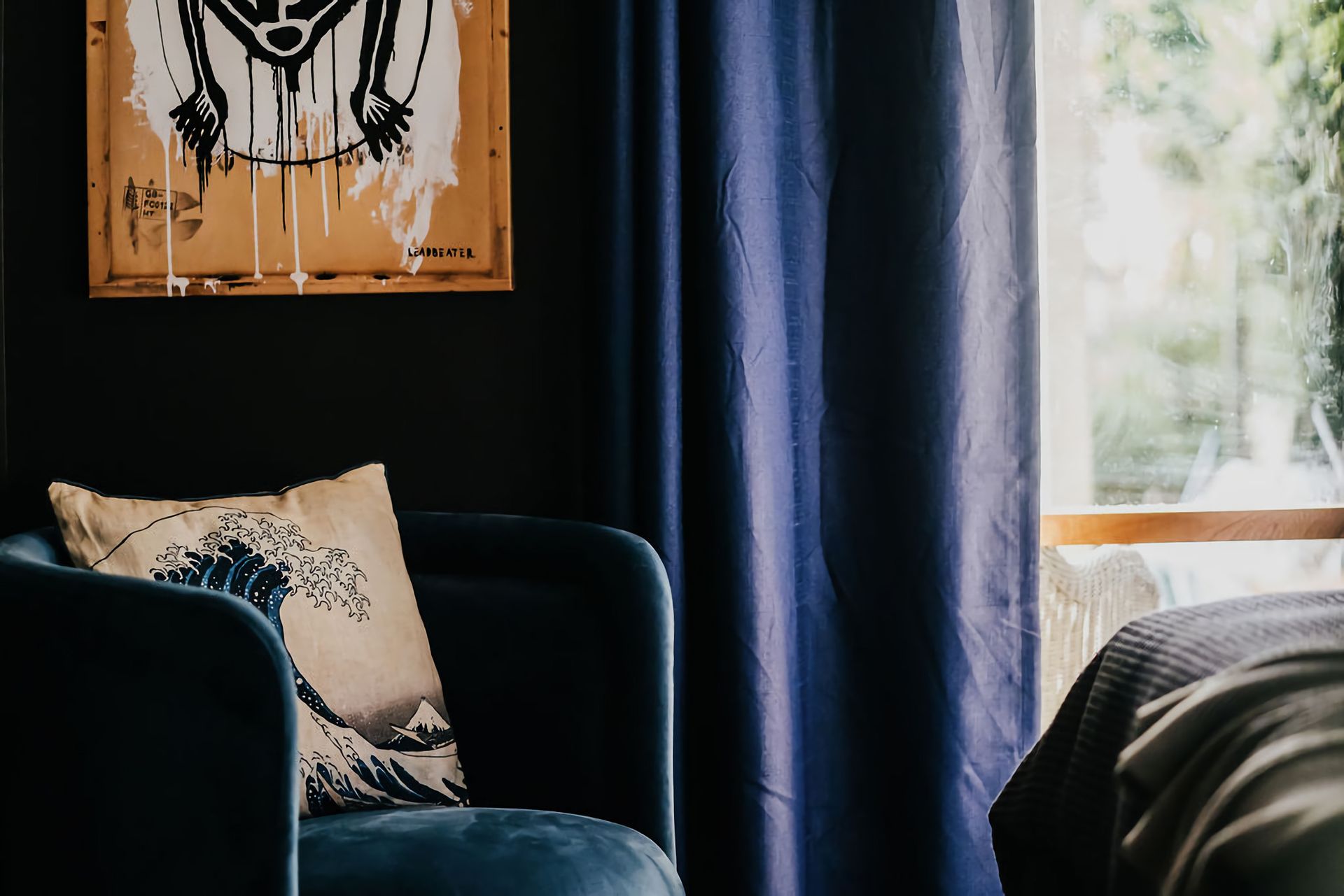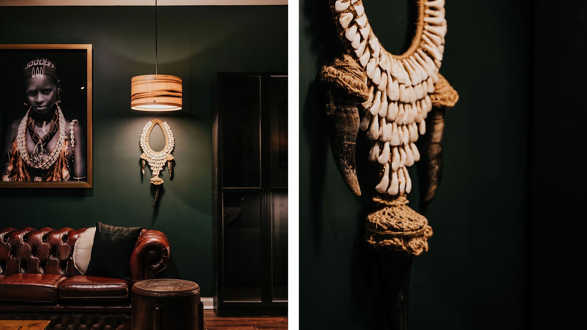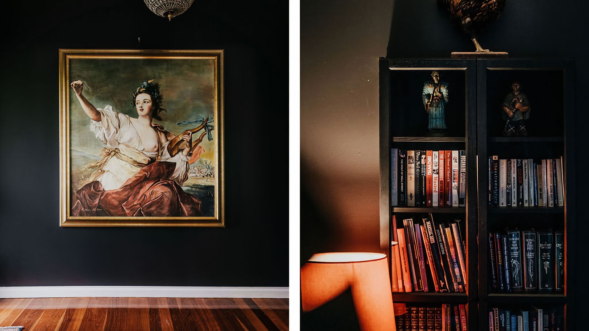 The dark walls and deep velour couches give this home a moody, contemporary edge. Coupled with the incredible array of curated artwork that pepper every wall and surface, Istana Lodge gives the feel of staying in a cosy local gallery. Along with statement furniture, indoor plants, and pops of colour, there is no shortage of elements to draw the eye.