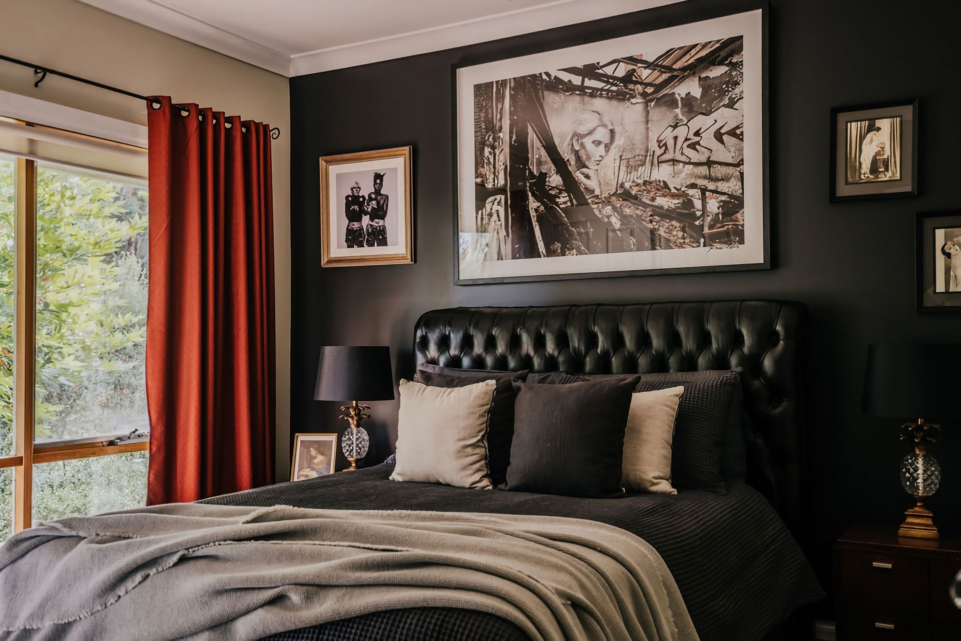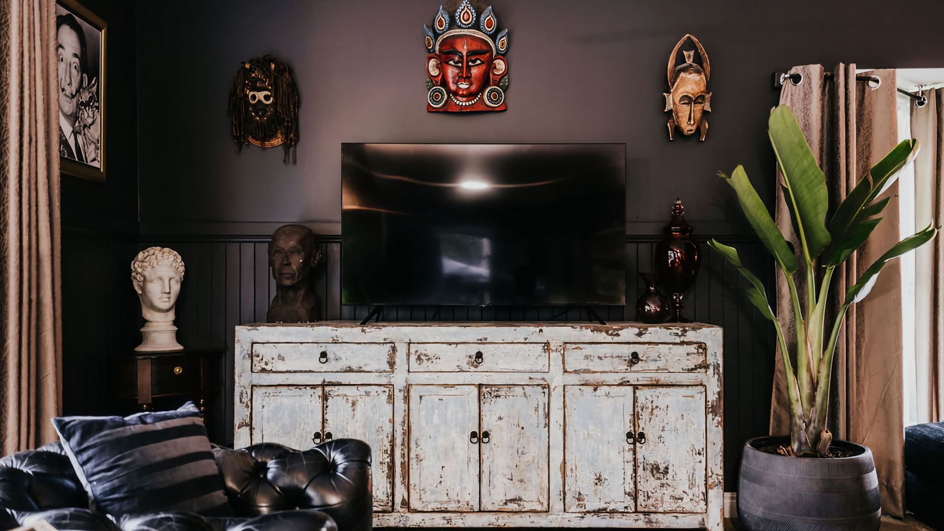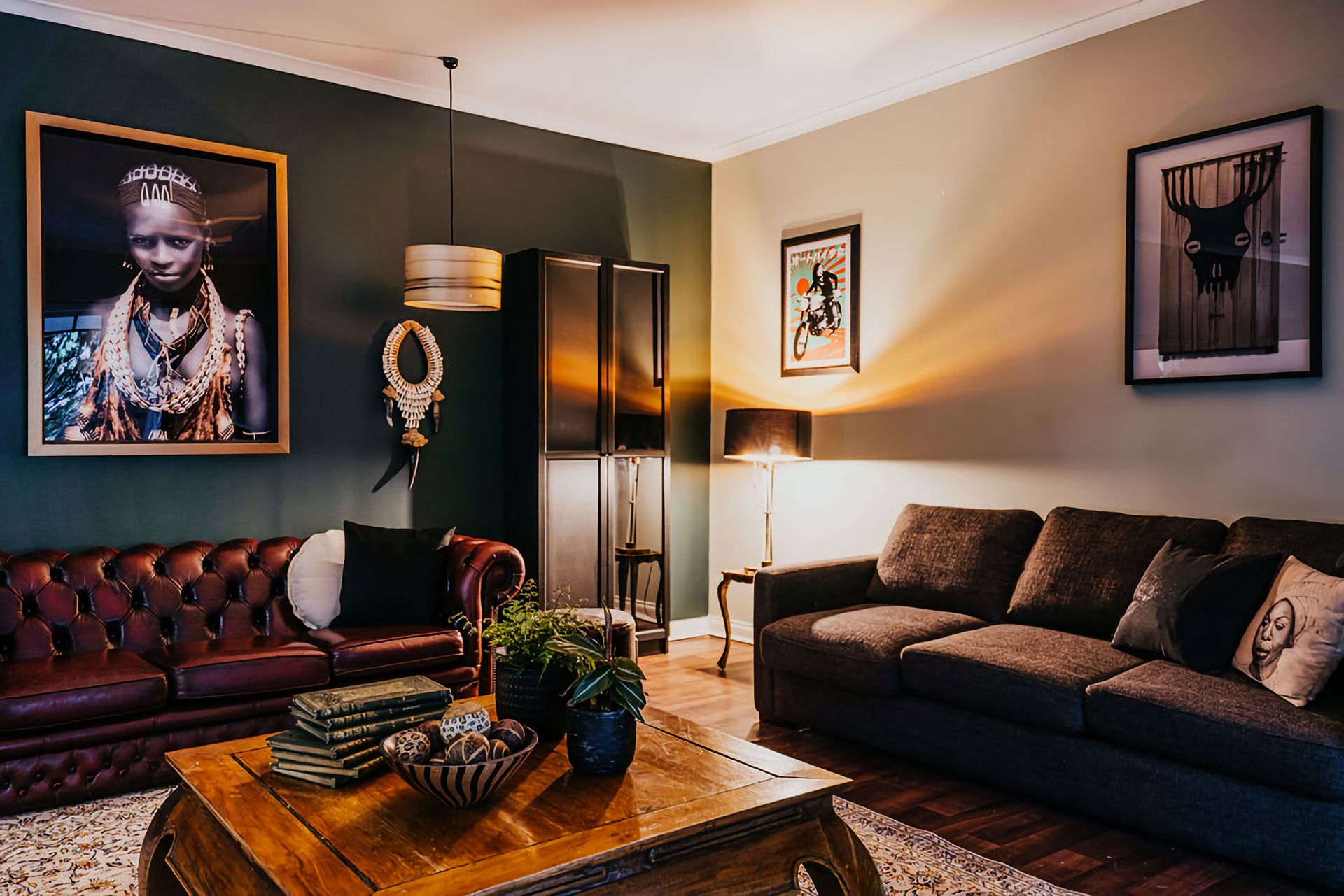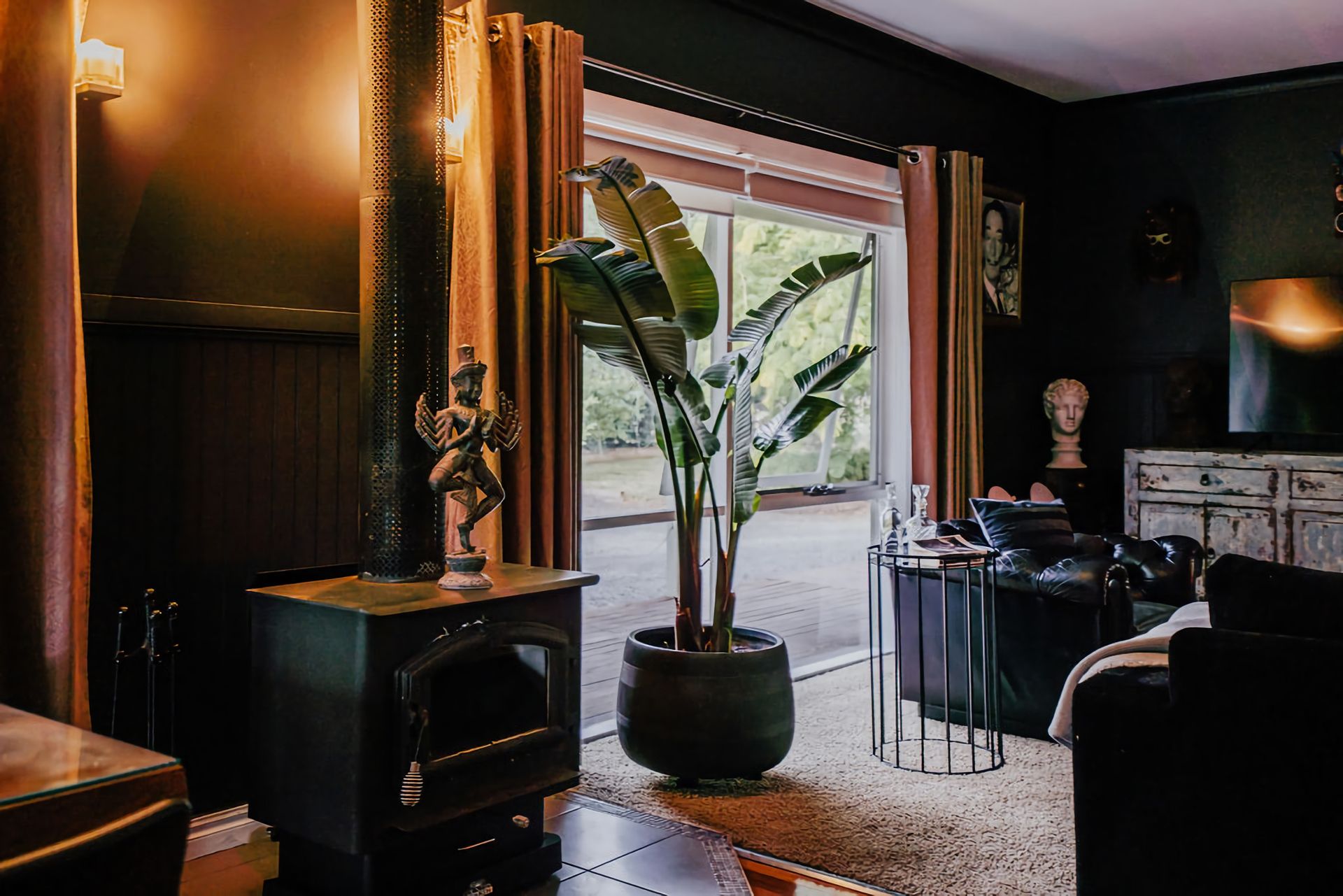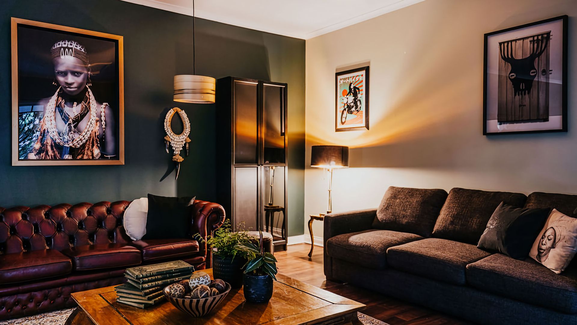 The dark walls and deep velour couches give this home a moody, contemporary edge. Coupled with the incredible array of curated artwork that pepper every wall and surface, Istana Lodge gives the feel of staying in a cosy local gallery. Along with statement furniture, indoor plants, and pops of colour, there is no shortage of elements to draw the eye.
