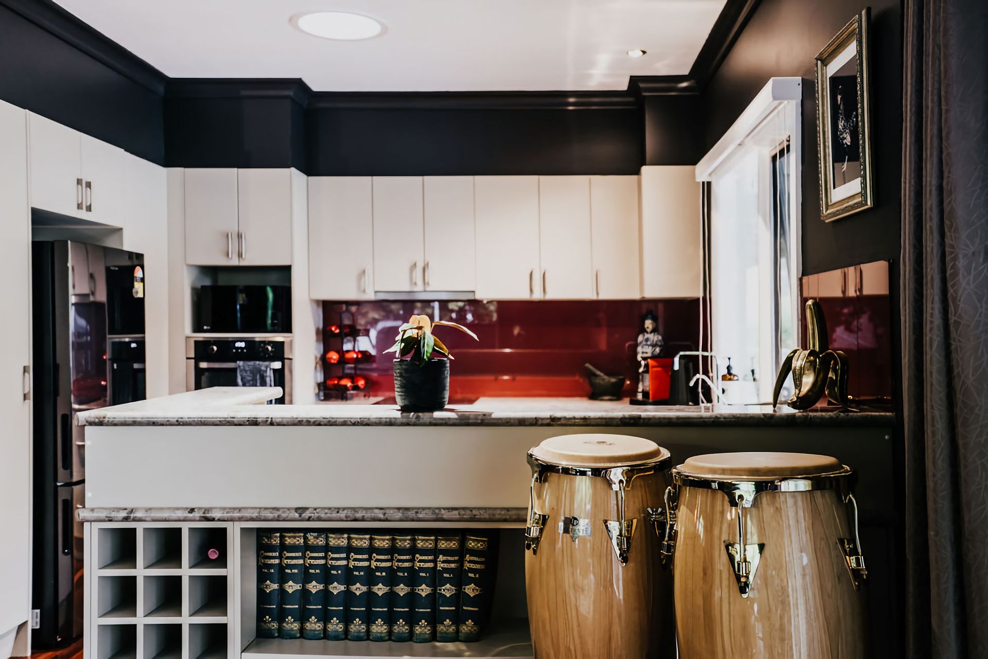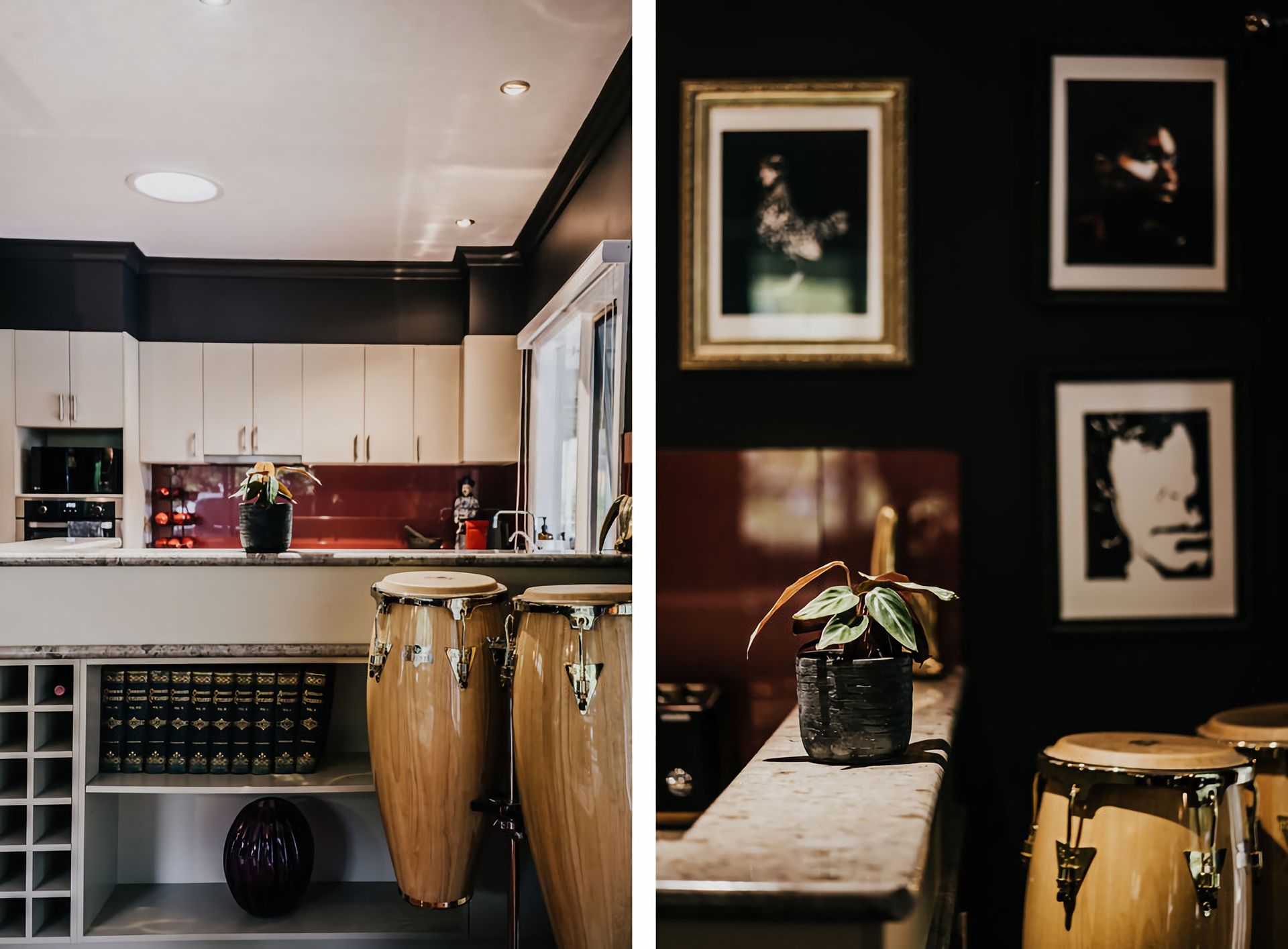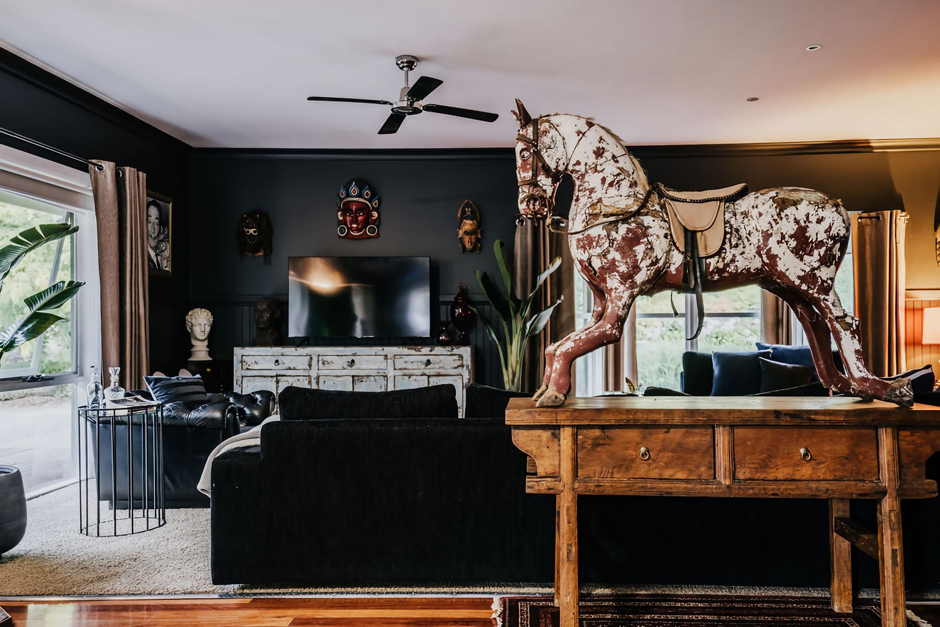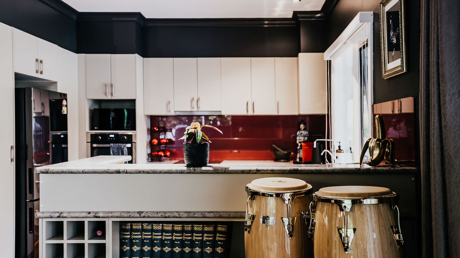 The dark walls and deep velour couches give this home a moody, contemporary edge. Coupled with the incredible array of curated artwork that pepper every wall and surface, Istana Lodge gives the feel of staying in a cosy local gallery. Along with statement furniture, indoor plants, and pops of colour, there is no shortage of elements to draw the eye.