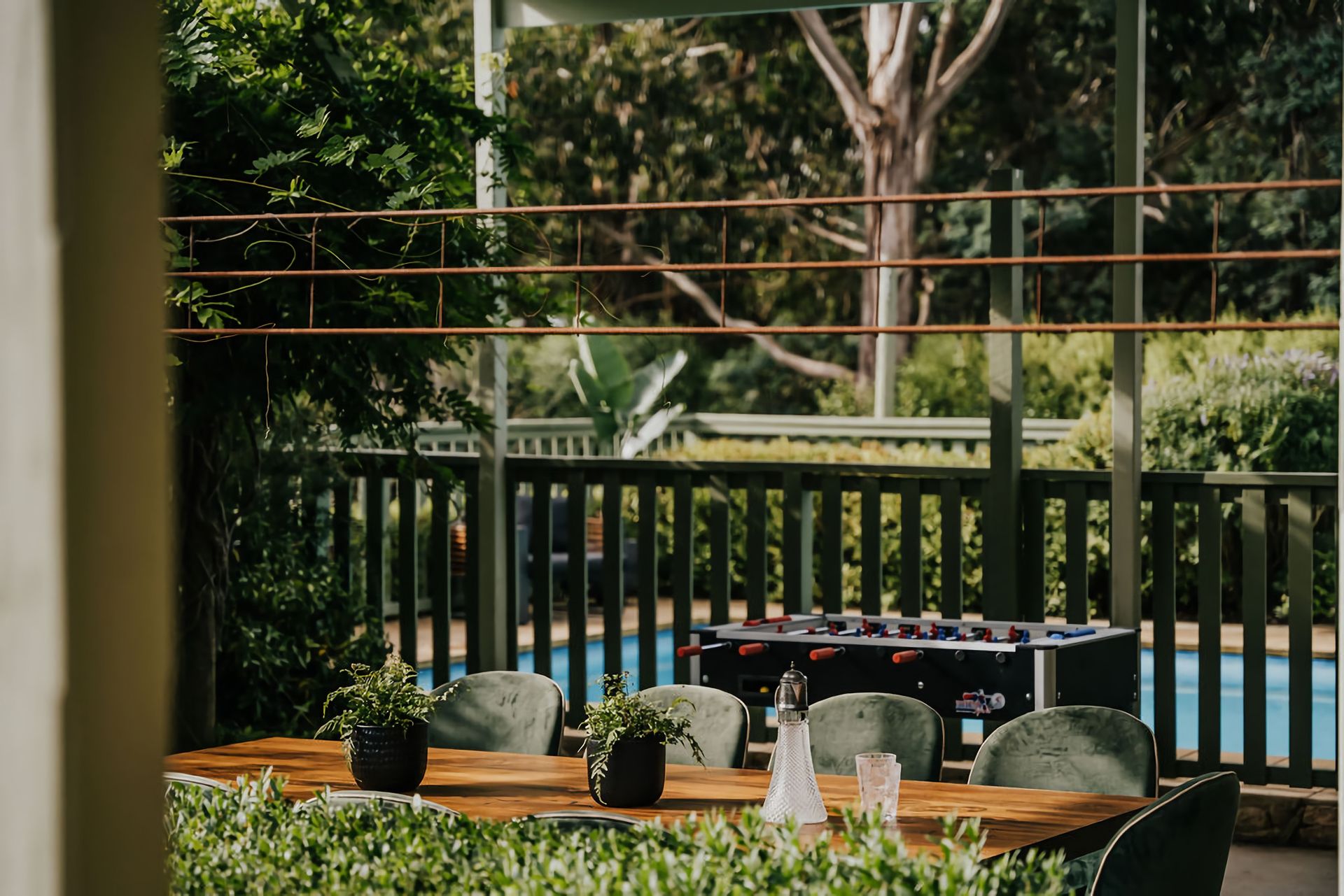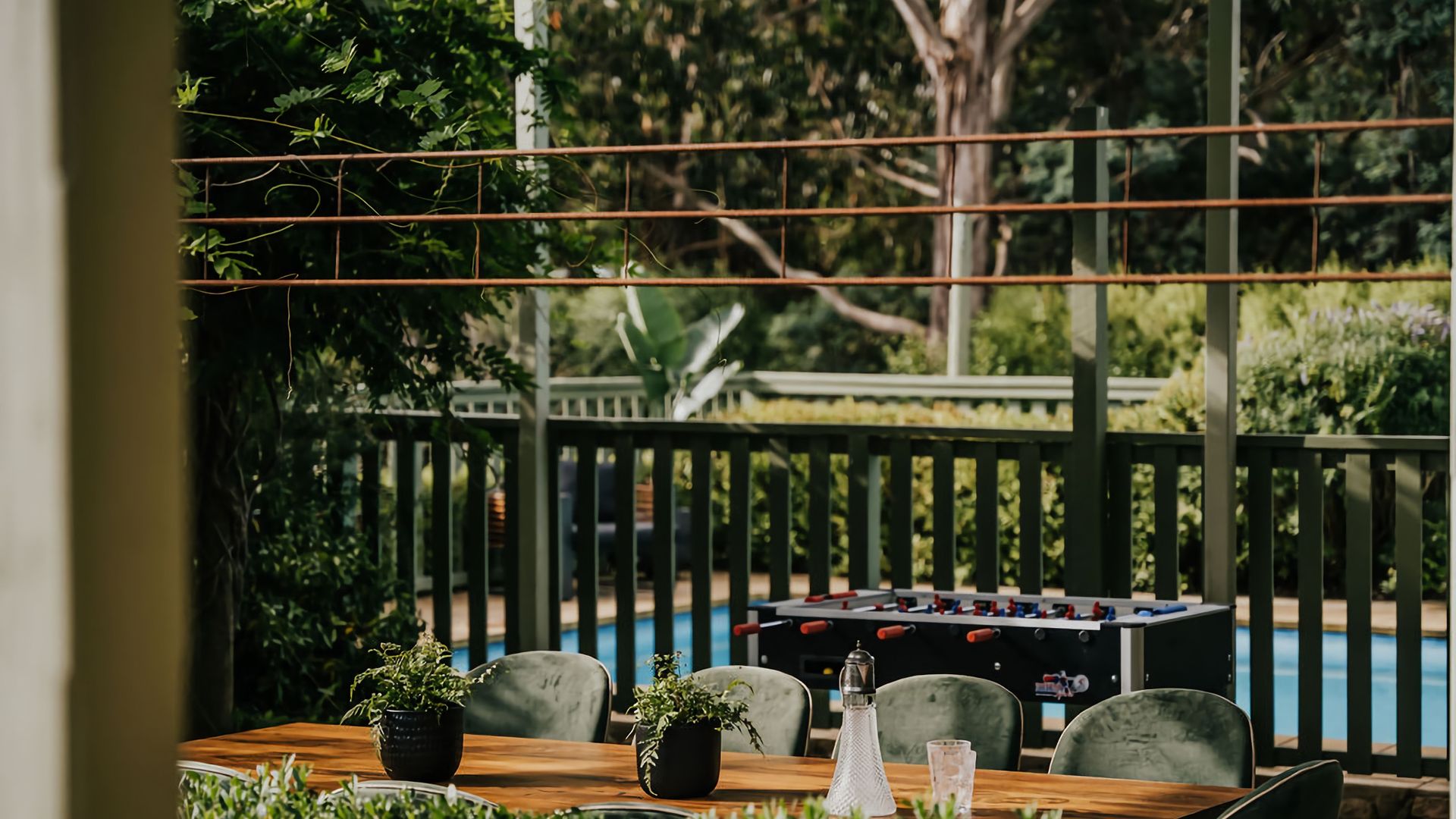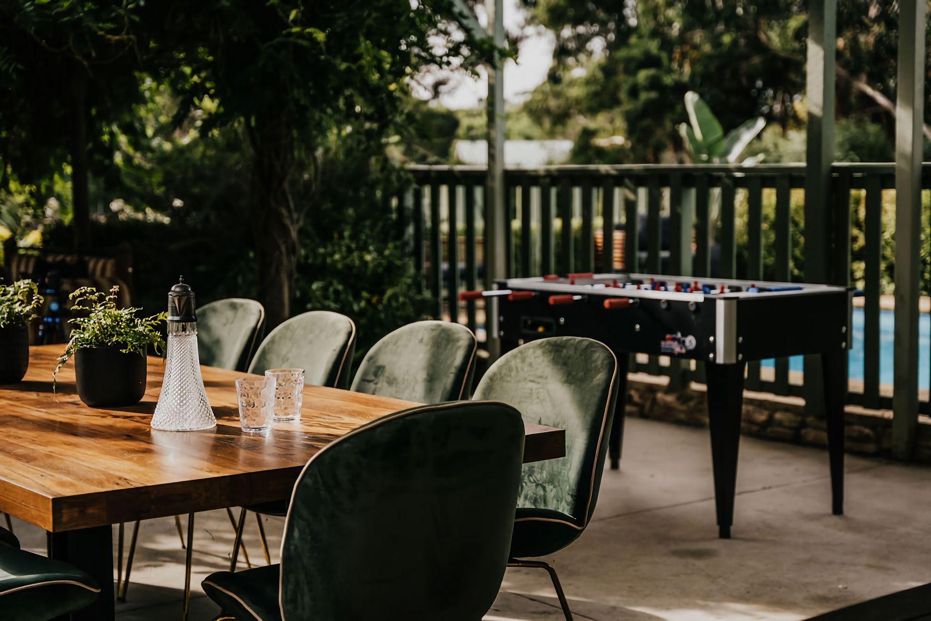 A sparkling outdoor pool invites you to take a dip, or lounge on the edge in the sun. For the chillier nights, an outdoor fire pit provides warmth and cosy comfort. A beautifully crafted large outdoor table makes this the perfect place for outdoor entertainment, along with a foosball table for those who want to bring their competitive streak along.