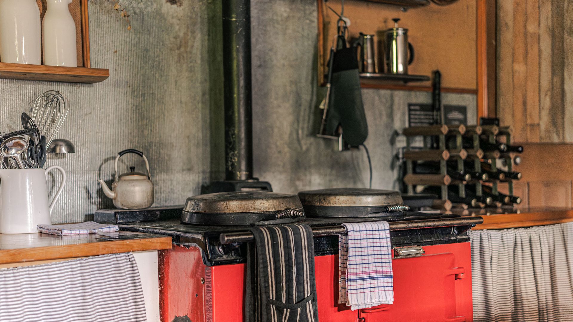 The adjoining kitchen and dining areas are equally stunning, with a wooden dining table flanked by handcrafted wicker chairs that add charm to every meal. The kitchen, designed to marry modern technology with a traditional aesthetic, is equipped with pristine AGA appliances, while cloth hangings replace cabinet doors, lending a nostalgic touch. This space ensures that both casual cooks and gourmet enthusiasts will feel at home, with every culinary need met.