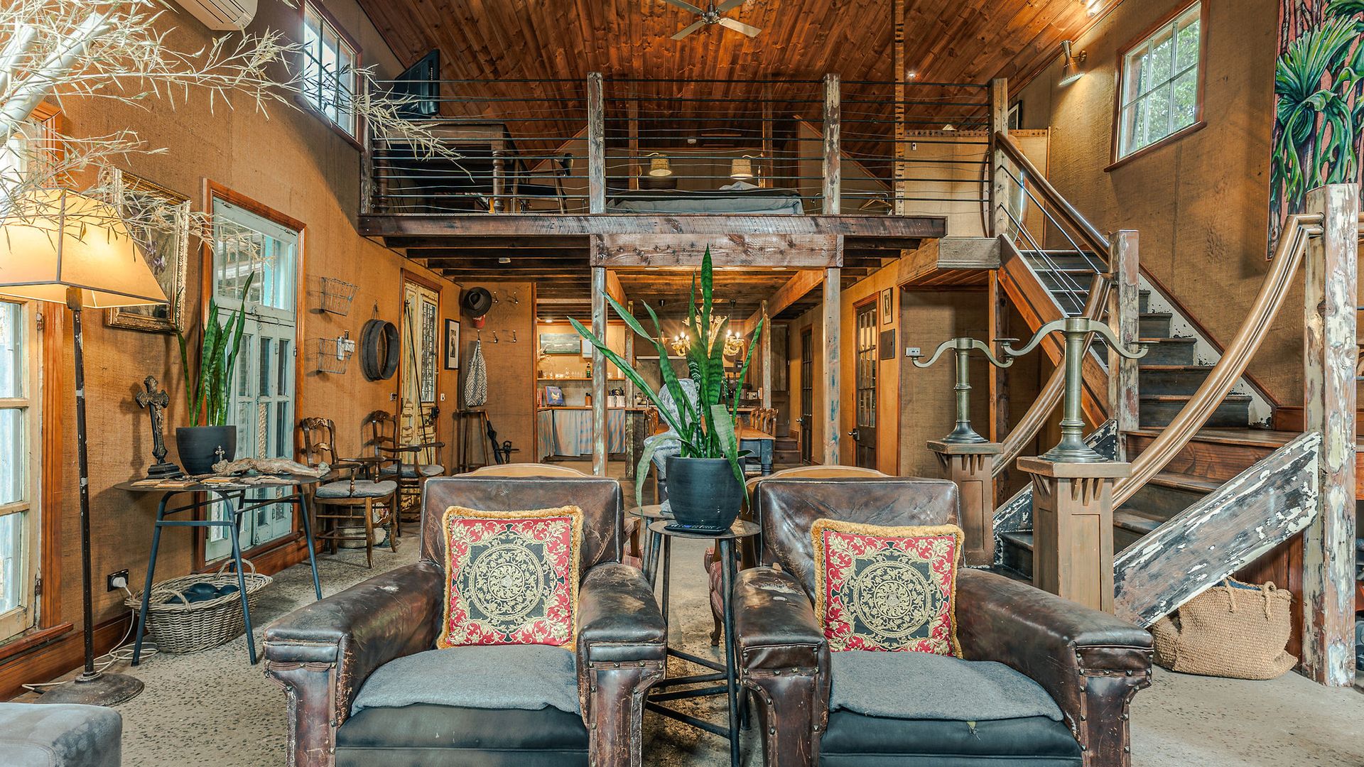 The unassuming weatherboard exterior conceals a thoughtfully curated interior, brimming with character. High ceilings adorned with polished wood create an atmosphere of warm grandeur, while the open-plan living and dining area invites relaxation. At one end of the room, a substantial gas log fire offers warmth and comfort, ideal for cozy evenings. Plush leather couches and rustic wooden furniture blend seamlessly with contemporary art and eclectic sculptures, providing a delightful visual experience.