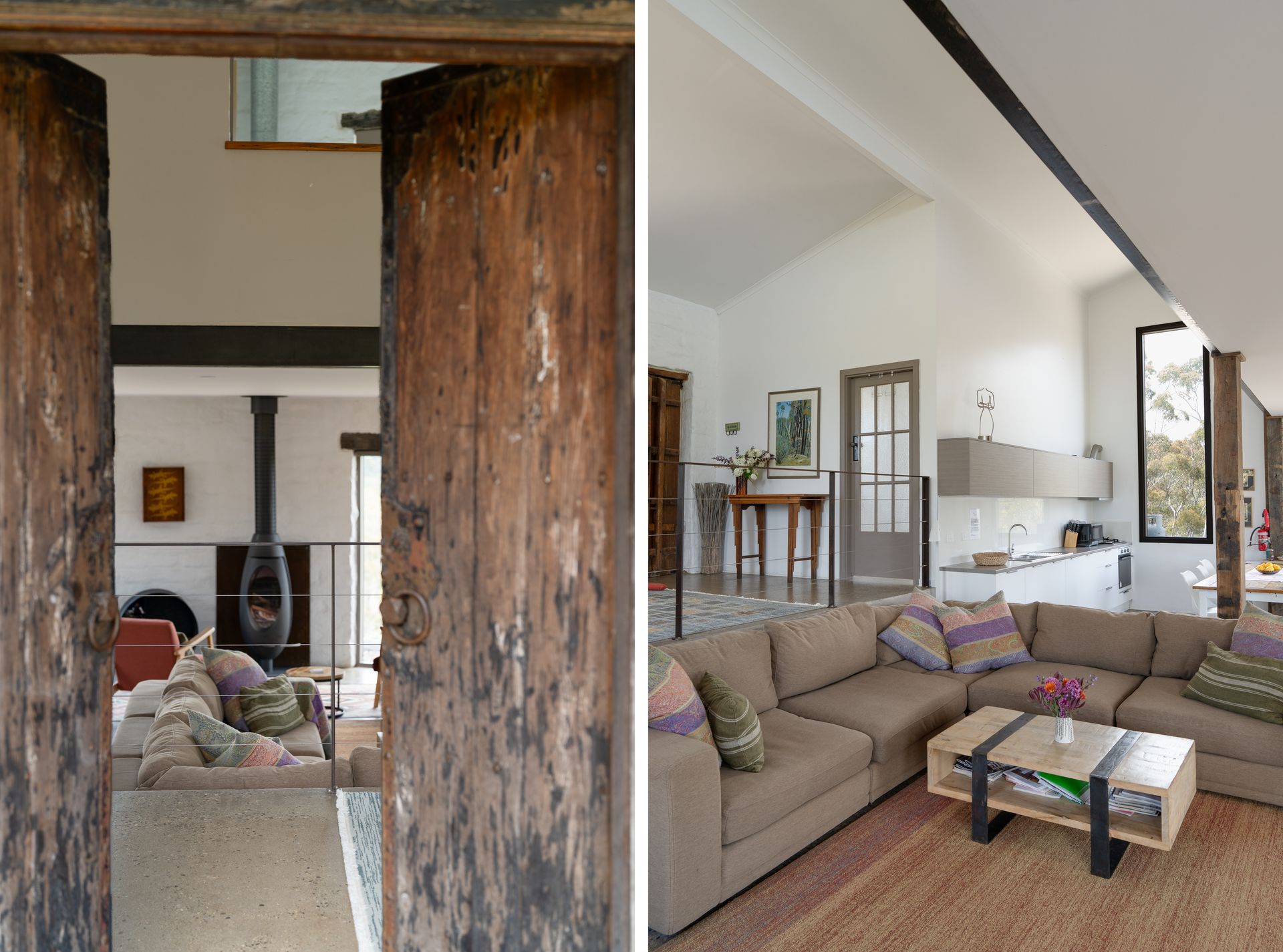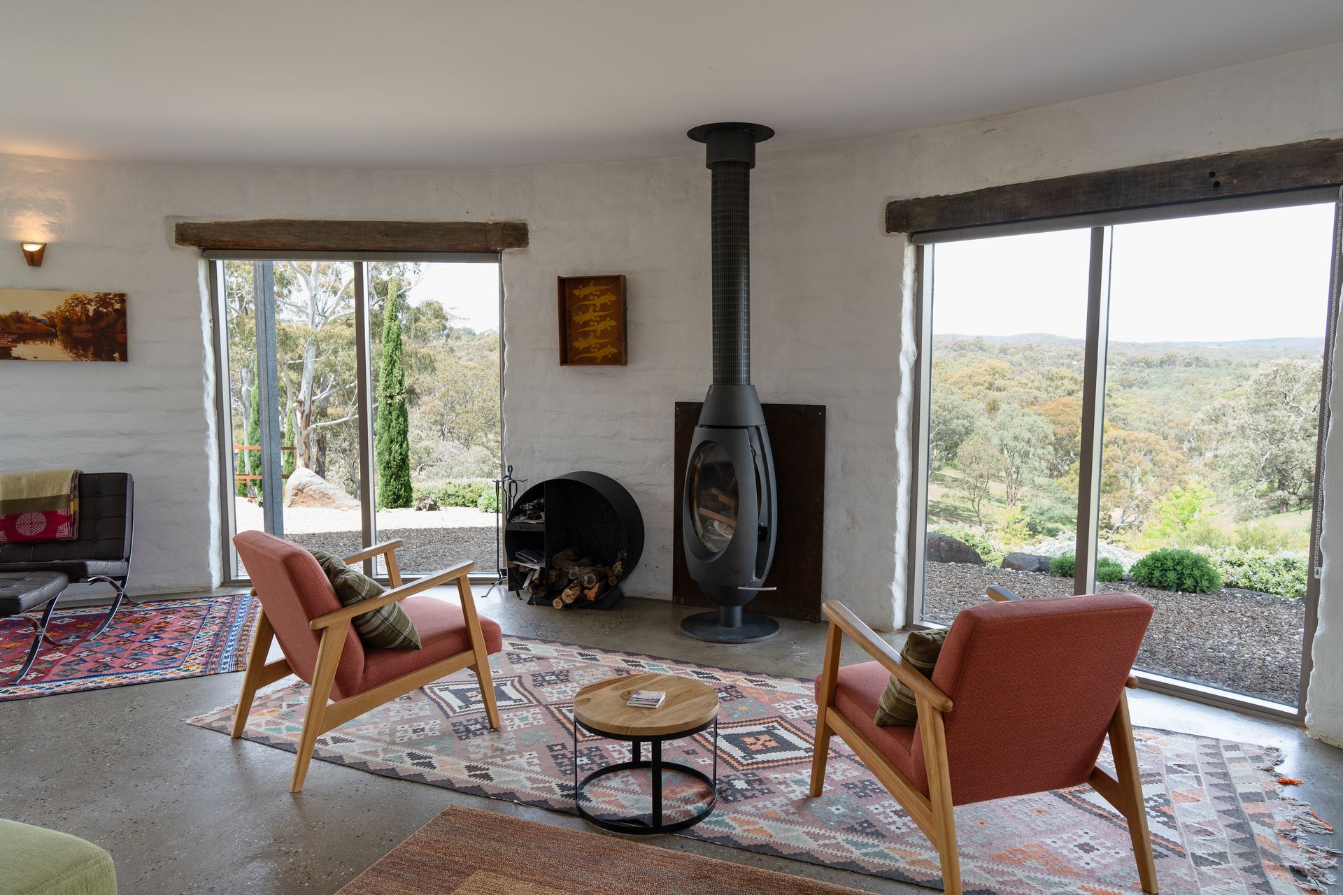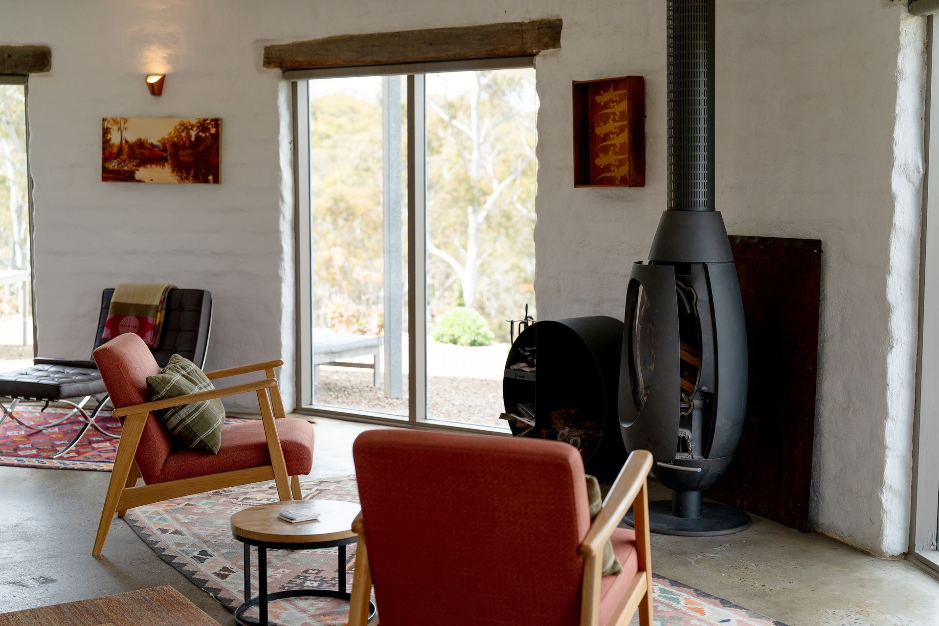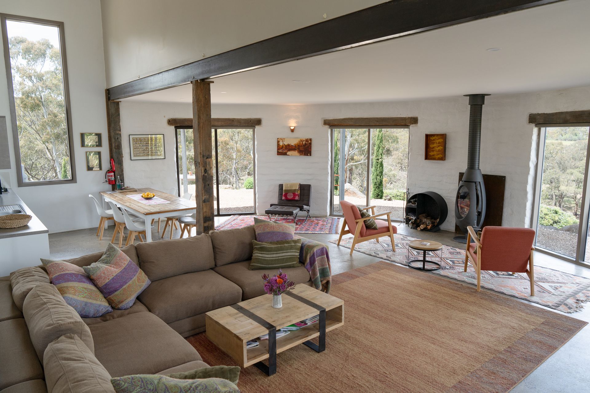 Lithia Guest House boasts an open-plan interior across two levels, illuminated throughout by natural light. Inspired by its design, the interior of the home offers north-facing views of the gorgeous Shepherd’s Flat, some of Victoria’s most vibrant bushland. An elliptical wood-burning fire on the ground floor invites guests to gather around on a cold winter’s night to enjoy the warmth, as well as the views from the lounge. Eclectic furnishings blend a clean, modern aesthetic with a countryside feel. Exposed wooden supports and bespoke, rustic doors complement the sleeker design elements.