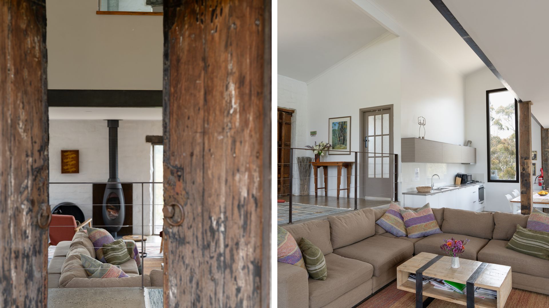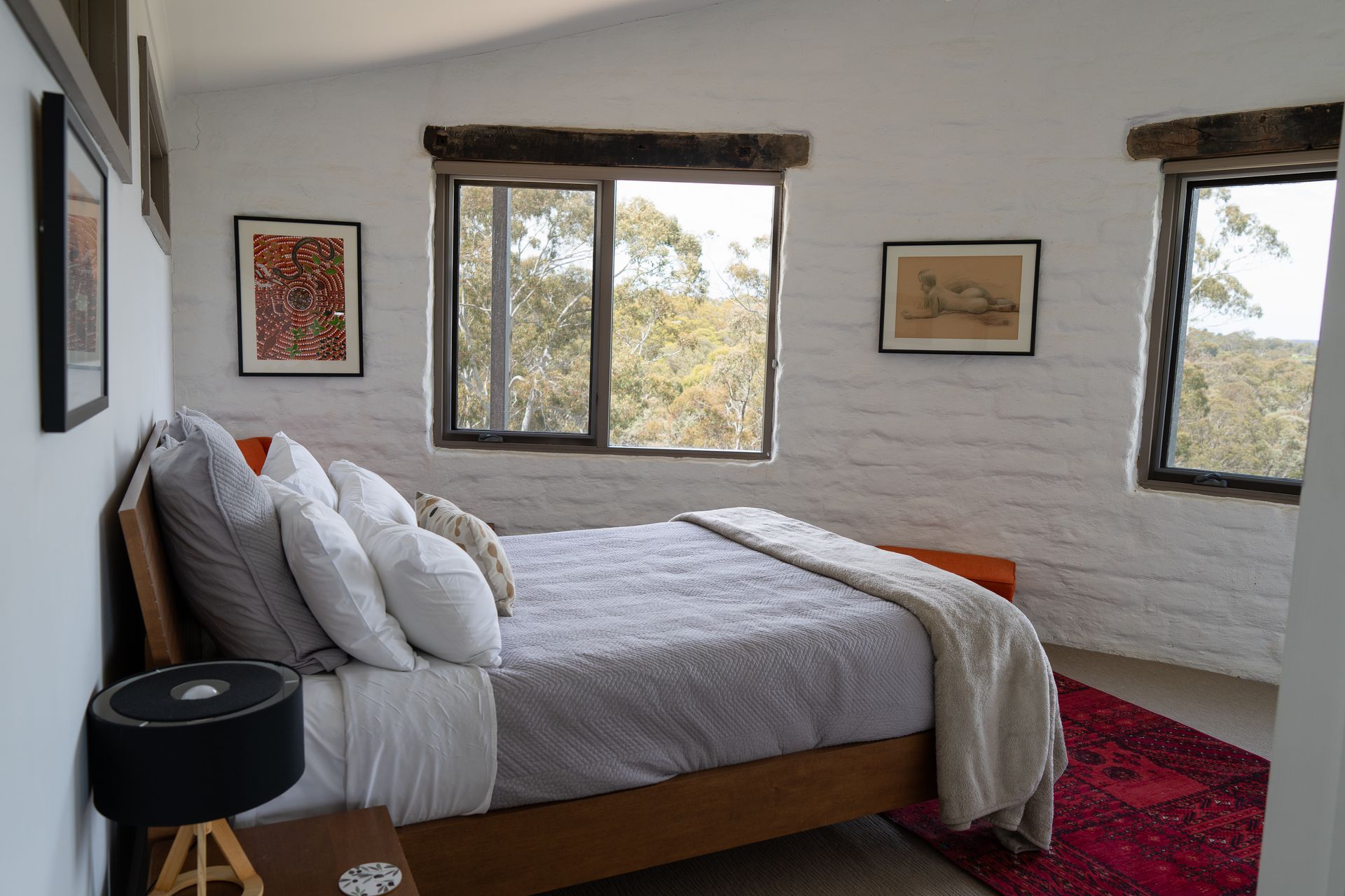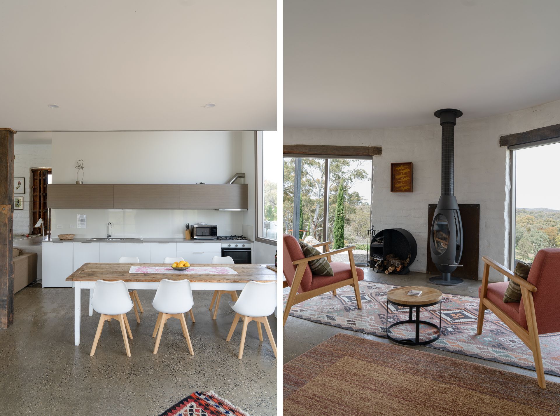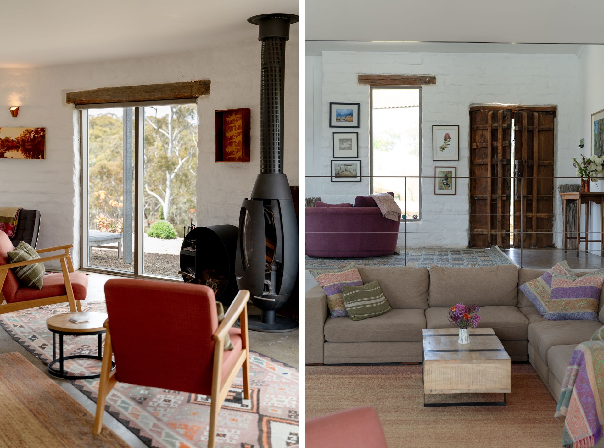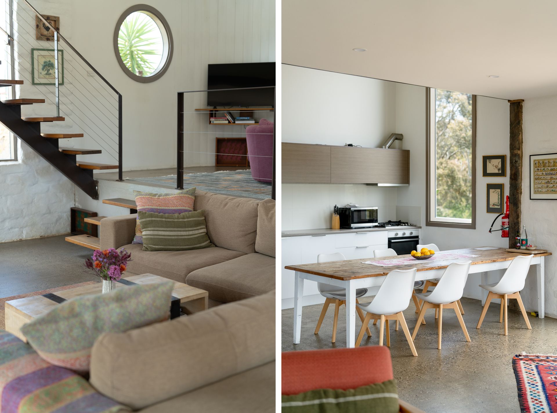 Lithia Guest House boasts an open-plan interior across two levels, illuminated throughout by natural light. Inspired by its design, the interior of the home offers north-facing views of the gorgeous Shepherd’s Flat, some of Victoria’s most vibrant bushland. An elliptical wood-burning fire on the ground floor invites guests to gather around on a cold winter’s night to enjoy the warmth, as well as the views from the lounge. Eclectic furnishings blend a clean, modern aesthetic with a countryside feel. Exposed wooden supports and bespoke, rustic doors complement the sleeker design elements.