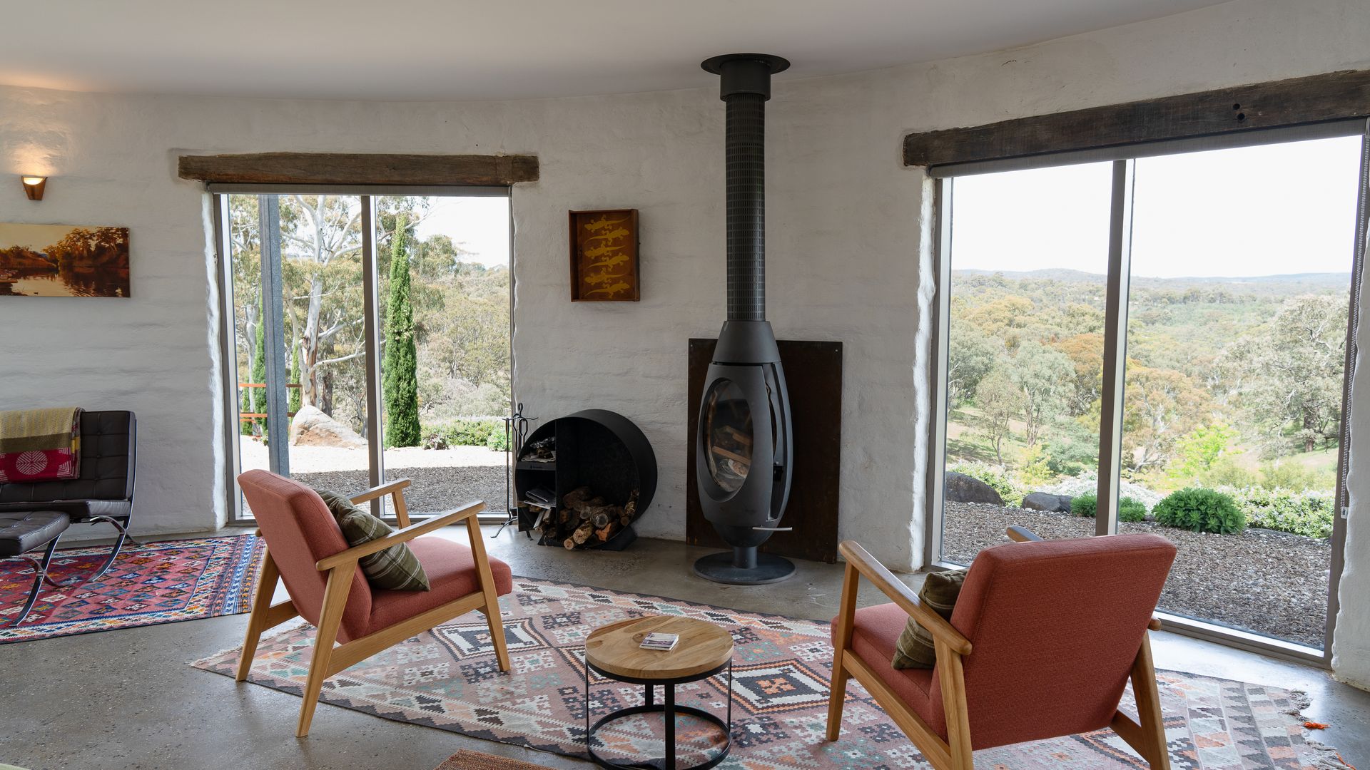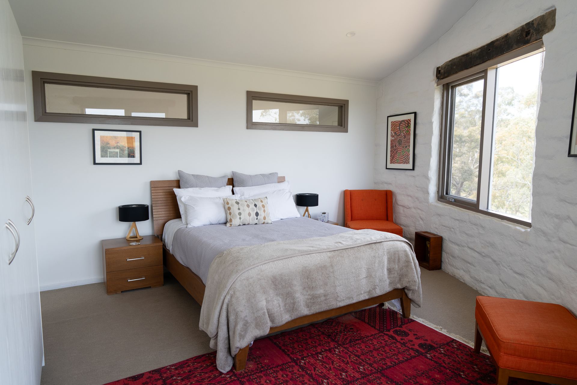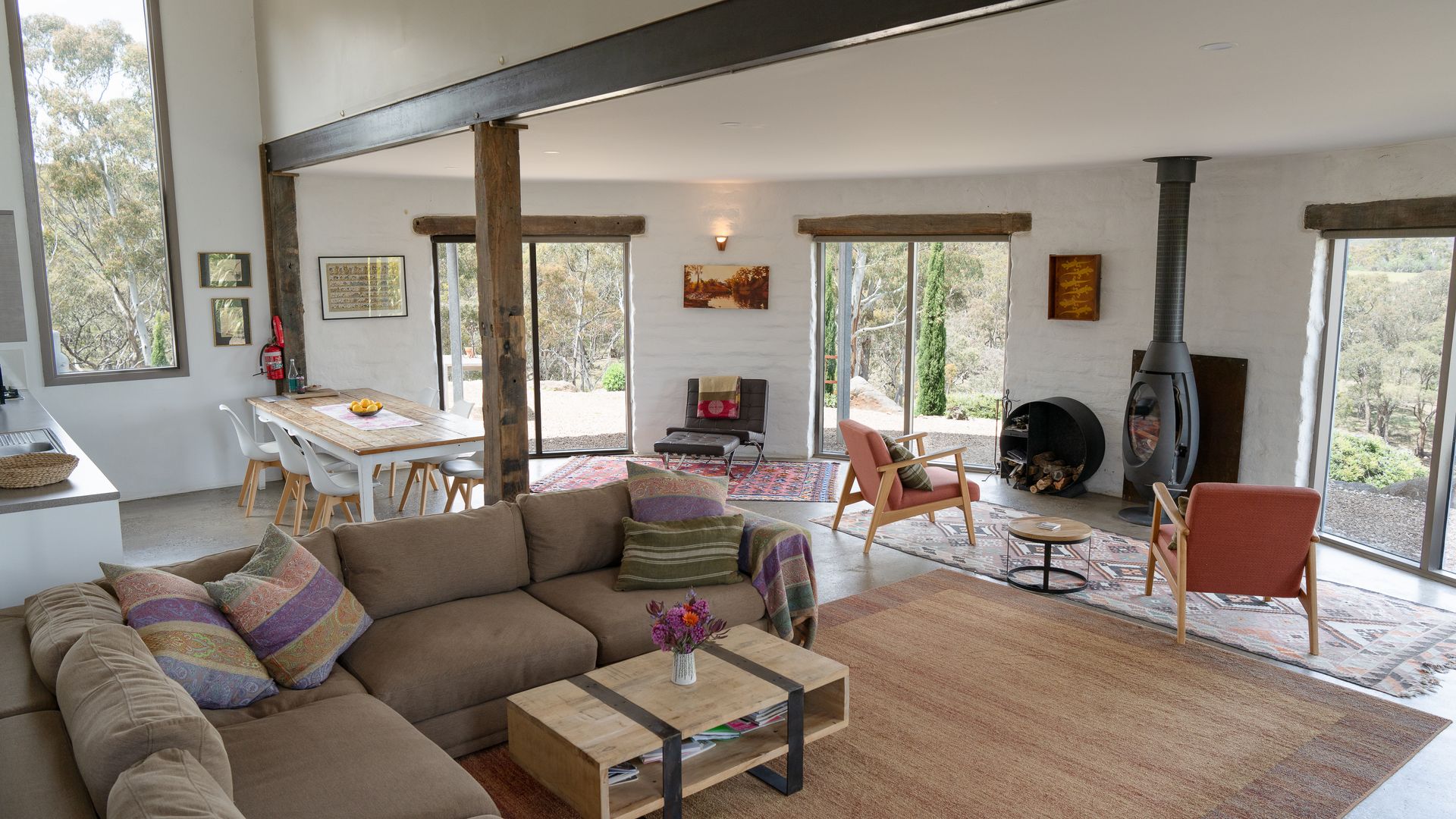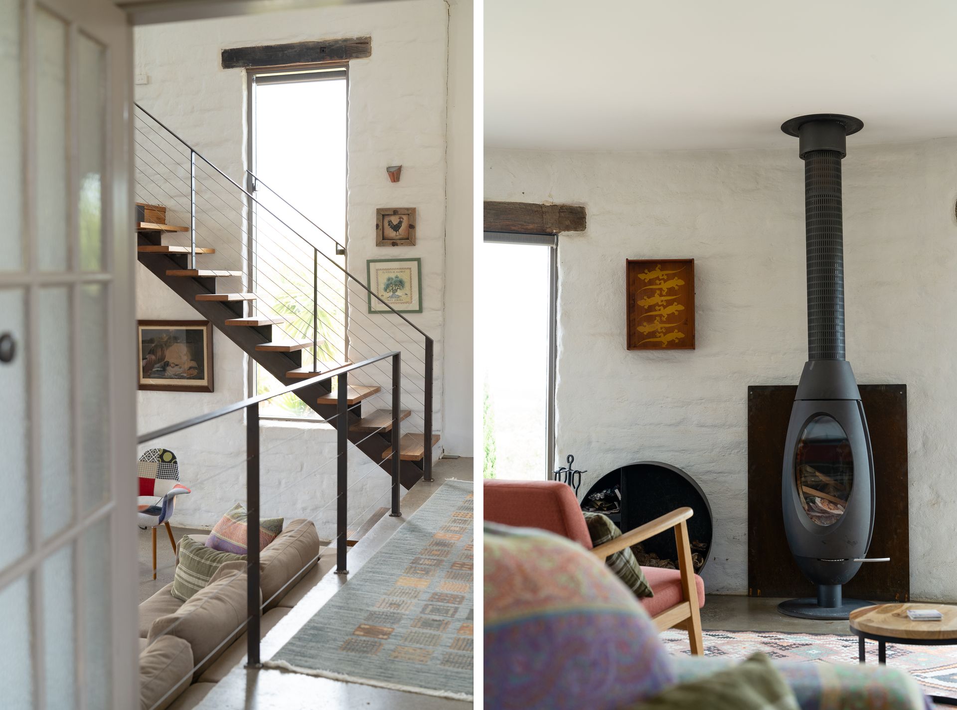Lithia Guest House boasts an open-plan interior across two levels, illuminated throughout by natural light. Inspired by its design, the interior of the home offers north-facing views of the gorgeous Shepherd’s Flat, some of Victoria’s most vibrant bushland. An elliptical wood-burning fire on the ground floor invites guests to gather around on a cold winter’s night to enjoy the warmth, as well as the views from the lounge. Eclectic furnishings blend a clean, modern aesthetic with a countryside feel. Exposed wooden supports and bespoke, rustic doors complement the sleeker design elements.