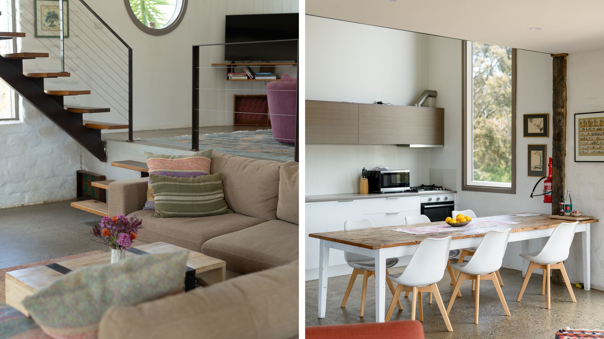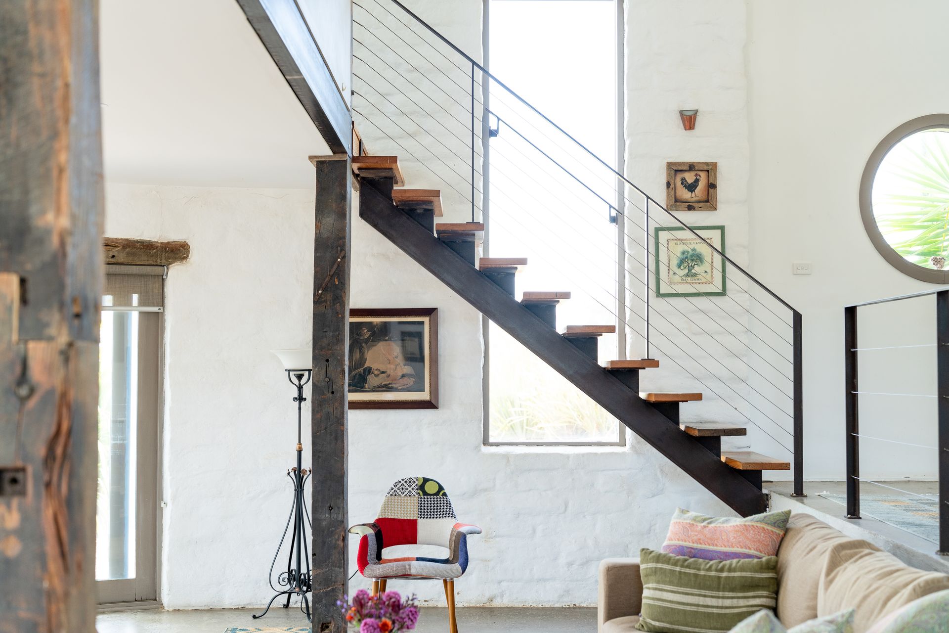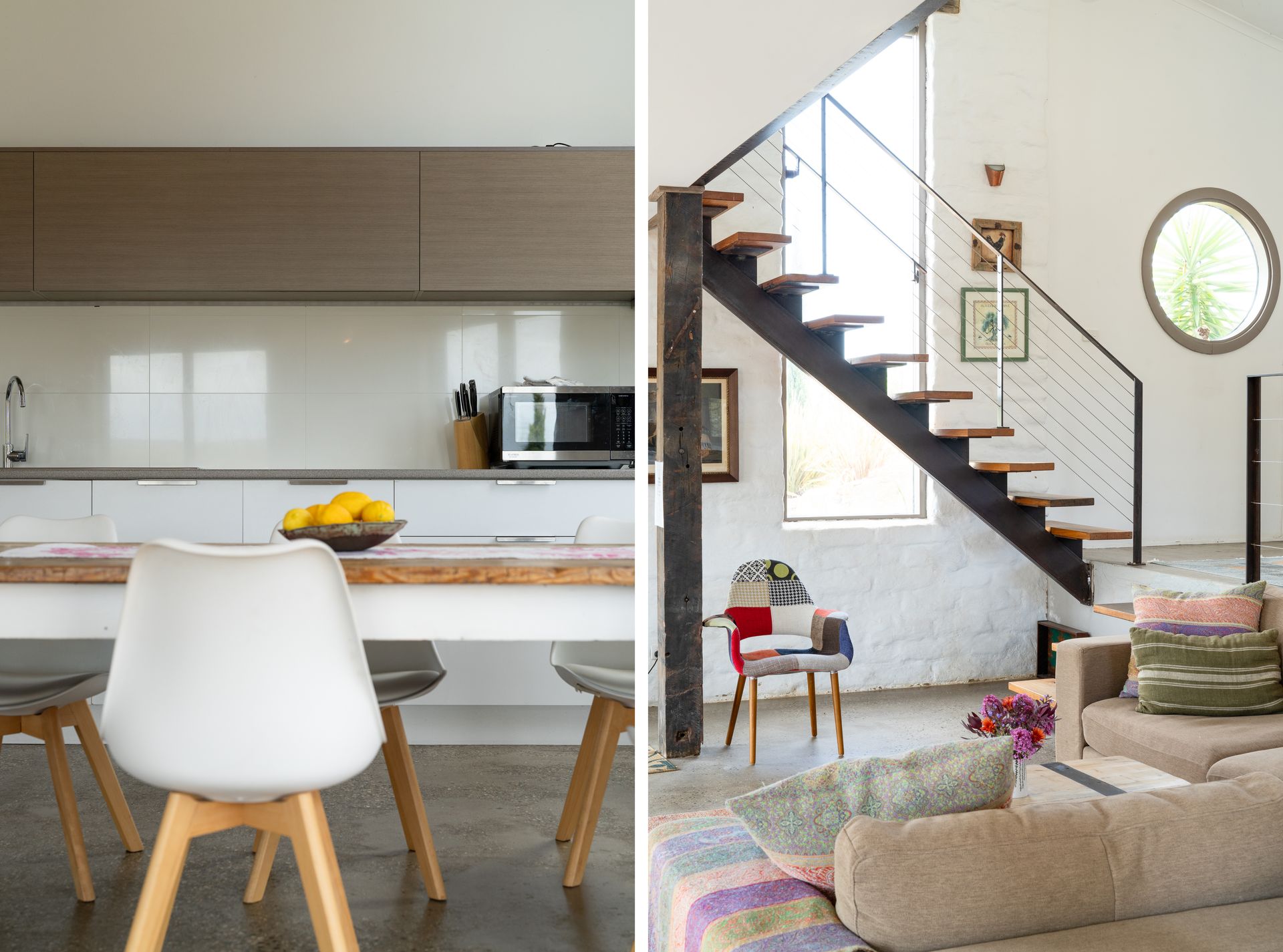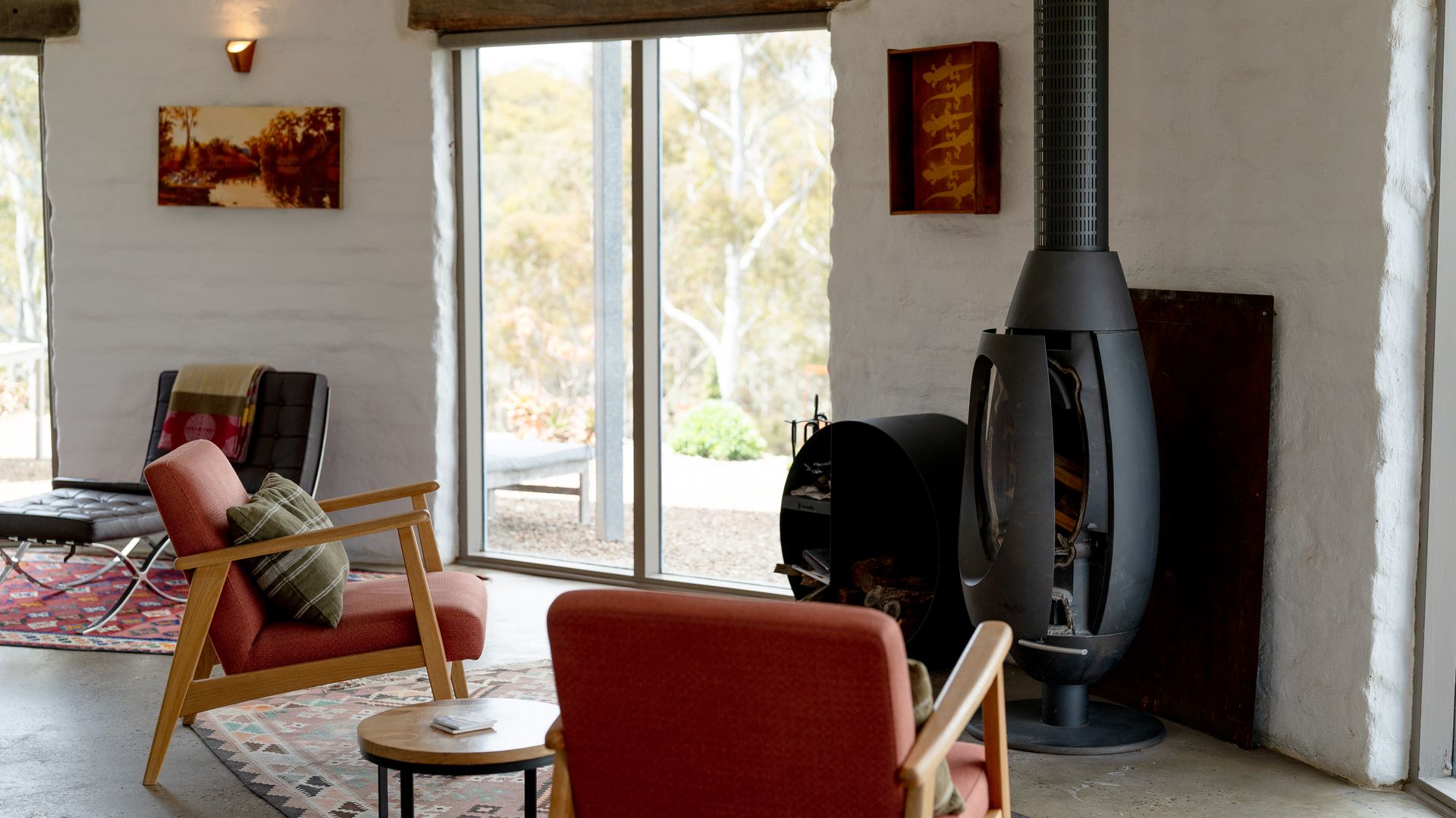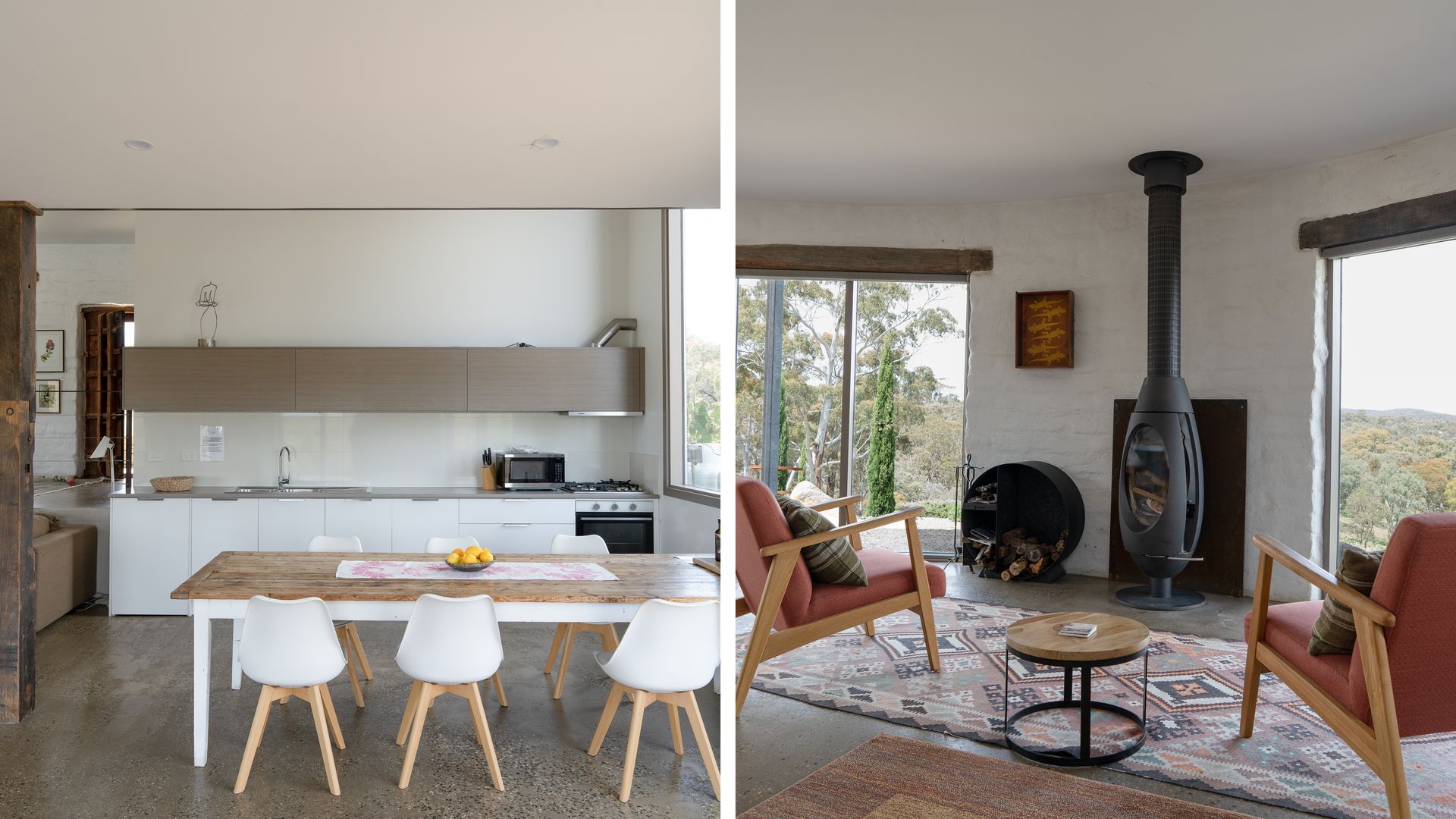 Lithia Guest House boasts an open-plan interior across two levels, illuminated throughout by natural light. Inspired by its design, the interior of the home offers north-facing views of the gorgeous Shepherd’s Flat, some of Victoria’s most vibrant bushland. An elliptical wood-burning fire on the ground floor invites guests to gather around on a cold winter’s night to enjoy the warmth, as well as the views from the lounge. Eclectic furnishings blend a clean, modern aesthetic with a countryside feel. Exposed wooden supports and bespoke, rustic doors complement the sleeker design elements.