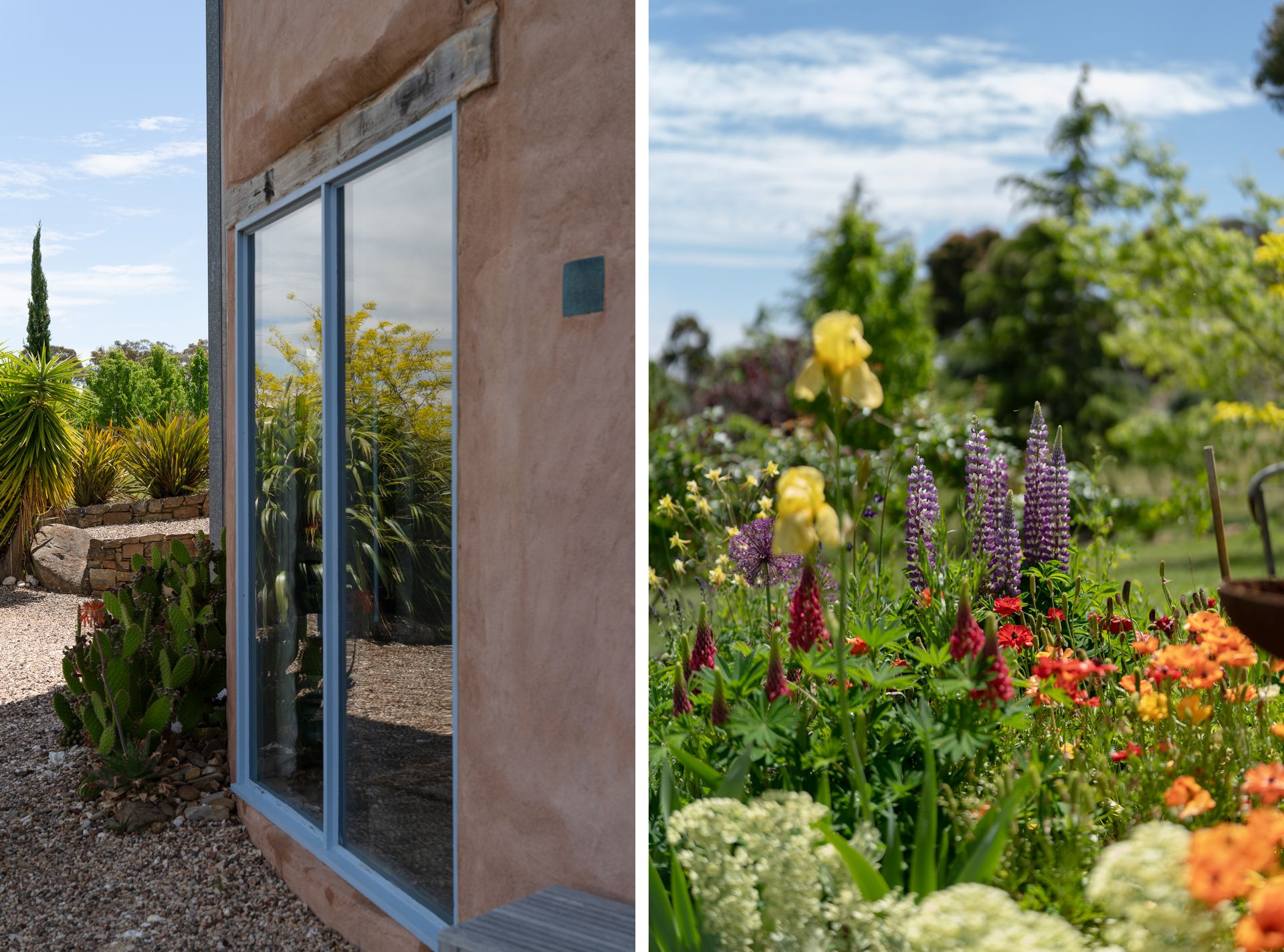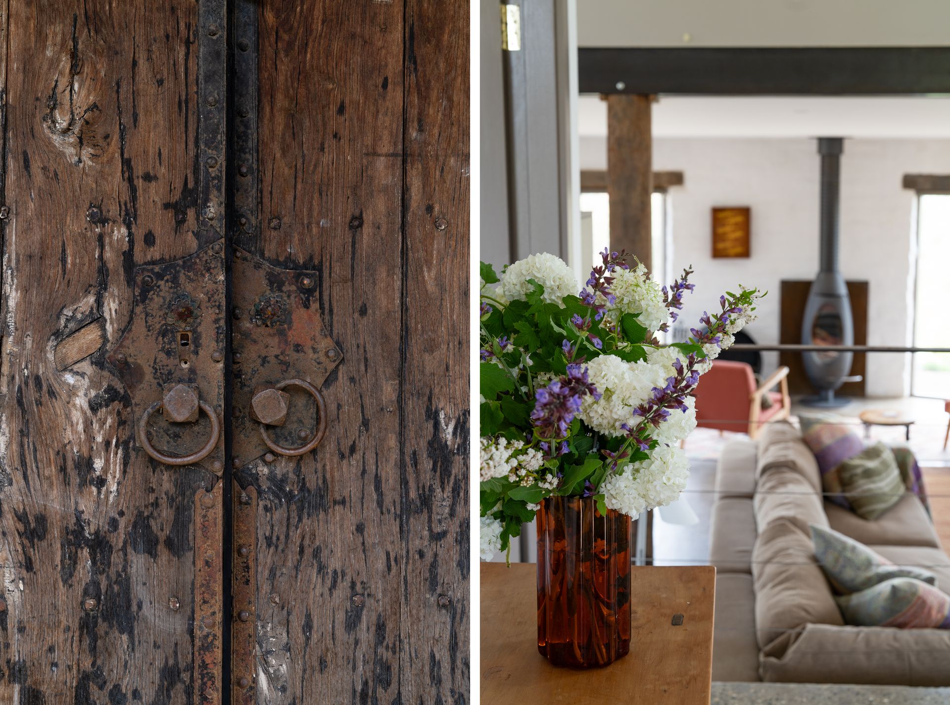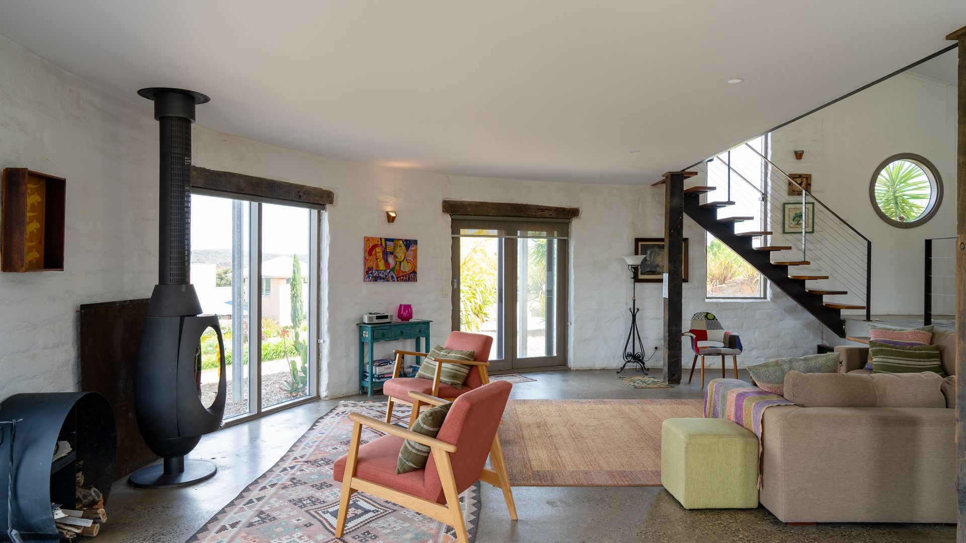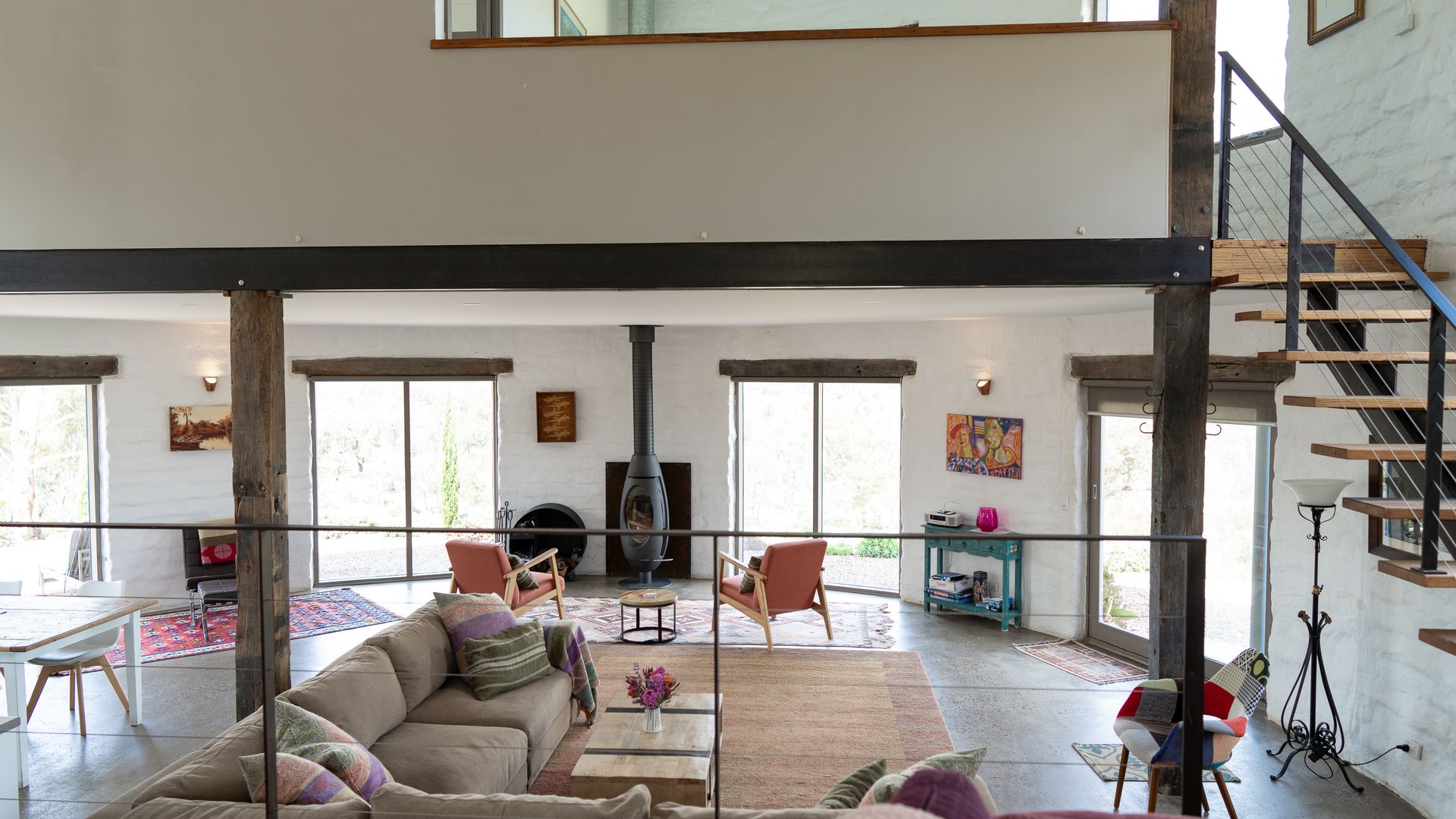 Lithia Guest House boasts an open-plan interior across two levels, illuminated throughout by natural light. Inspired by its design, the interior of the home offers north-facing views of the gorgeous Shepherd’s Flat, some of Victoria’s most vibrant bushland. An elliptical wood-burning fire on the ground floor invites guests to gather around on a cold winter’s night to enjoy the warmth, as well as the views from the lounge. Eclectic furnishings blend a clean, modern aesthetic with a countryside feel. Exposed wooden supports and bespoke, rustic doors complement the sleeker design elements.