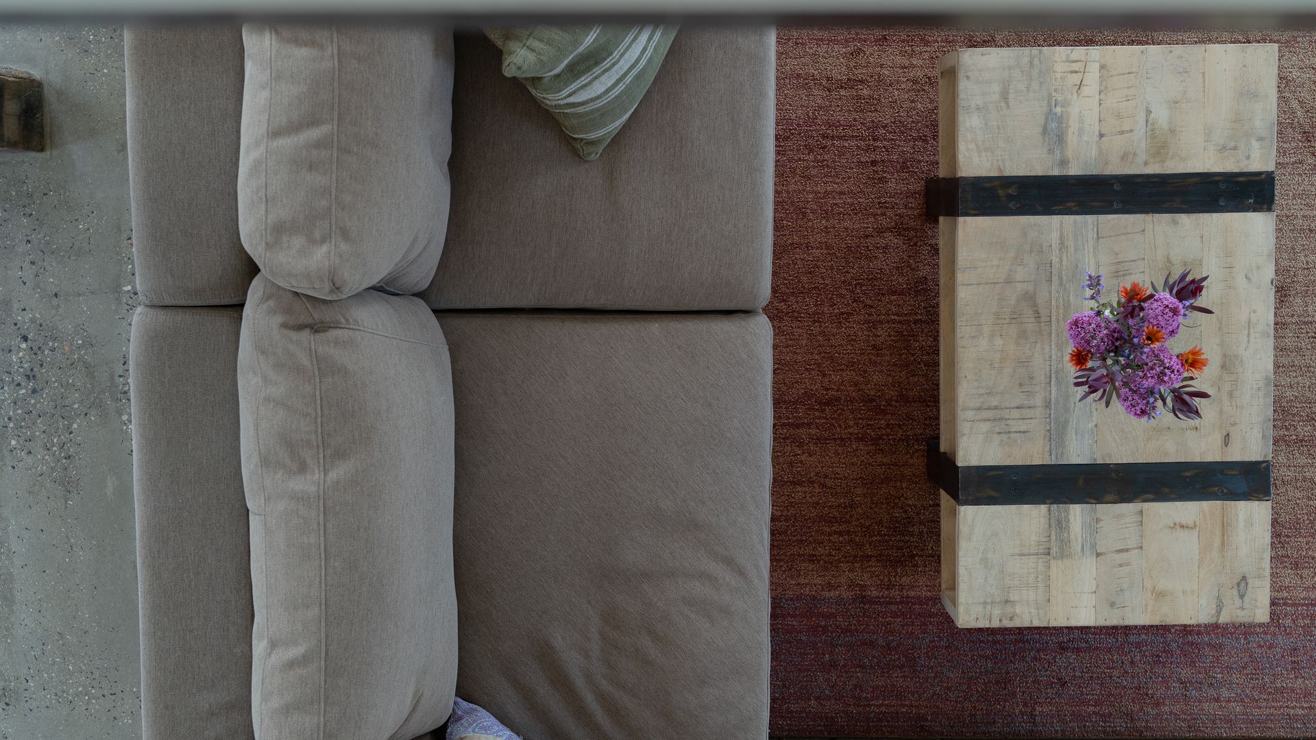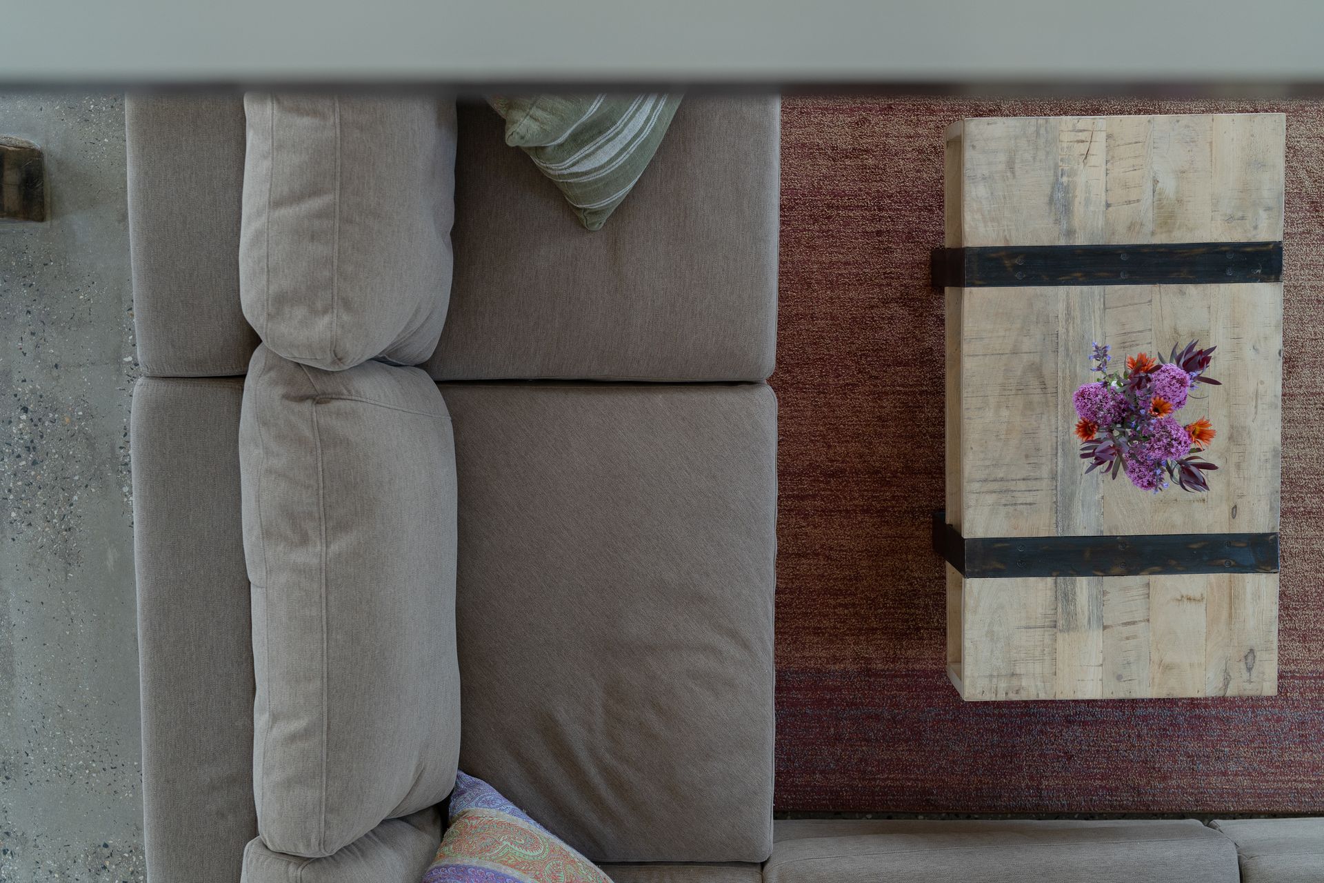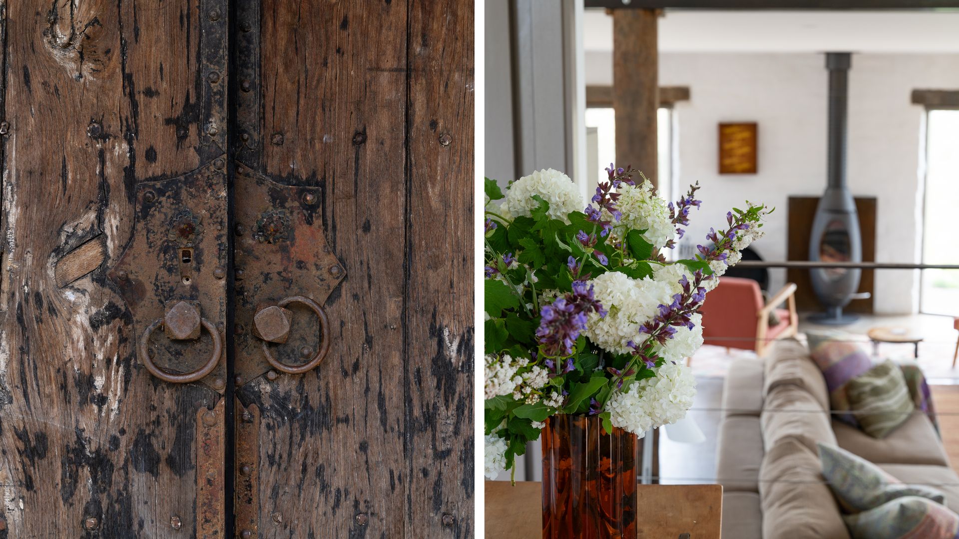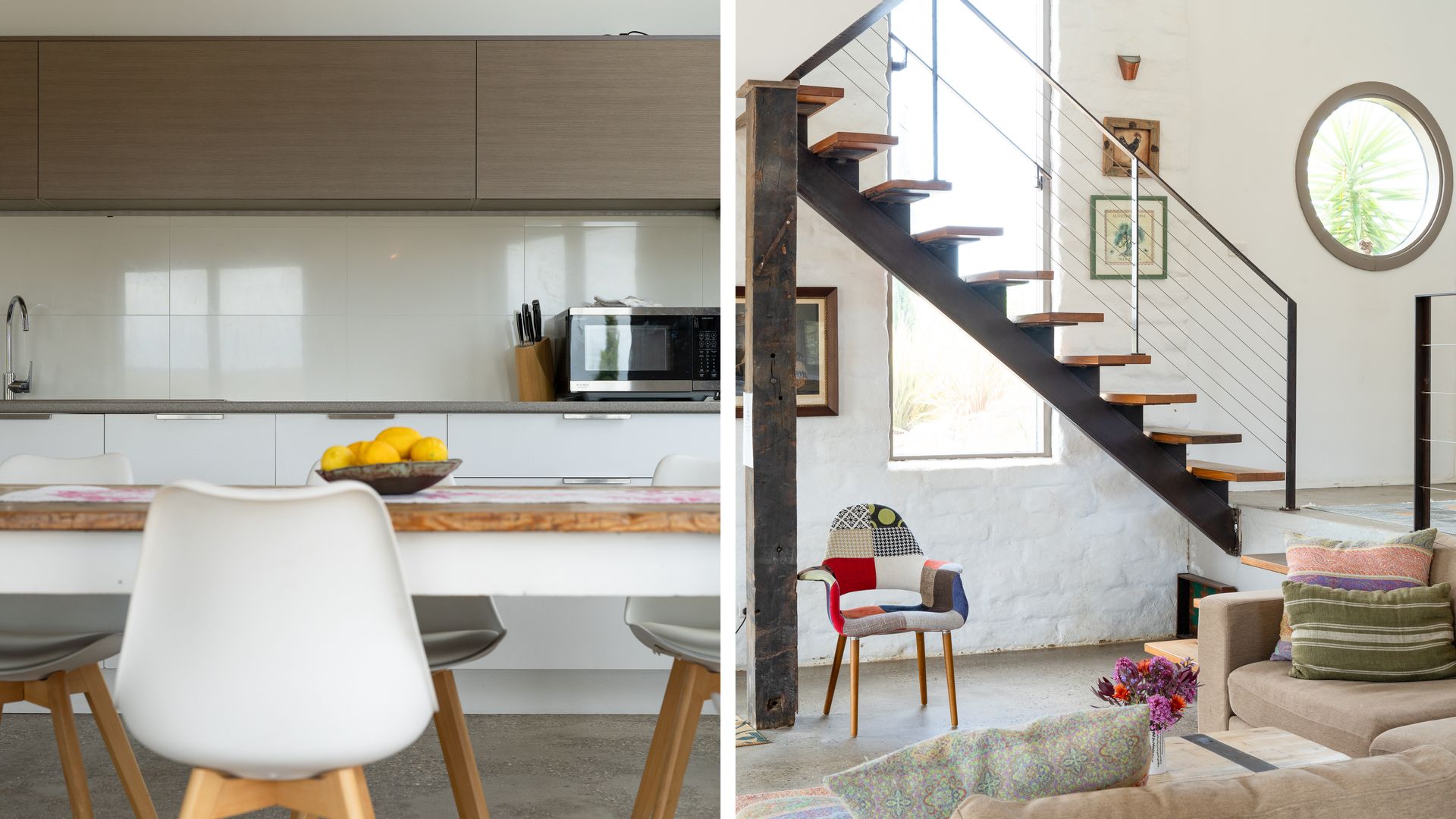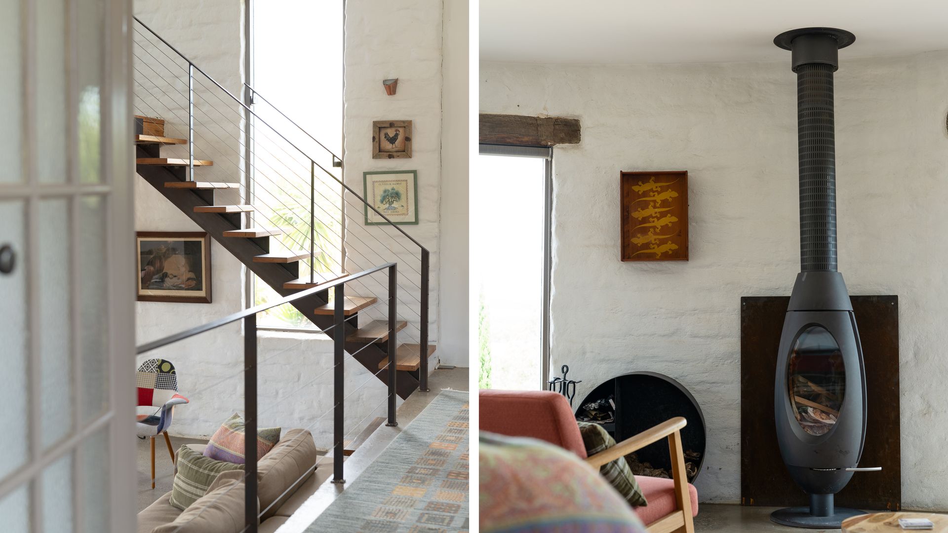 Lithia Guest House boasts an open-plan interior across two levels, illuminated throughout by natural light. Inspired by its design, the interior of the home offers north-facing views of the gorgeous Shepherd’s Flat, some of Victoria’s most vibrant bushland. An elliptical wood-burning fire on the ground floor invites guests to gather around on a cold winter’s night to enjoy the warmth, as well as the views from the lounge. Eclectic furnishings blend a clean, modern aesthetic with a countryside feel. Exposed wooden supports and bespoke, rustic doors complement the sleeker design elements.
