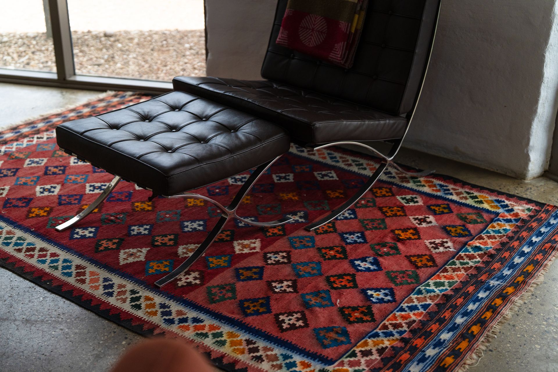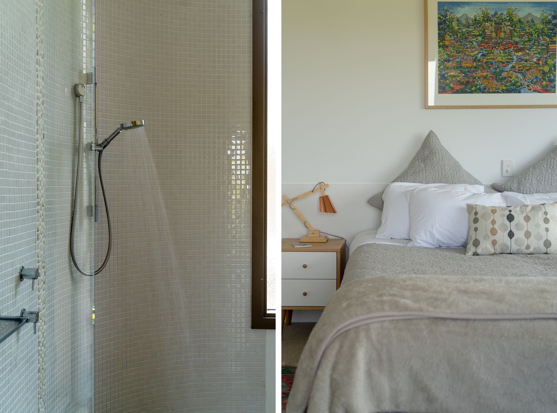 Colourful rugs pop against the clean white walls, adorned by lovely artwork. A modern kitchen brings all the comforts of home, with the charming dining table within arm’s reach. The adjoining lounge area offers large, comfy couches and a TV, though many prefer to simply enjoy the sunsets. Stairs lead up to the mezzanine level, where the master bedroom can be found. Both bedrooms offer striking views of the country and welcome the natural light. Like the rest of the home, these rooms are fashionably furnished and beautiful artworks are mounted on the walls. One offers a king bed, and the other a queen. Similarly, the bathroom is appointed with both quality and style and features a walk-in shower.