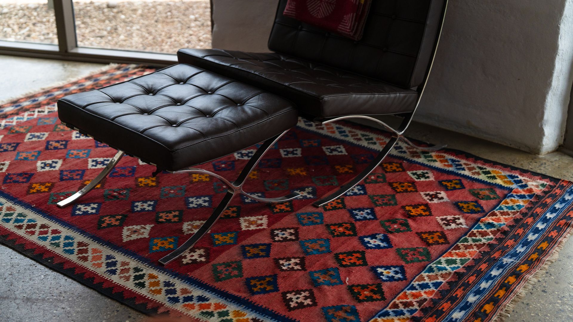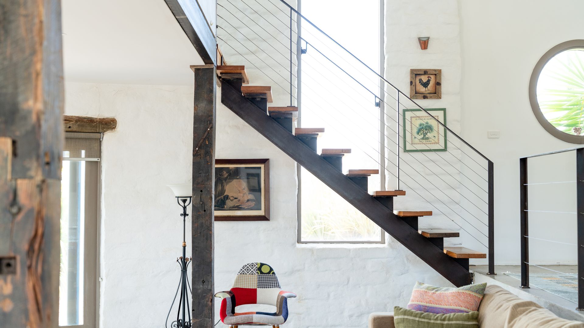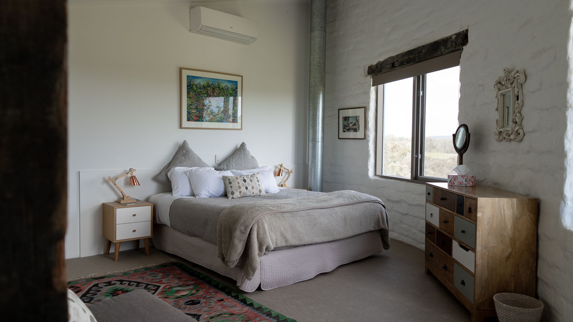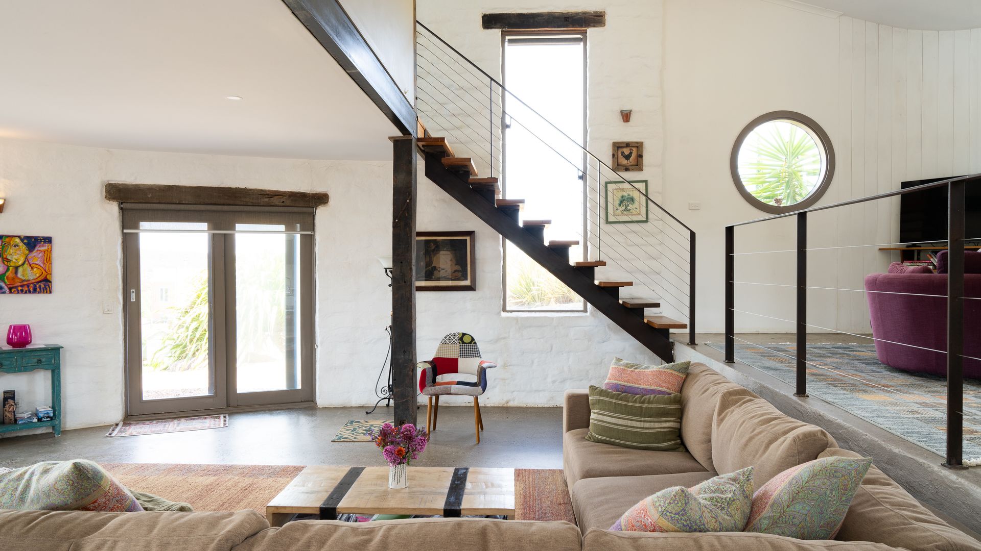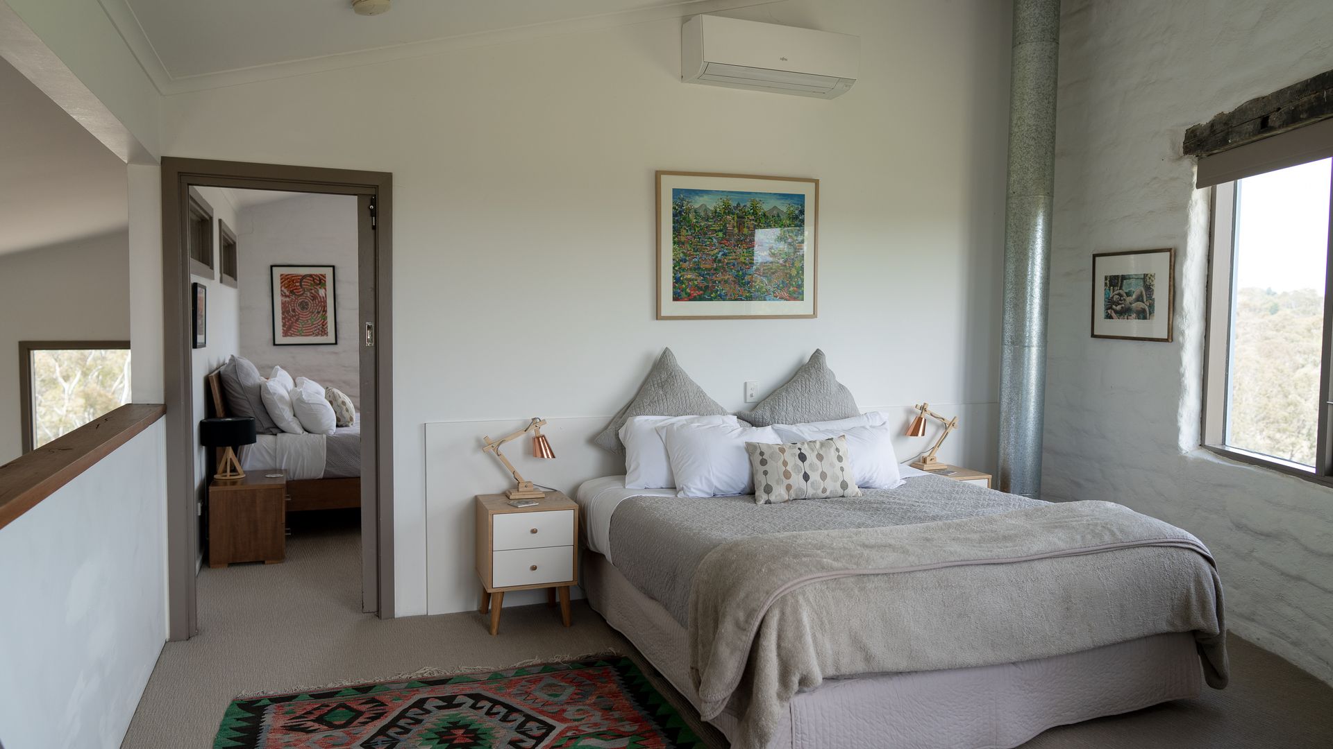Colourful rugs pop against the clean white walls, adorned by lovely artwork. A modern kitchen brings all the comforts of home, with the charming dining table within arm’s reach. The adjoining lounge area offers large, comfy couches and a TV, though many prefer to simply enjoy the sunsets. Stairs lead up to the mezzanine level, where the master bedroom can be found. Both bedrooms offer striking views of the country and welcome the natural light. Like the rest of the home, these rooms are fashionably furnished and beautiful artworks are mounted on the walls. One offers a king bed, and the other a queen. Similarly, the bathroom is appointed with both quality and style and features a walk-in shower.