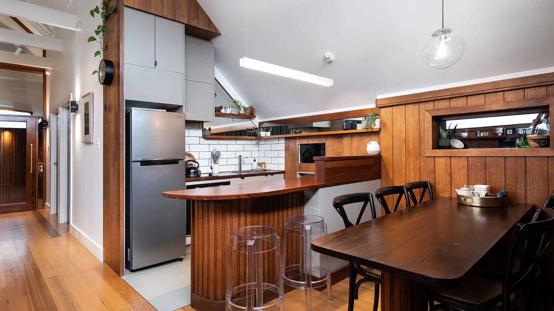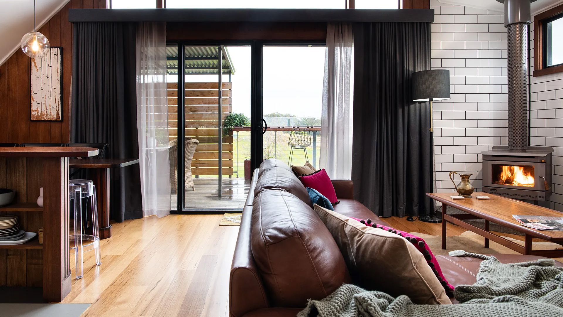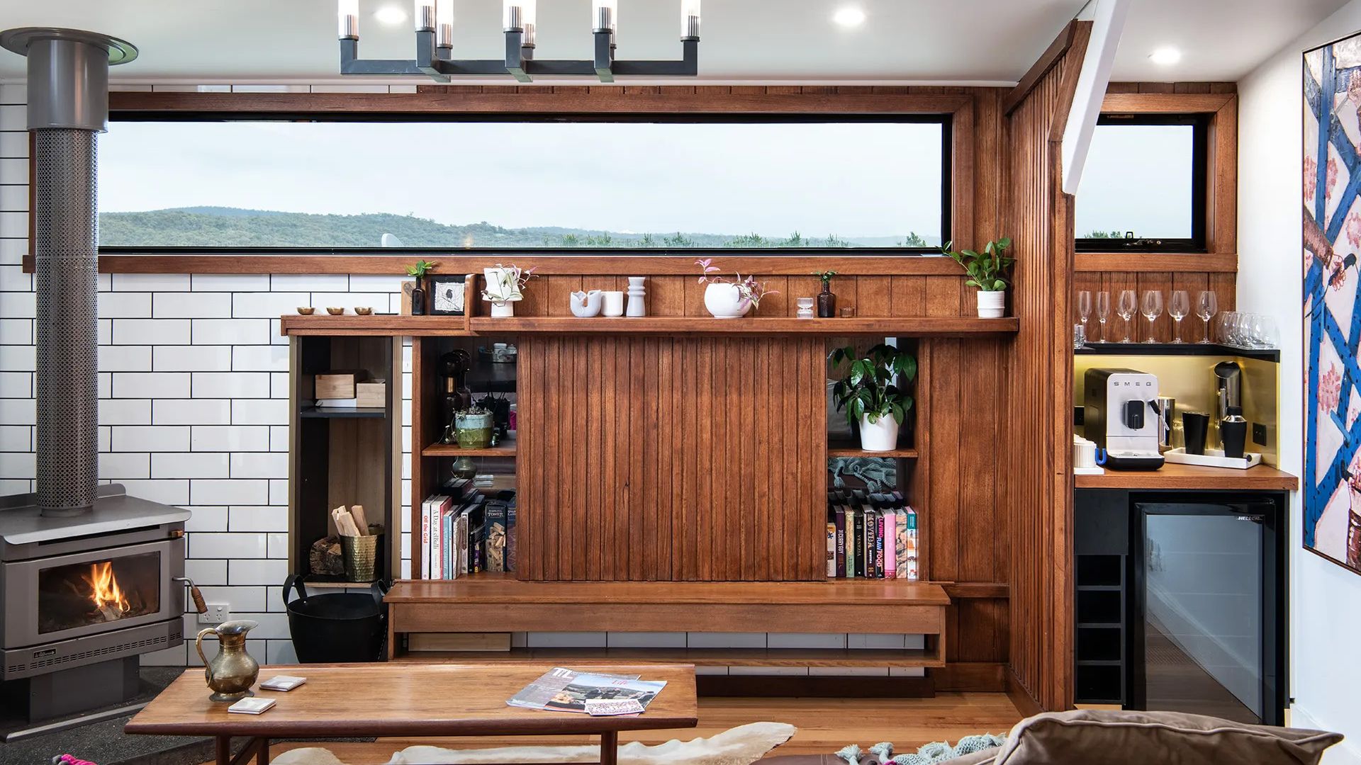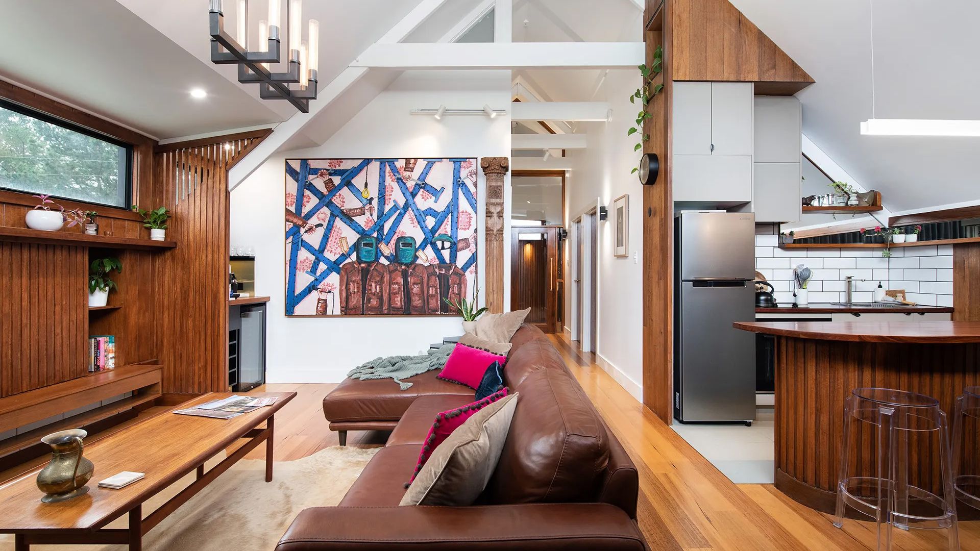 The kitchen seamlessly flows into the lounge area, where a plush leather couch, slow combustion fire, and a dedicated whisky bar and coffee-making station await your enjoyment. Central heating ensures a cozy atmosphere throughout. Original art and photographs adorn the walls, while unique architectural shapes and curves catch the light, creating a visually stunning environment.