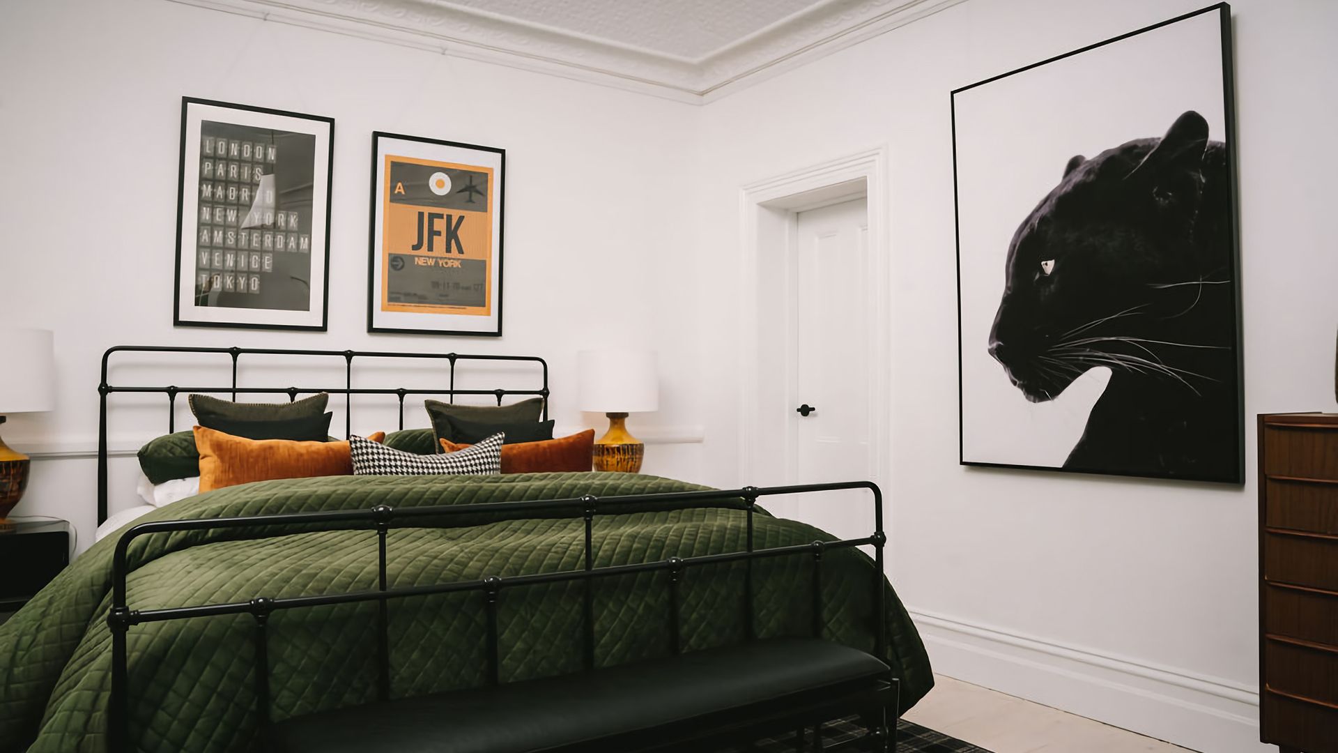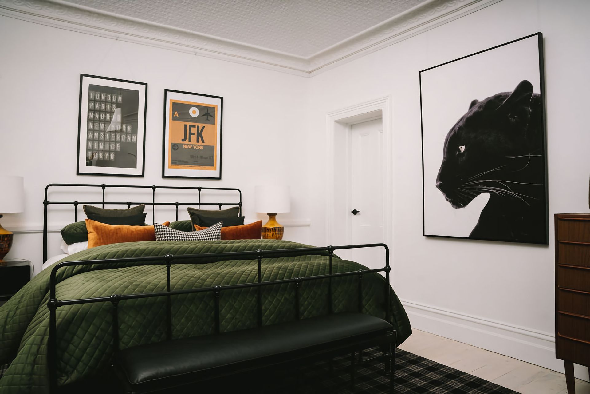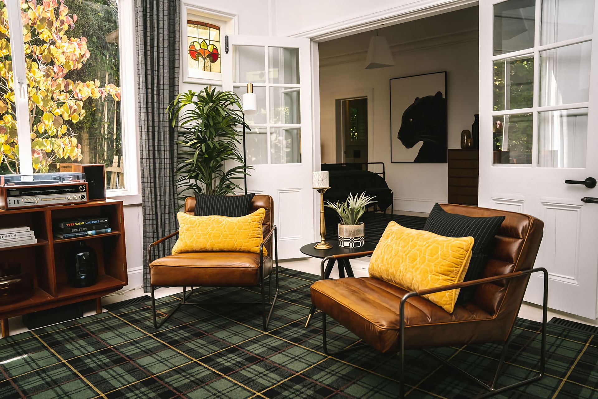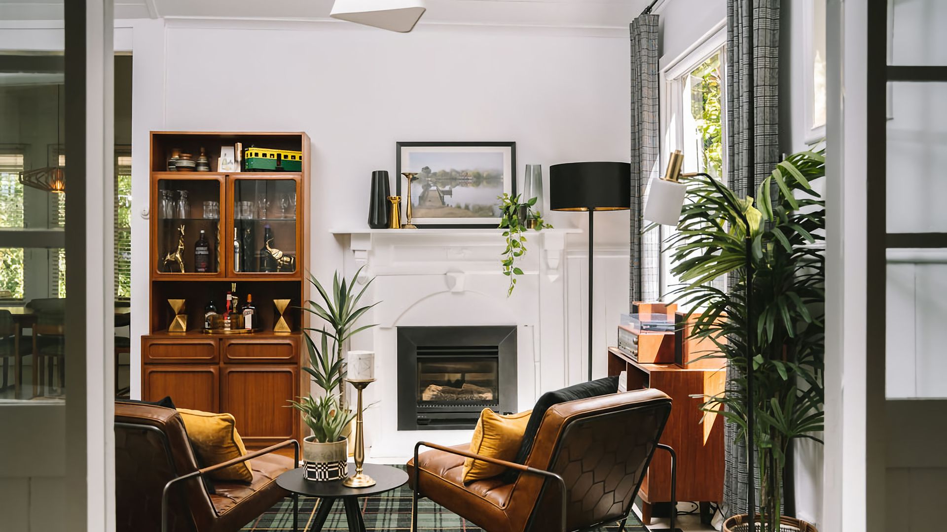 The kitchen and dining rooms share an open plan space complete with a second gas log fireplace which exudes a warm and welcoming ambience. Teak Mid-Century furnishings are a call-back to St. Etienne’s past, while the modern colour palette creates a fresh finishing touch. The kitchen is fitted with a bespoke breakfast bar and high-quality Smeg and Miele appliances, while its windows look out into the property’s vibrant garden.
