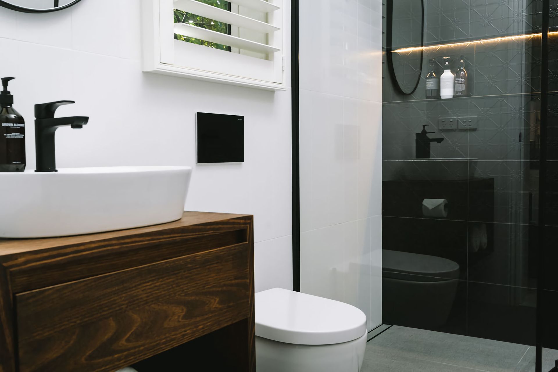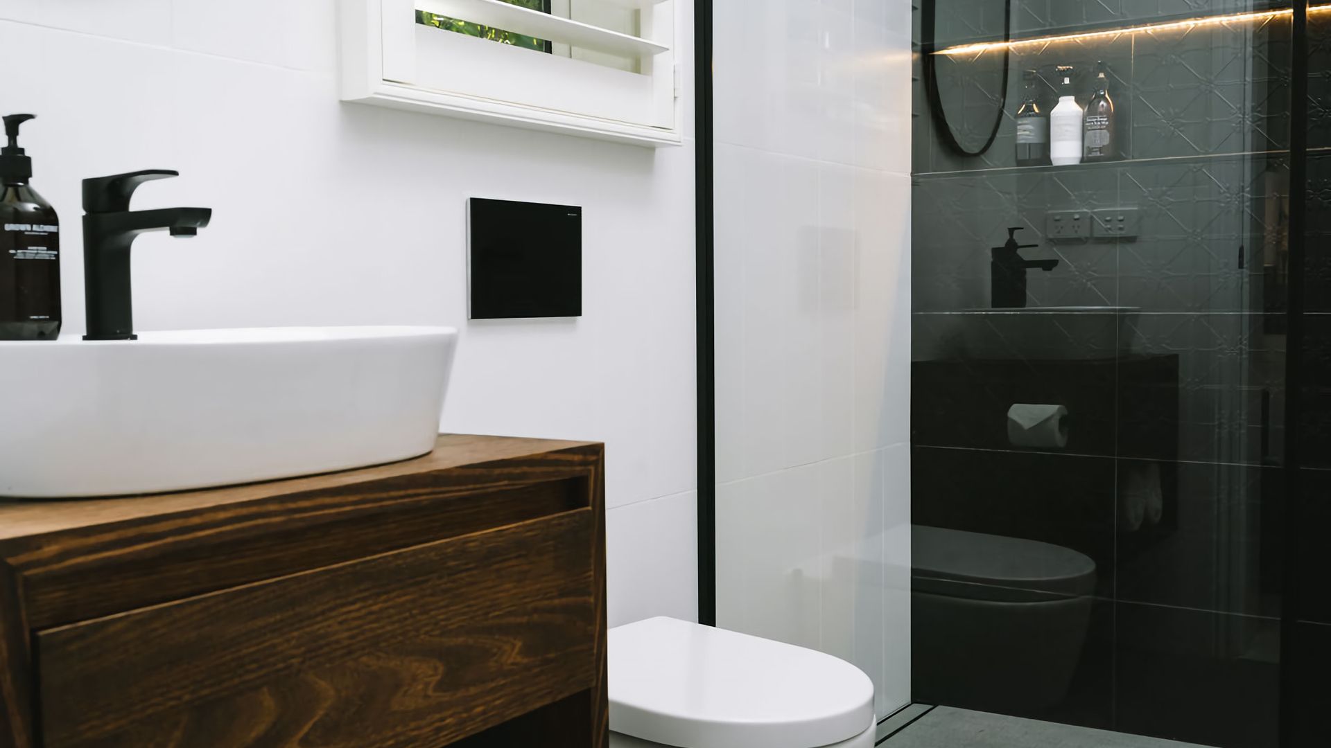 An L-shaped couch hugs the corner facing the TV while on the other side of the lounge, a pair of designer leather chairs face a gas log fireplace, making a perfect nook to relax.