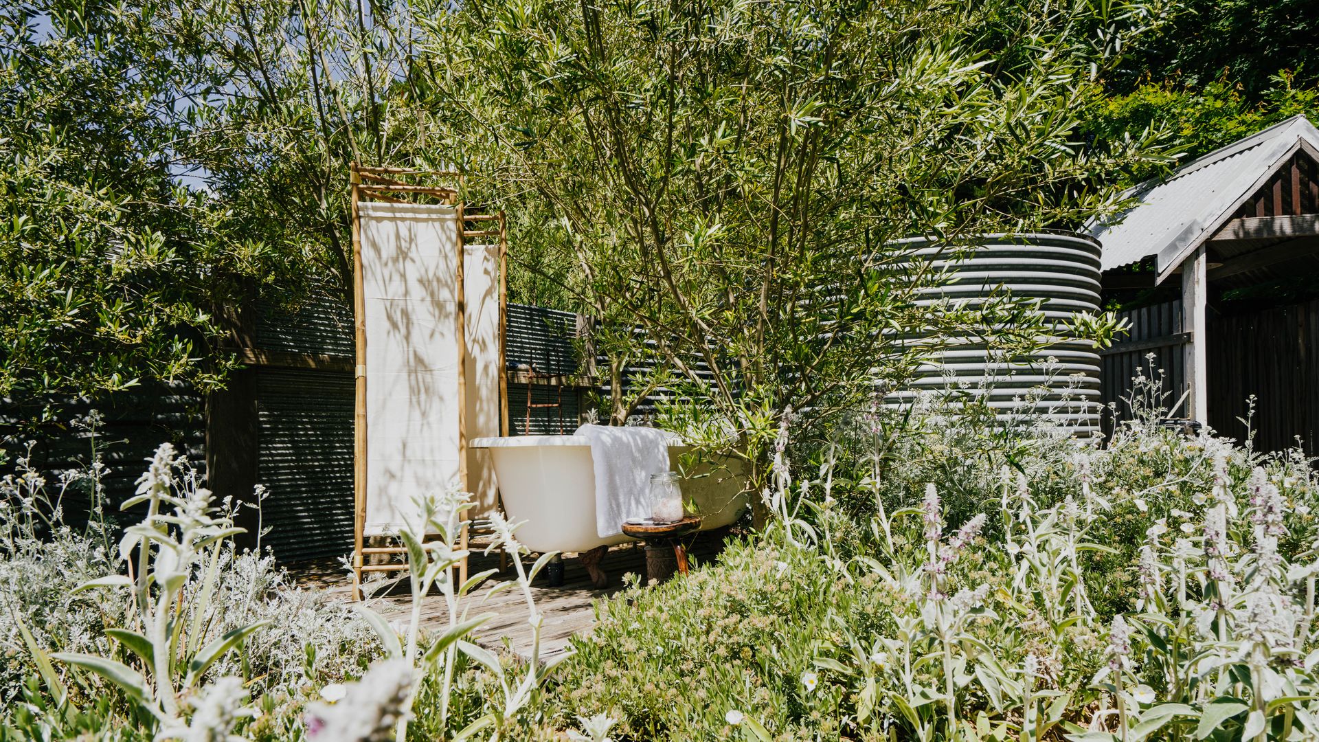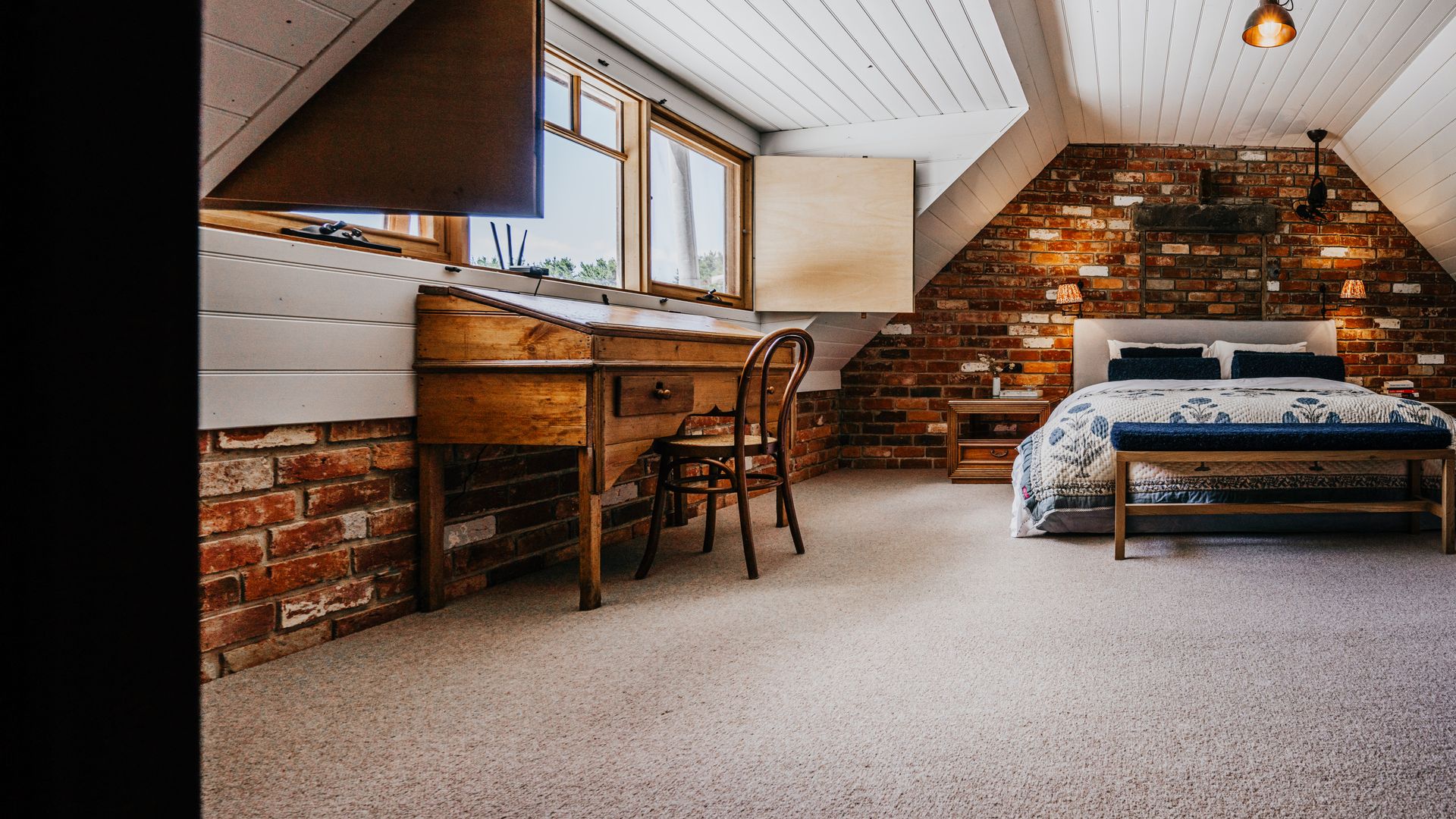 Featuring a cosy lounge with smart TV, a wood-burning fire and a cupboard full of books and games. Decadent Master bedroom with king bed with writing desk overlooking the garden and separate lounge room. Downstairs is a queen bed for the kids or an extra couple. Luxe bathrobes are provided for guests. Bathroom with separate shower & toilet (plus outdoor claw-foot bath & shower with hot water set amongst olive trees), split system heating & a/c for extra comfort, luxury linen, boutique body products.