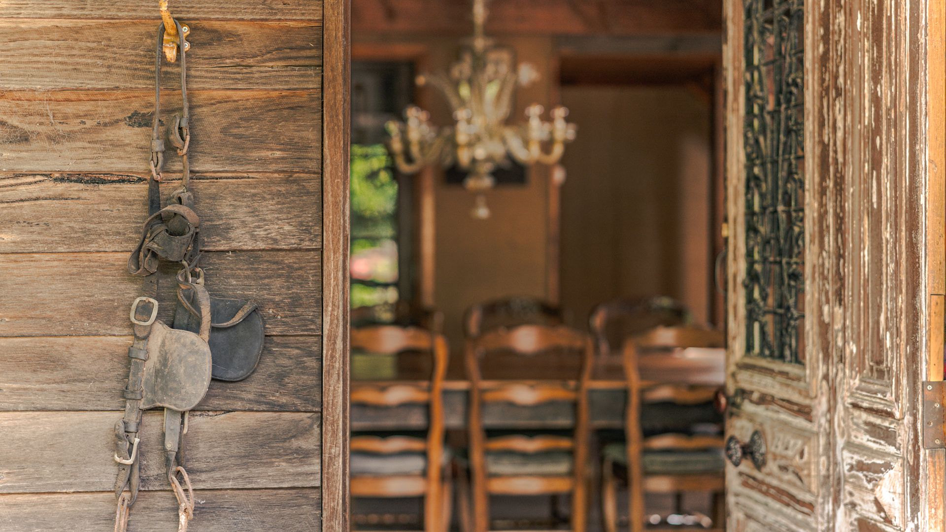 The adjoining kitchen and dining spaces are equally captivating. A handcrafted wooden dining table and wicker chairs create an inviting space to share meals, while the kitchen—equipped with pristine AGA appliances—strikes the perfect balance between heritage charm and modern practicality. Cloth hangings in place of traditional cabinet doors lend a nostalgic touch, and the layout ensures ease for both casual cooks and passionate foodies.