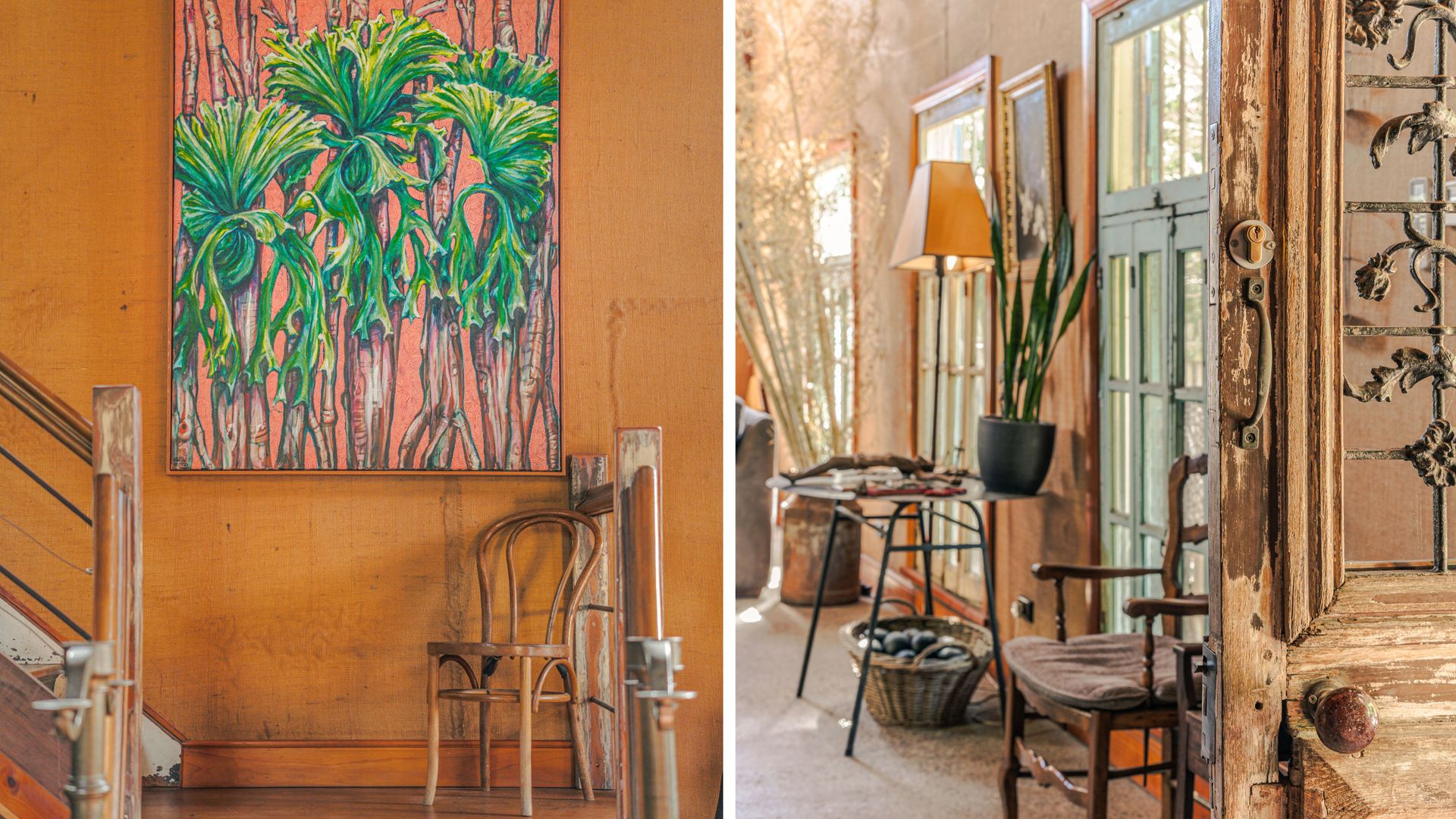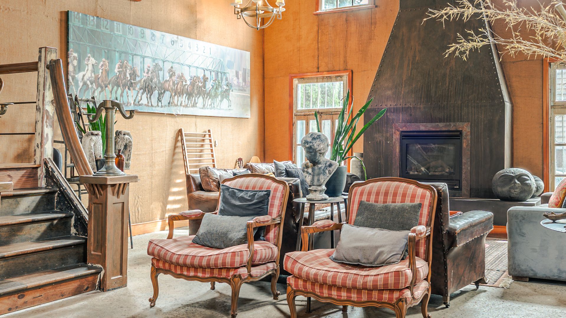 The unassuming weatherboard exterior conceals a thoughtfully curated interior, brimming with character. High ceilings adorned with polished wood create a sense of rustic grandeur, while the open-plan living and dining area invites slow mornings and cosy evenings. A substantial gas log fire adds warmth and comfort, complemented by plush leather couches, rustic timber pieces, and an eclectic collection of art and sculpture.