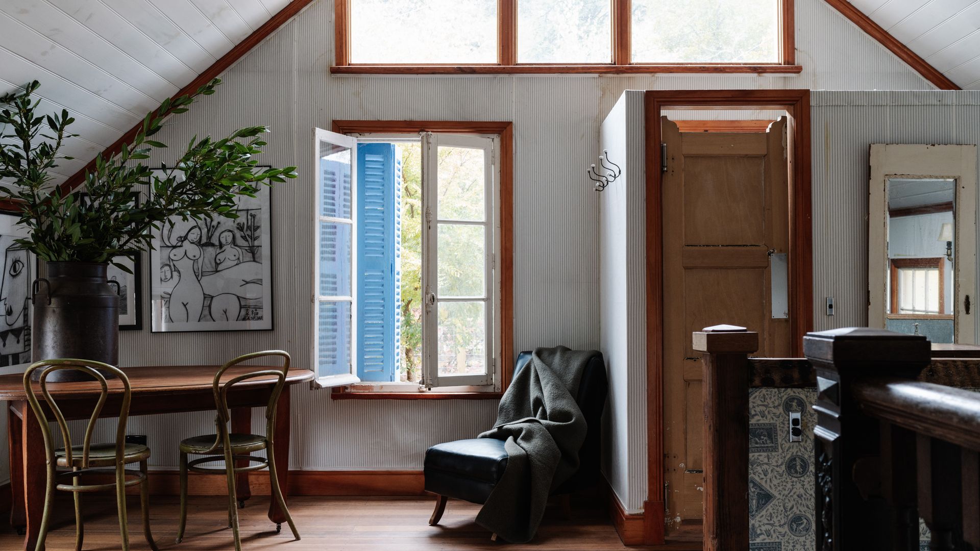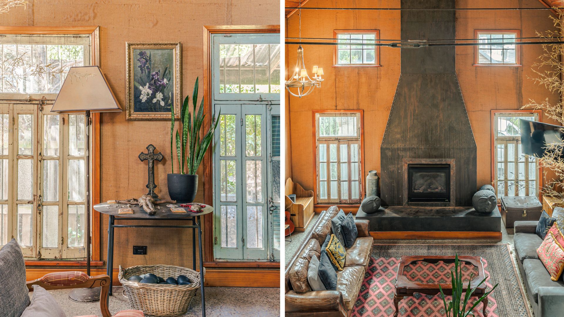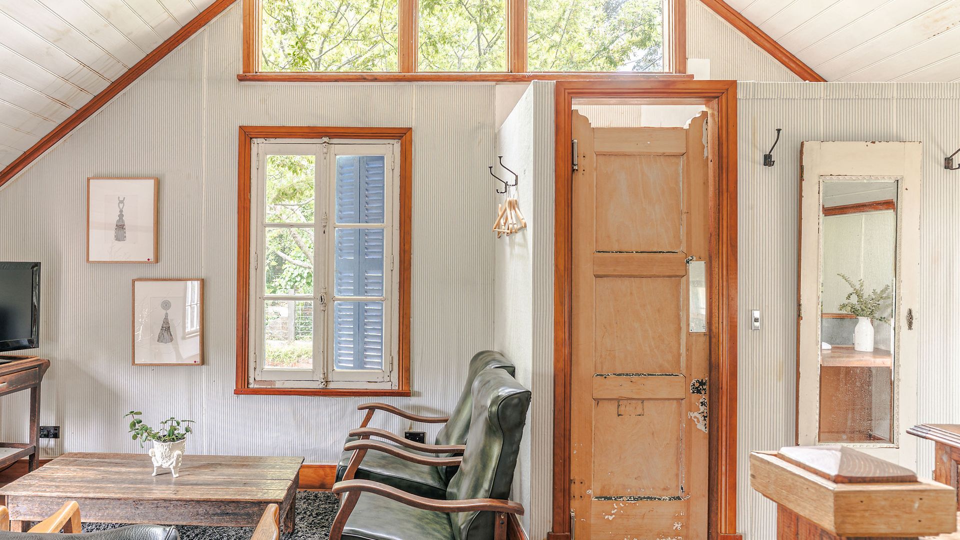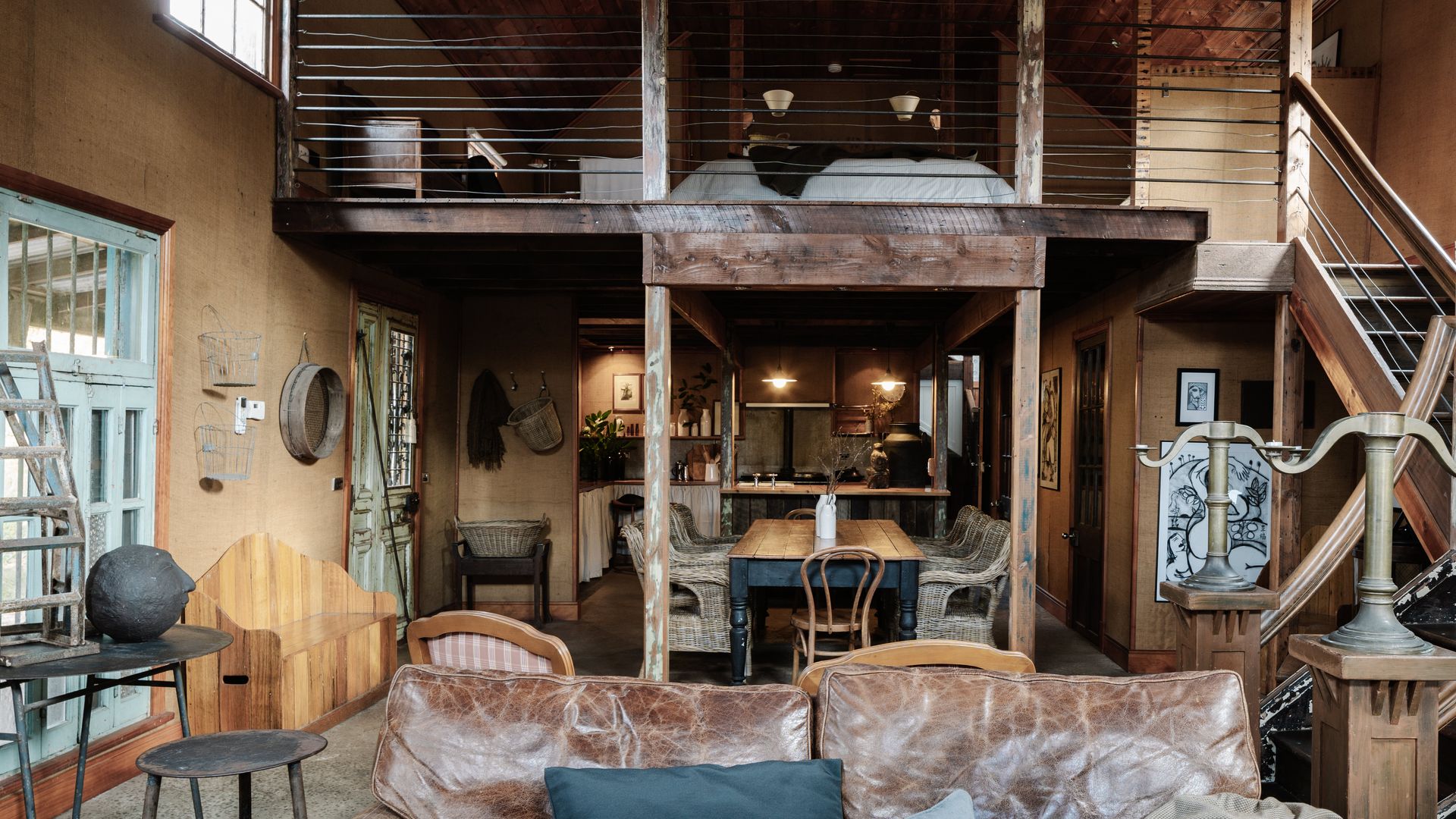 The unassuming weatherboard exterior conceals a thoughtfully curated interior, brimming with character. High ceilings adorned with polished wood create a sense of rustic grandeur, while the open-plan living and dining area invites slow mornings and cosy evenings. A substantial gas log fire adds warmth and comfort, complemented by plush leather couches, rustic timber pieces, and an eclectic collection of art and sculpture.