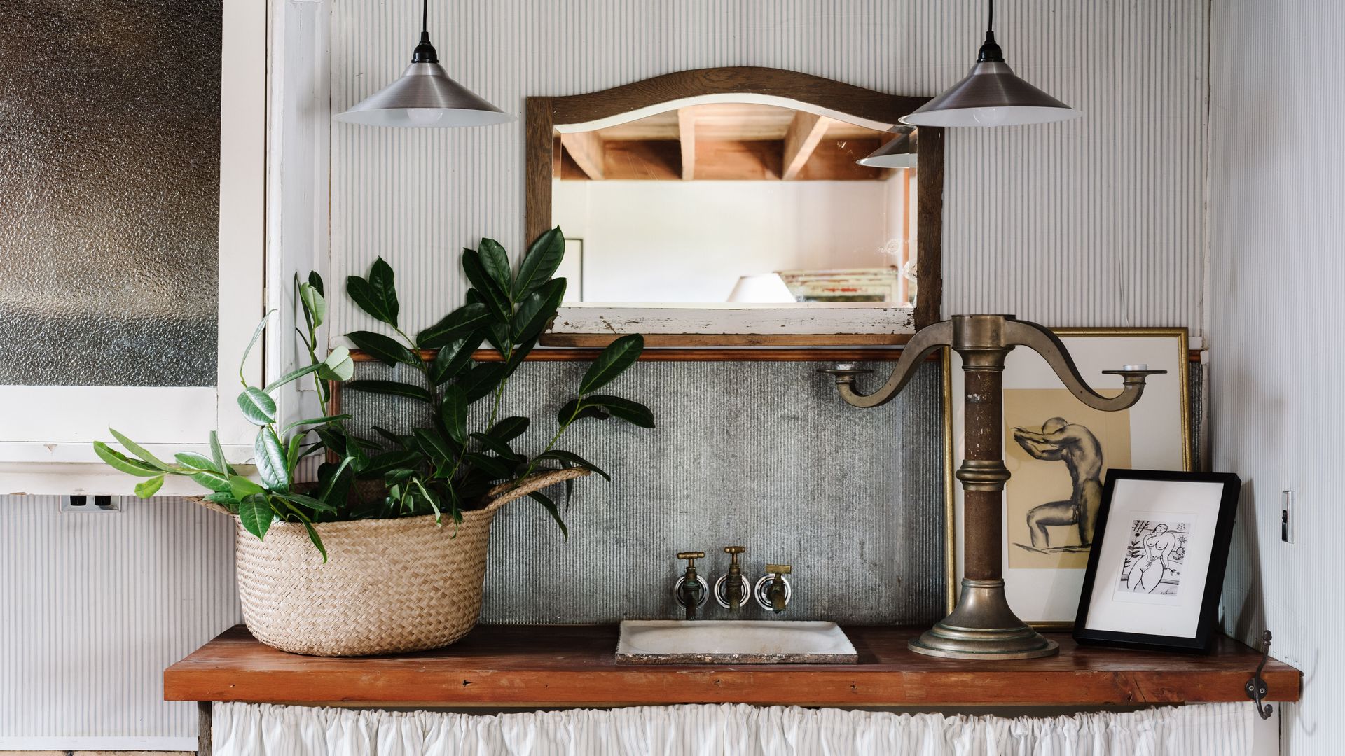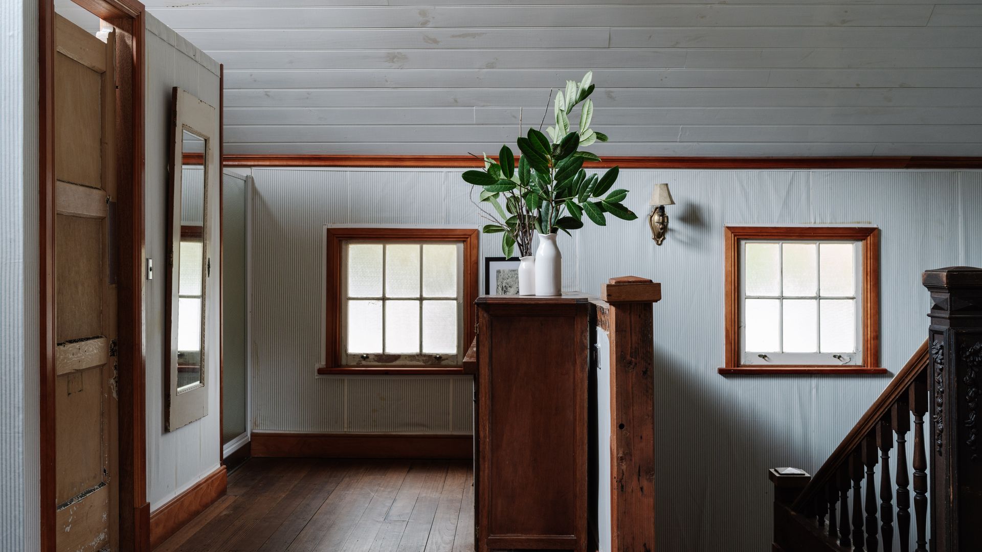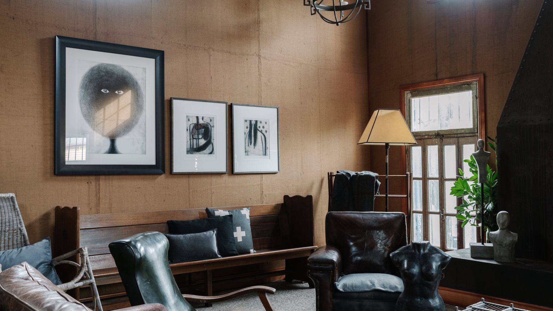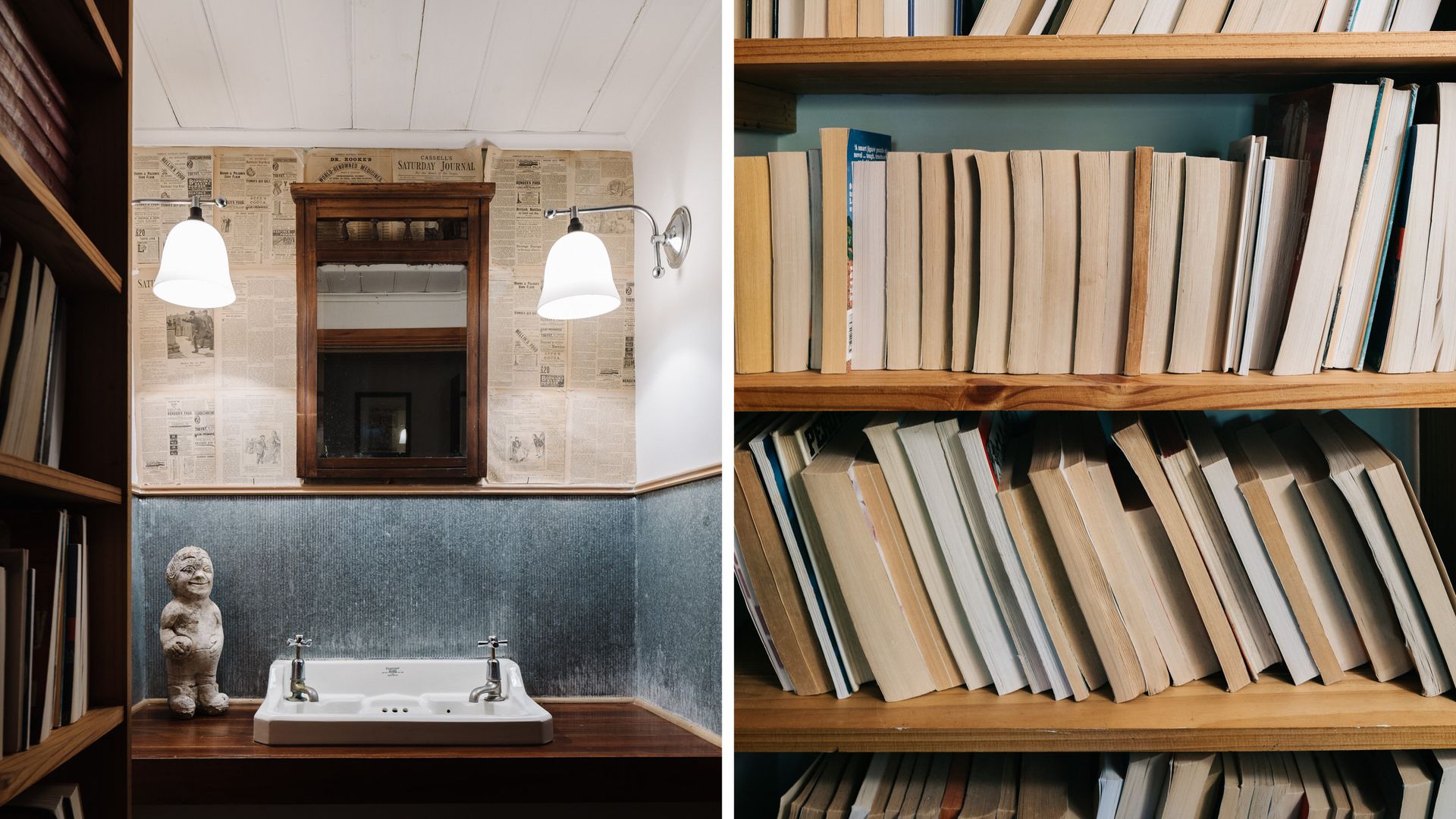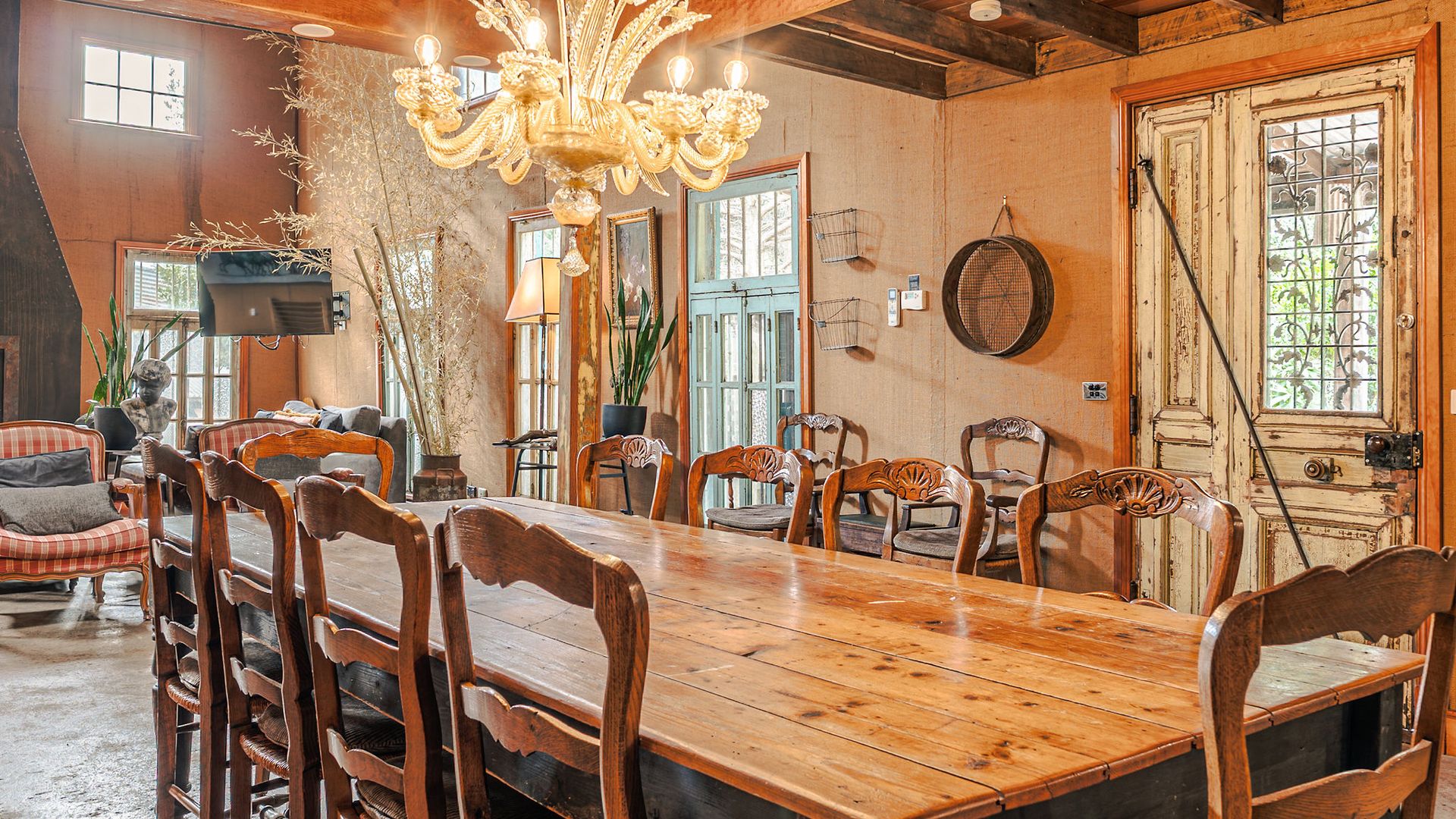 The unassuming weatherboard exterior conceals a thoughtfully curated interior, brimming with character. High ceilings adorned with polished wood create a sense of rustic grandeur, while the open-plan living and dining area invites slow mornings and cosy evenings. A substantial gas log fire adds warmth and comfort, complemented by plush leather couches, rustic timber pieces, and an eclectic collection of art and sculpture.