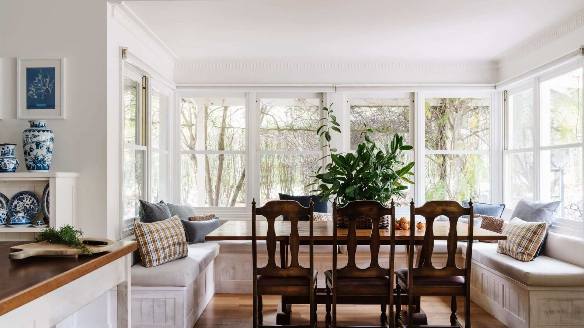 Adjacent to the living room is the kitchen and dining area, similarly filled with natural light. This full kitchen is equipped with high-quality appliances, ensuring you have everything needed to prepare meals for your fellow guests. The dining area is nestled in a spacious nook, surrounded on three sides by windows that offer captivating views of the garden just outside.