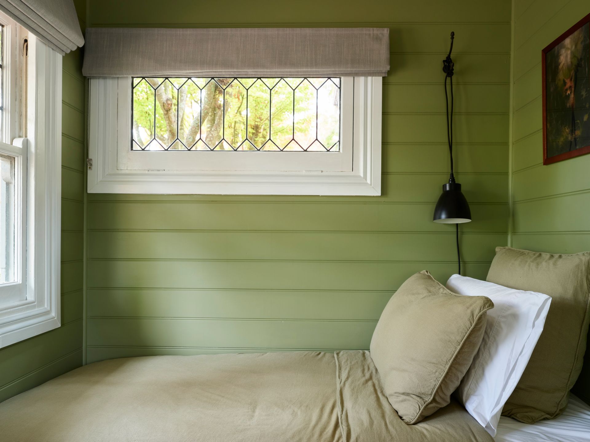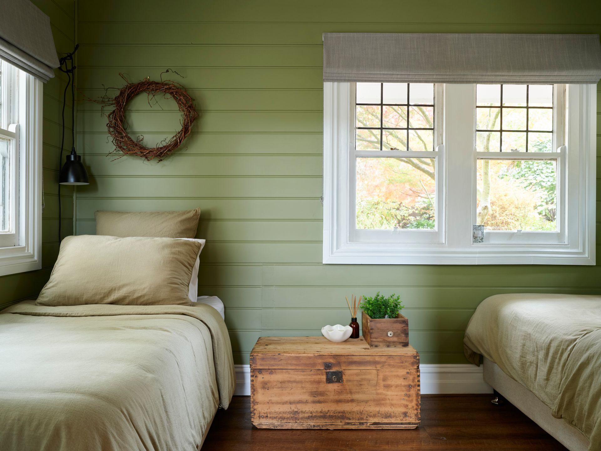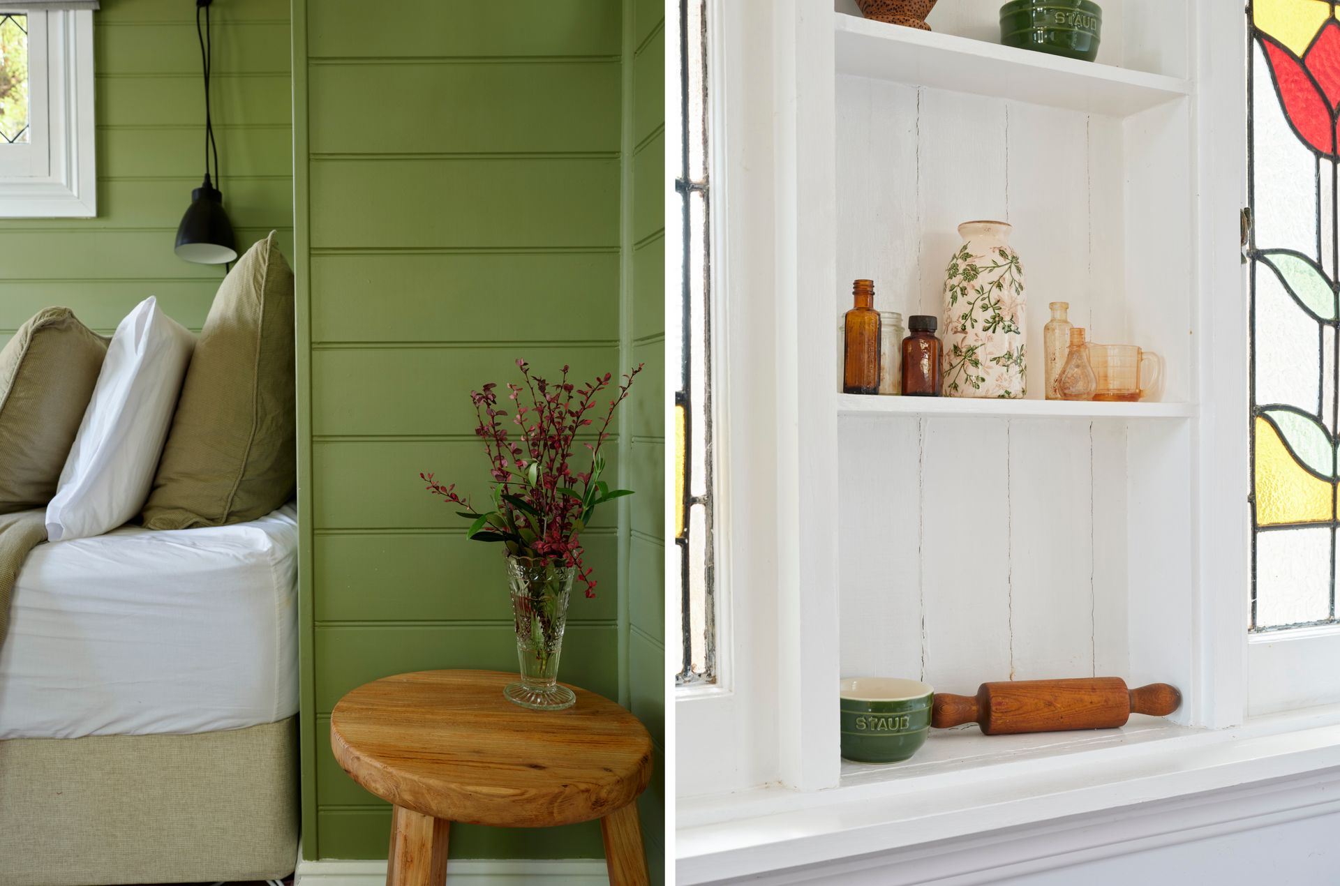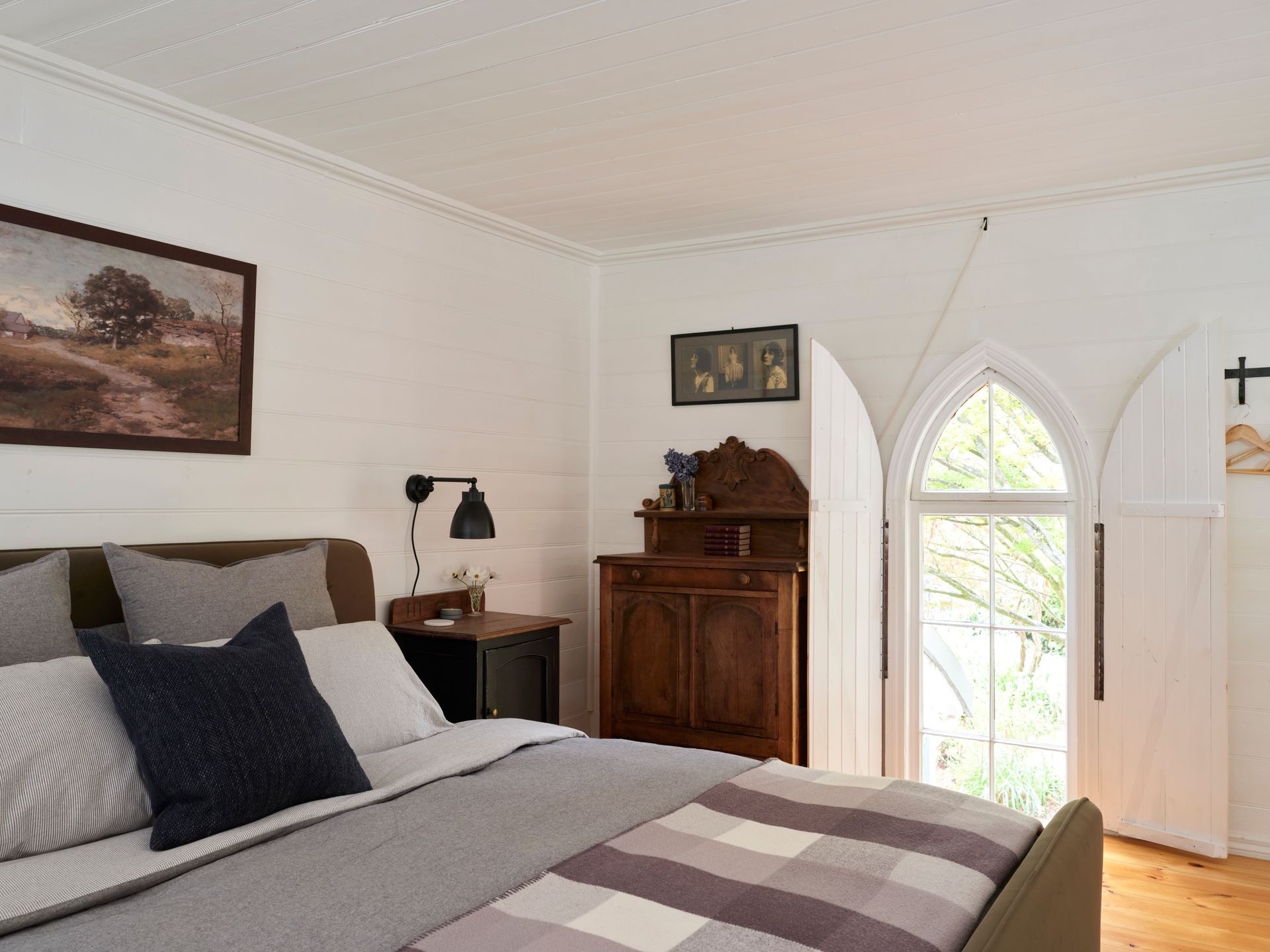 Inside, soaring panelled ceilings, original timber windows, and crisp white walls set the tone. Find your perfect cozy escape, no matter the season. Sink into the oversized armchair with a good book or unwind by the crackling fire from the comfort of the leather lounge suite. The loft-style master bedroom overlooks the lounge, providing a peaceful sanctuary with serene garden views. . Downstairs, a second bedroom features two singles in a striking, verdant green—inviting relaxation and calm.