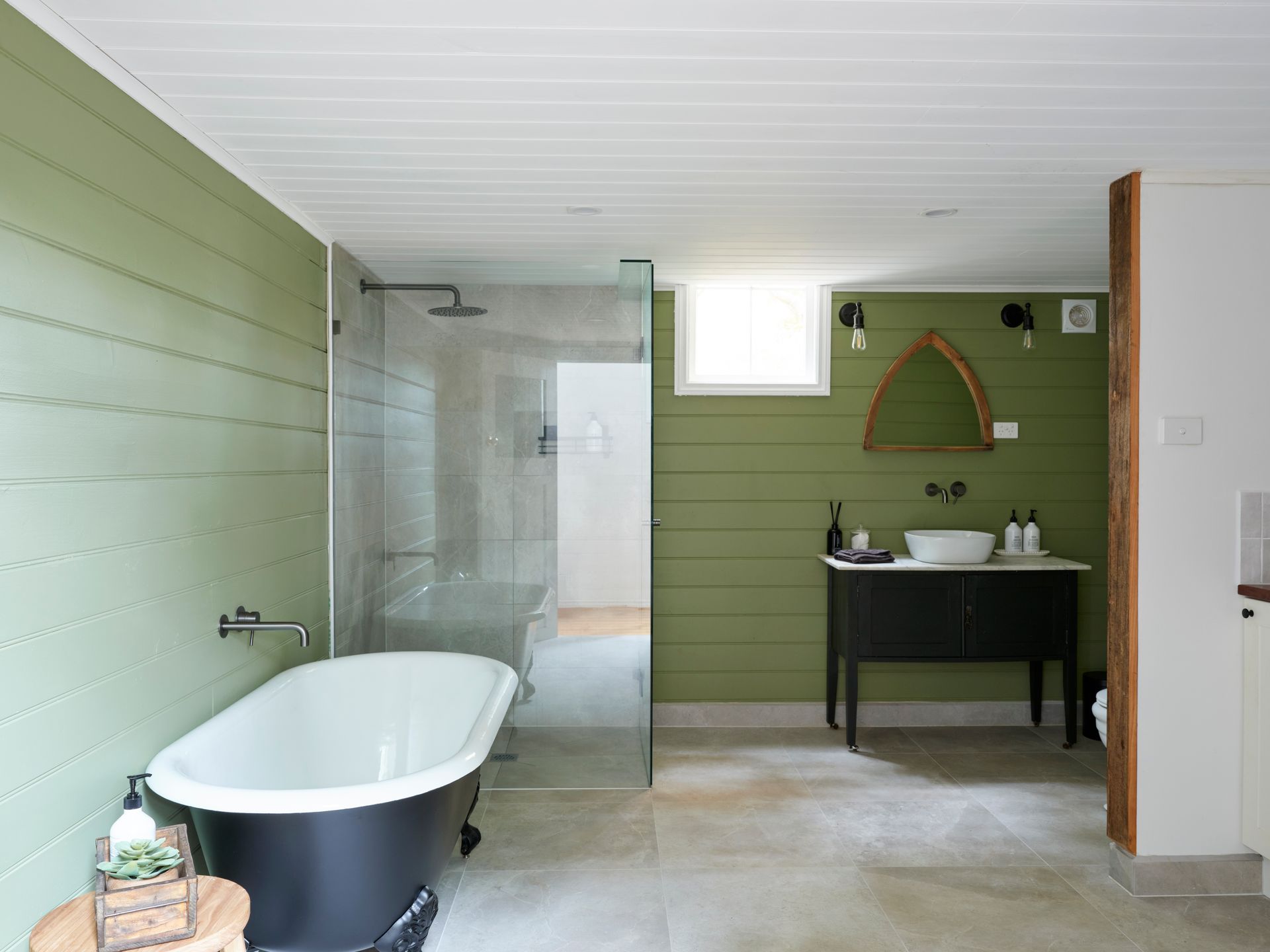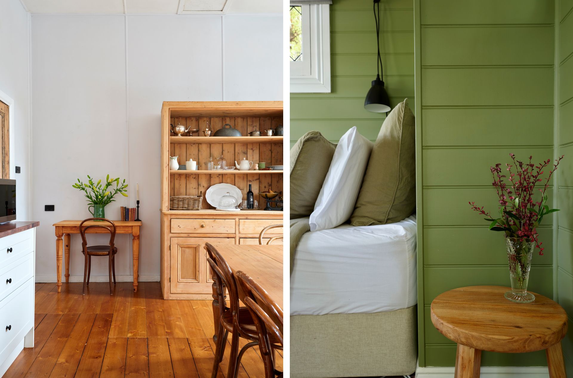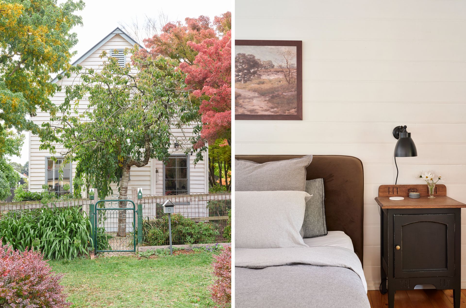 Inside, soaring panelled ceilings, original timber windows, and crisp white walls set the tone. Find your perfect cozy escape, no matter the season. Sink into the oversized armchair with a good book or unwind by the crackling fire from the comfort of the leather lounge suite. The loft-style master bedroom overlooks the lounge, providing a peaceful sanctuary with serene garden views. . Downstairs, a second bedroom features two singles in a striking, verdant green—inviting relaxation and calm.