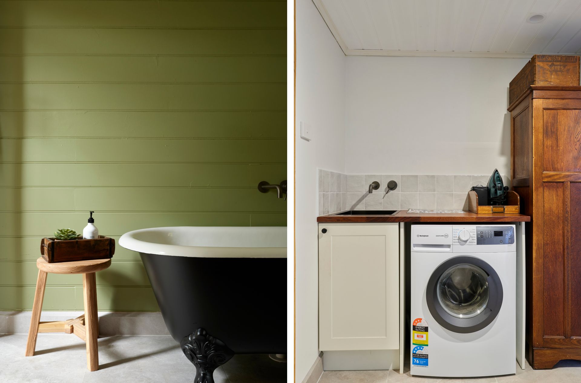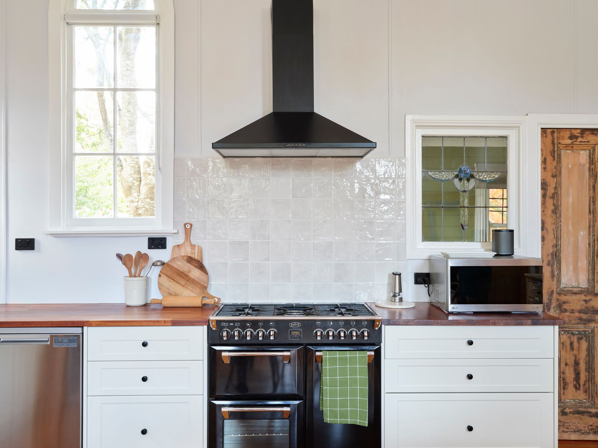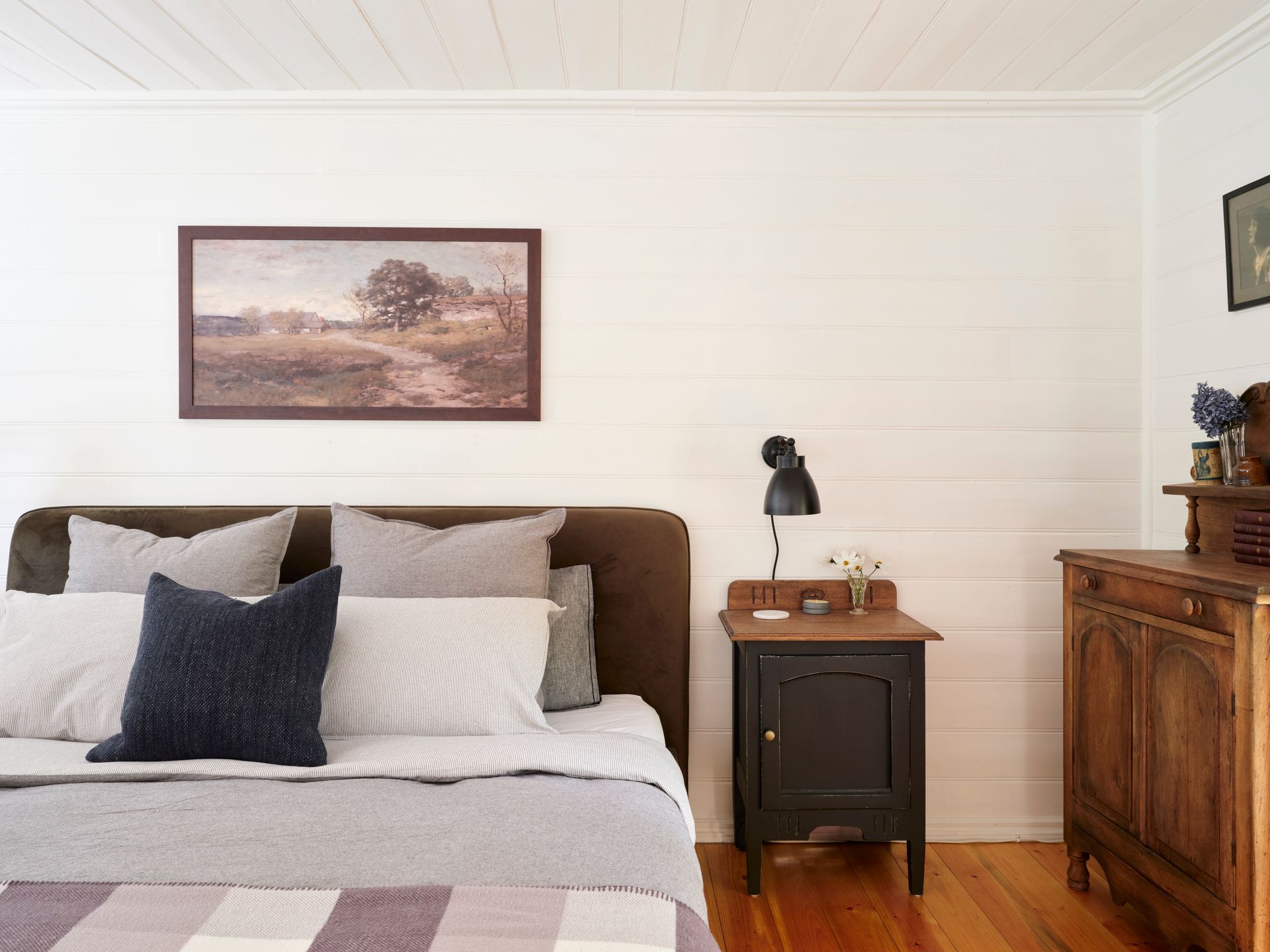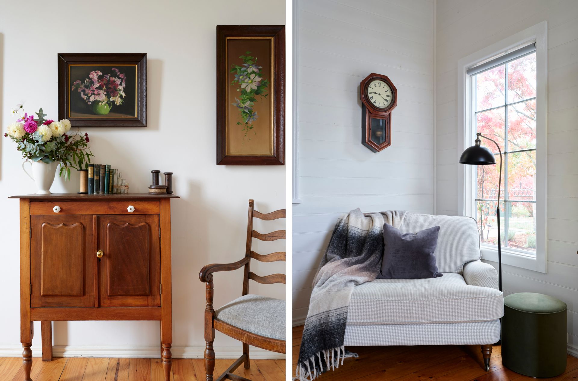 Inside, soaring panelled ceilings, original timber windows, and crisp white walls set the tone. Find your perfect cozy escape, no matter the season. Sink into the oversized armchair with a good book or unwind by the crackling fire from the comfort of the leather lounge suite. The loft-style master bedroom overlooks the lounge, providing a peaceful sanctuary with serene garden views. . Downstairs, a second bedroom features two singles in a striking, verdant green—inviting relaxation and calm.