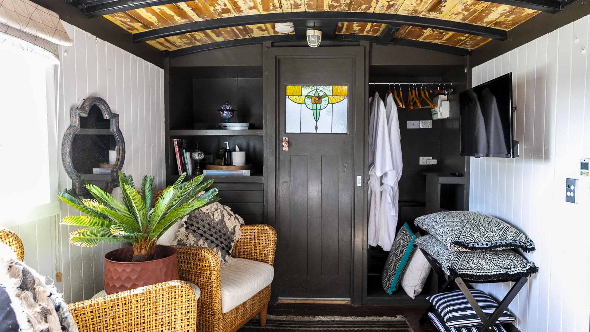 The Train bears rustic signs of its past life as an authentic railway carriage, from the concave ceiling to the instantly recognisable shape of the front door. In addition to the carriage itself, guests will find a small area covered by a verandah outside, as well as a patio with seating arrangements.