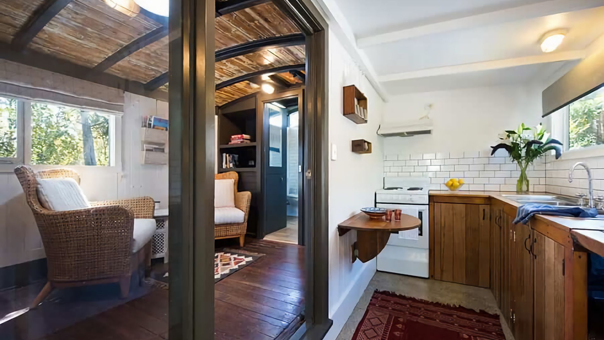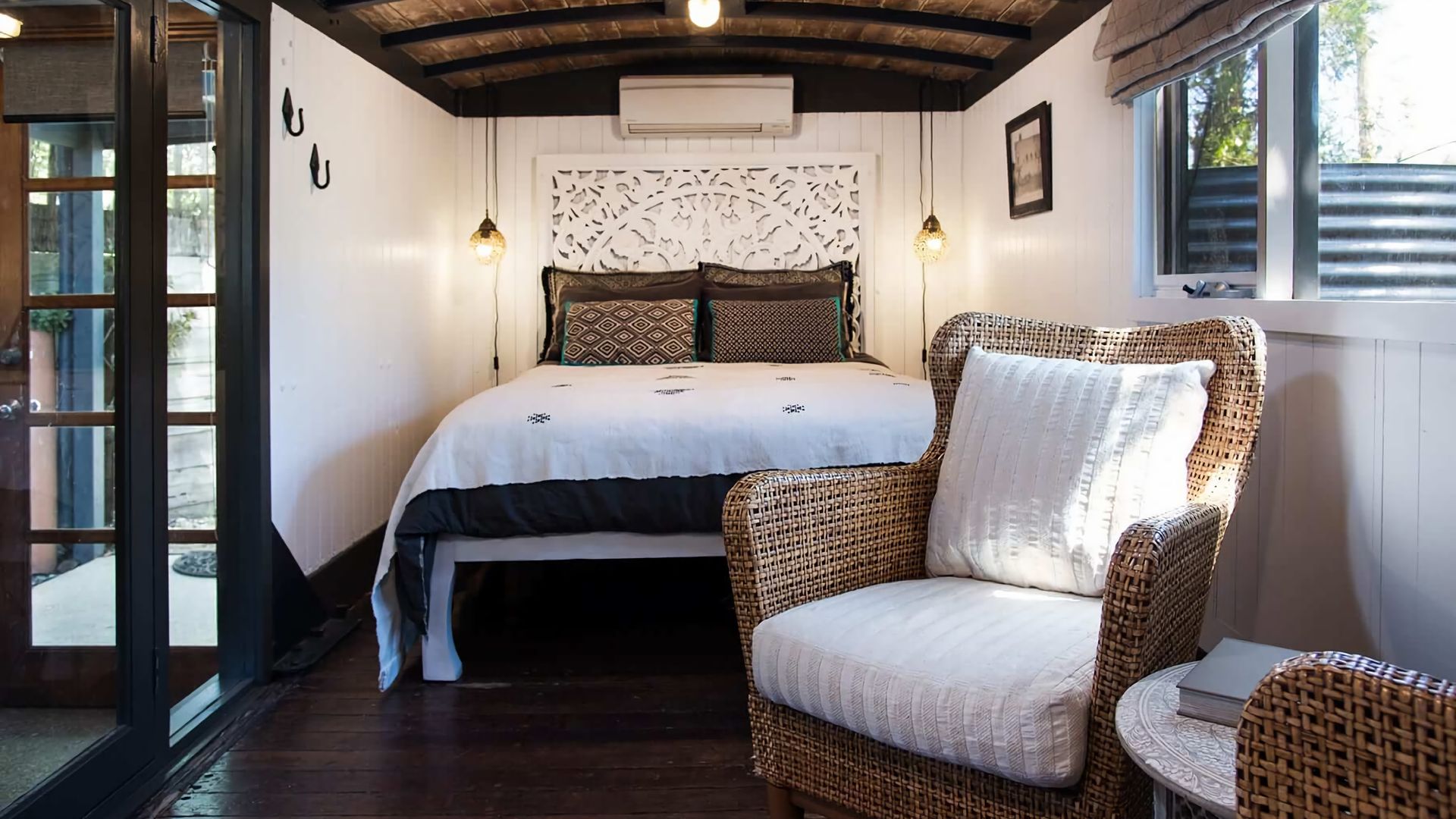 The home’s full kitchen is illuminated by natural light. It has the basic, high quality appliances guests will need and is easy on the eyes with its homely wooden cabinets and striking white tile splash-back. Fully insulated with split system heating and cooling, The Train will keep guests comfortable in whatever weather.